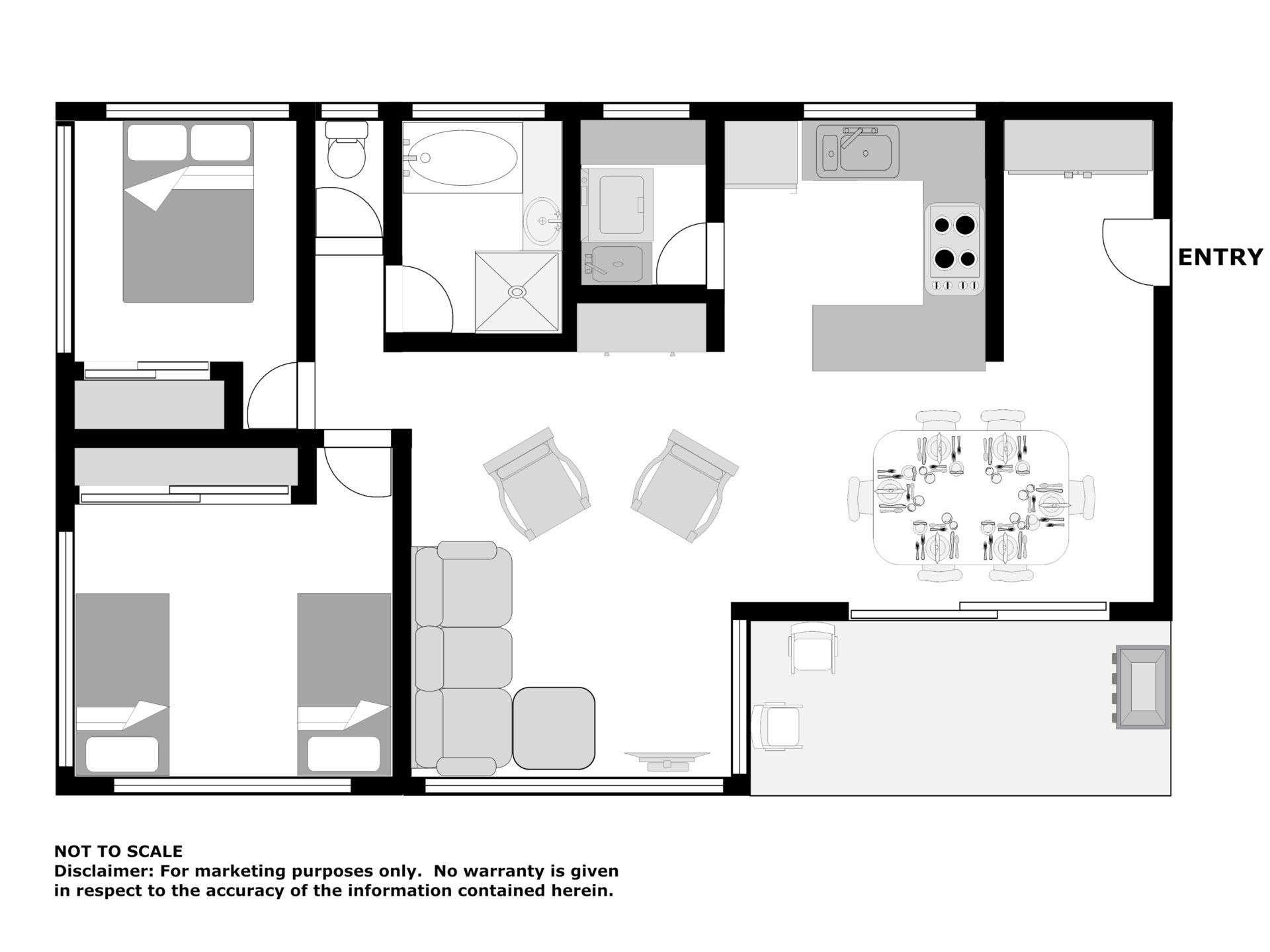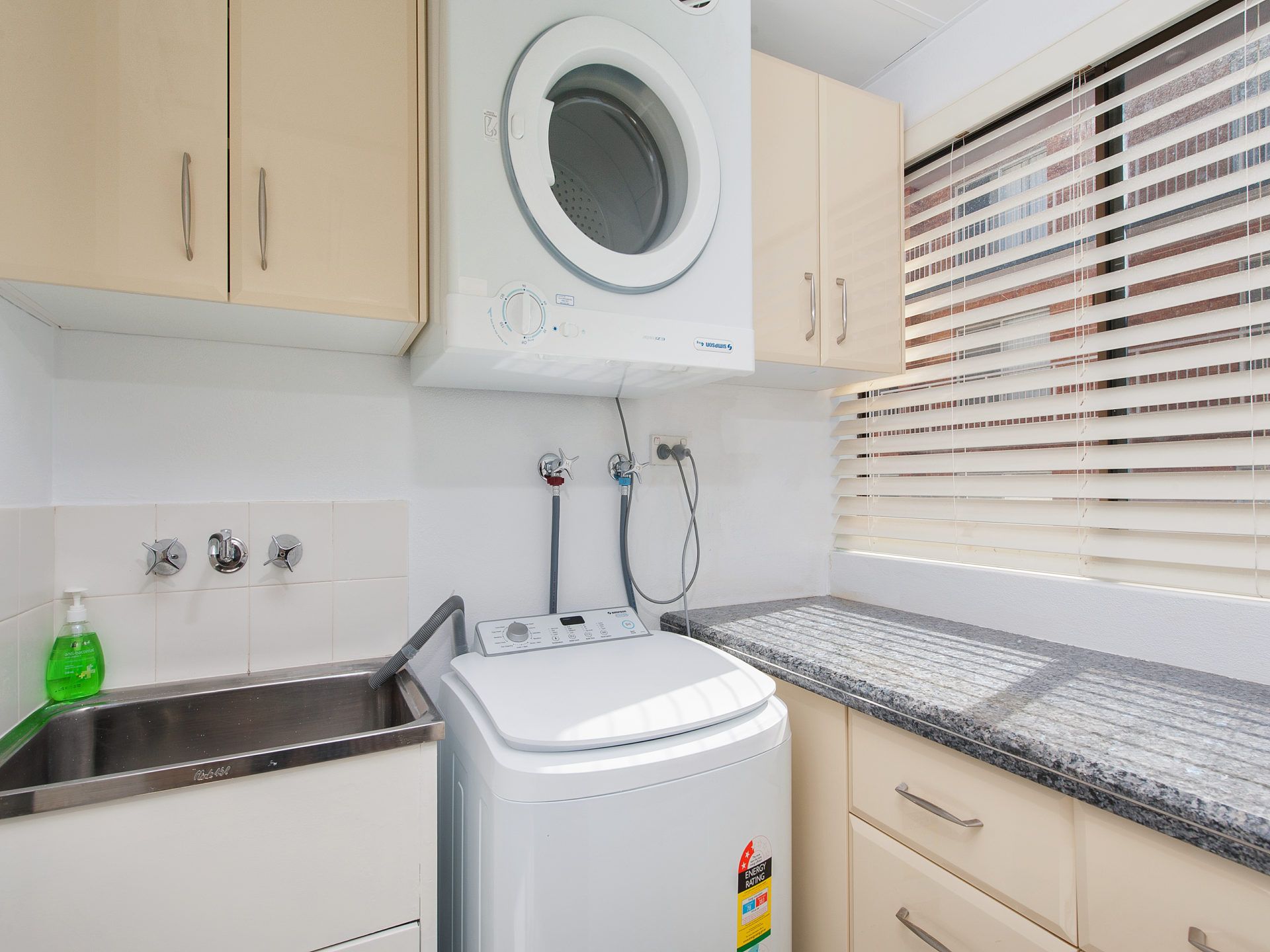 The unit offers 2 carpeted bedrooms with ceiling fans, the main with a queen bed and the 2nd bedroom offering 2 single beds and a trundle. The bathroom is fitted with both a shower and a bath, and the spacious laundry features both a washing machine and a dryer.