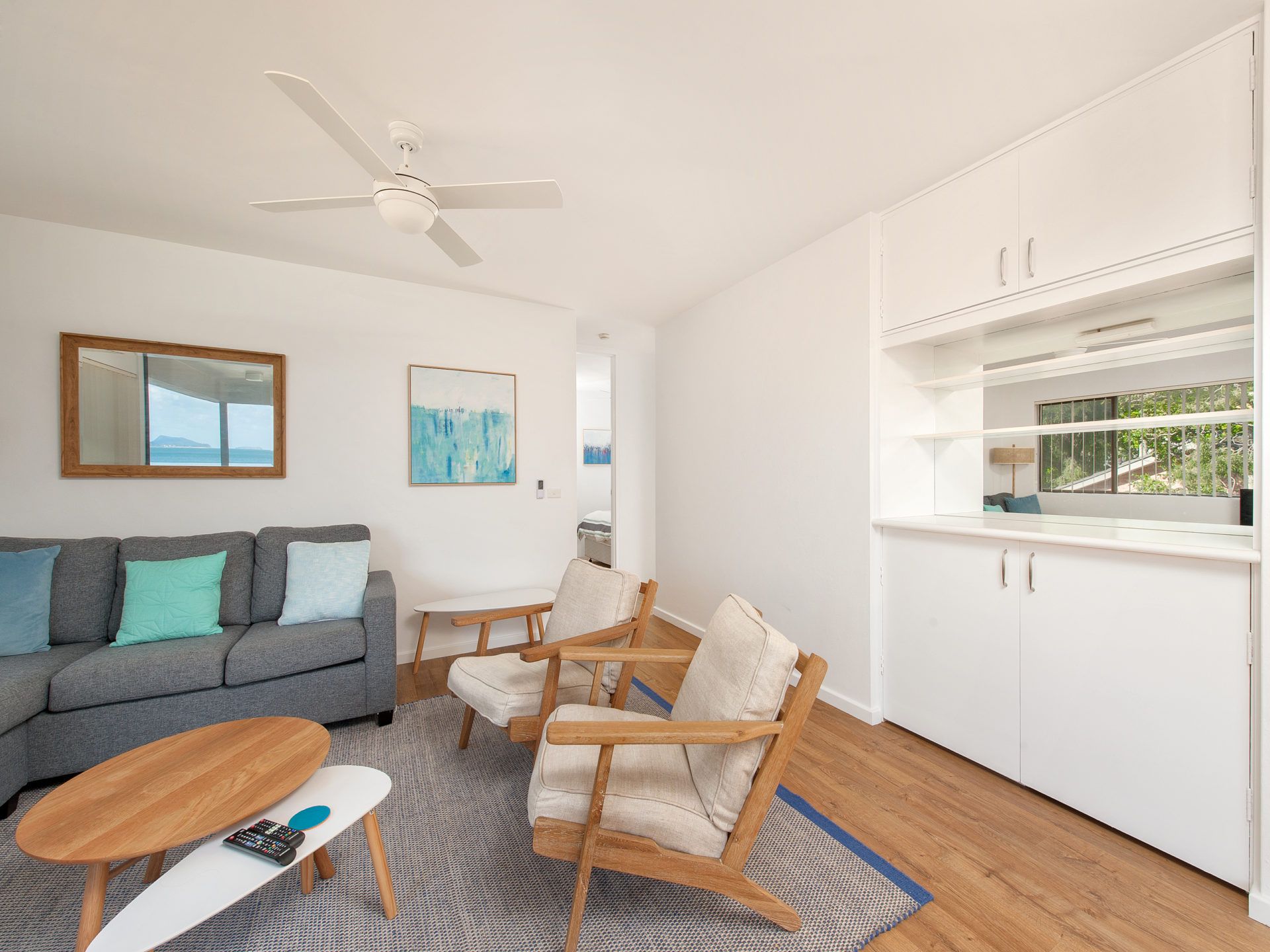 This lovely, fresh and welcoming unit offers a cosy open living area consisting of a dining area, lounge area with ceiling fan and flat screen TV and a well equipped kitchen including a dishwasher. The dining area leads out to an undercover balcony that overlooks both the pool and the beautiful waters of the bay – cook a casual dinner on the gas BBQ and sit on the outdoor furniture to dine alfresco in the fresh ocean breeze.