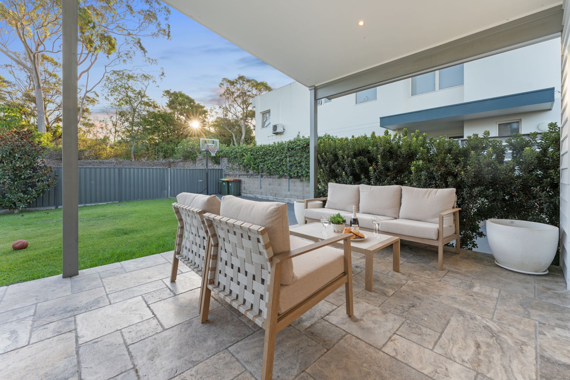 Outside, the large backyard provides plenty of room to enjoy the fresh air. A basketball hoop adds a fun feature for families, while the generous outdoor space makes it easy for children to play or for guests to relax between outings.