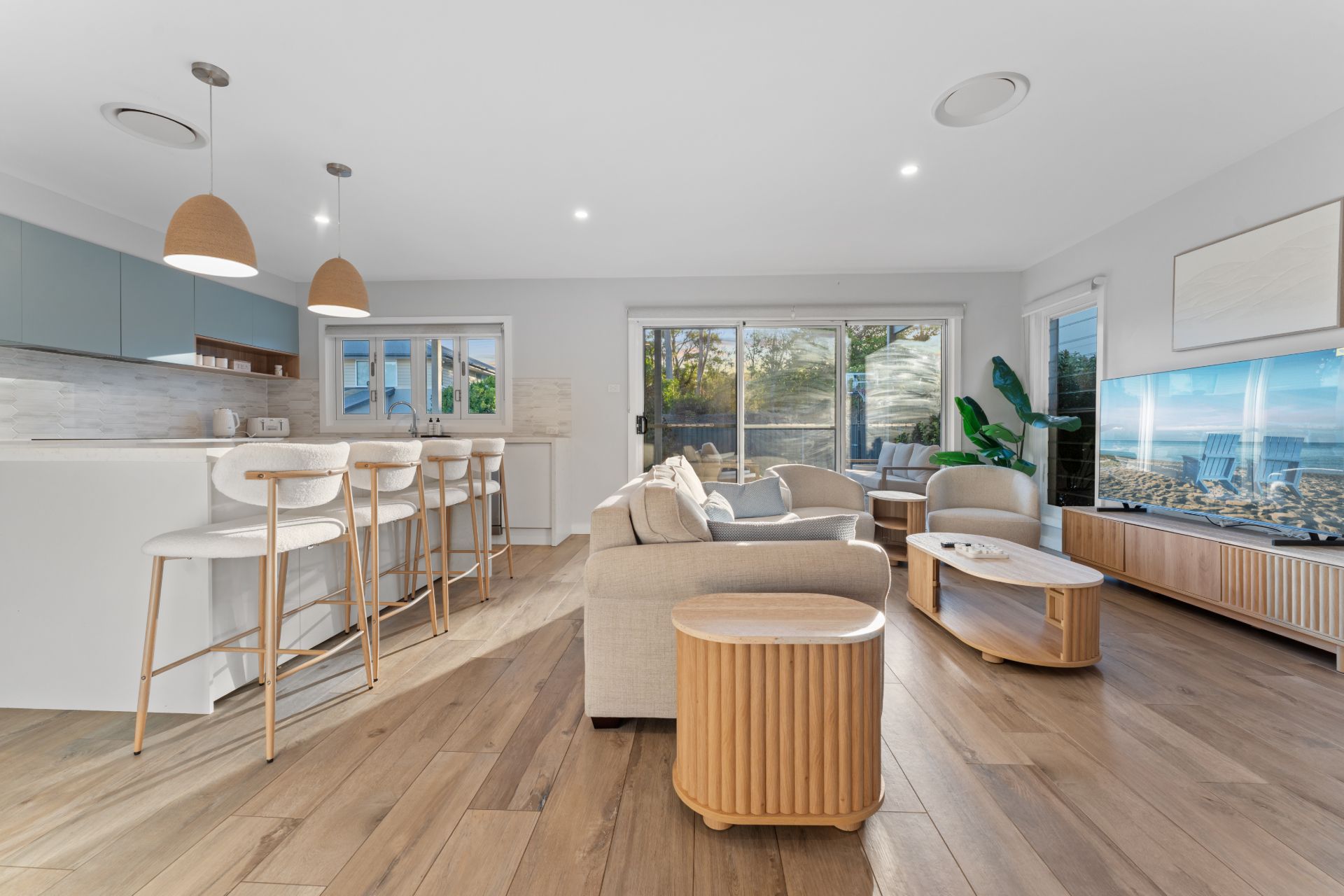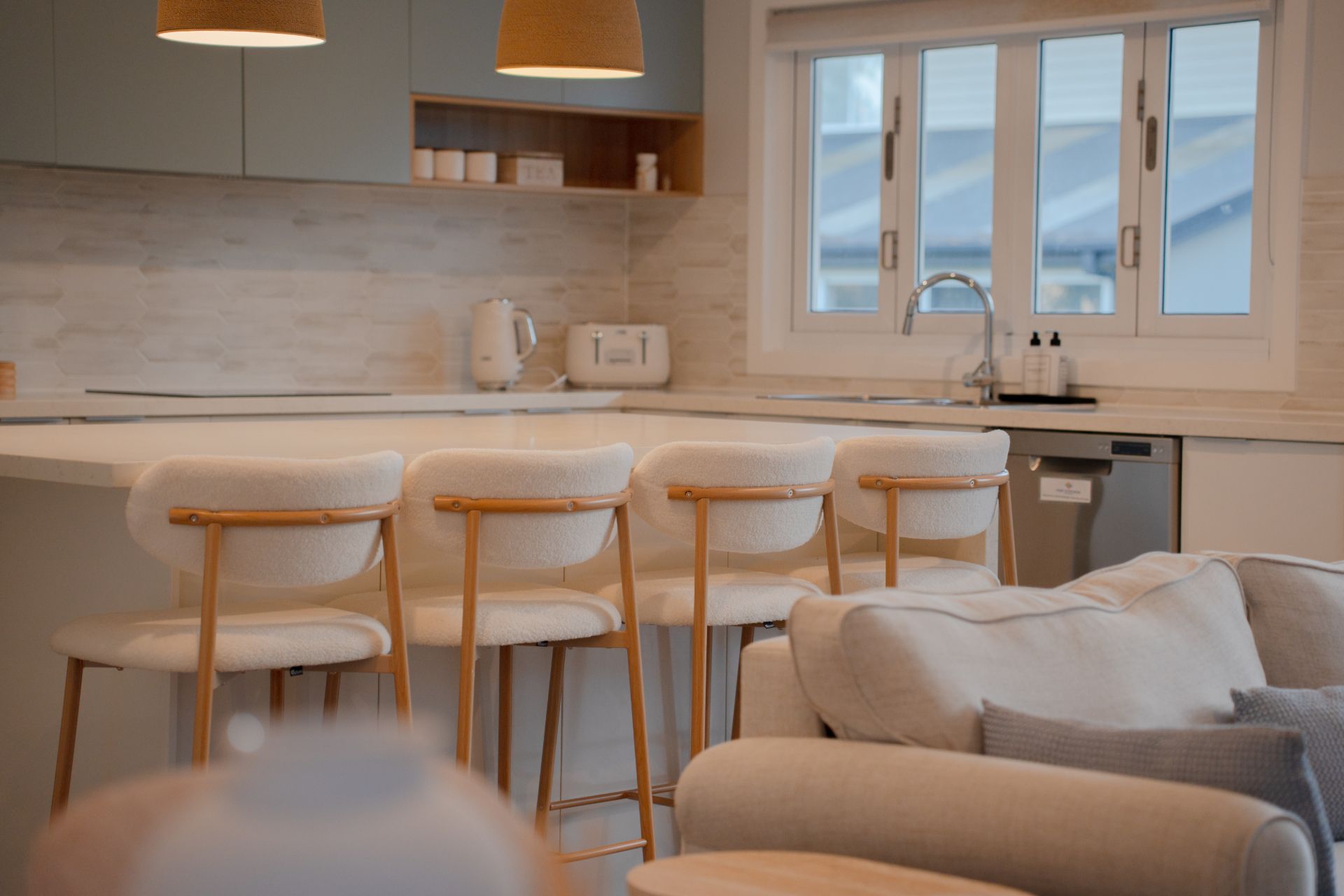 Inside, the home offers a welcoming living space where guests can gather and unwind after a day exploring the surrounding coastline. The layout supports easy holiday living, with a functional kitchen and living area suited to shared meals and quiet evenings indoors.