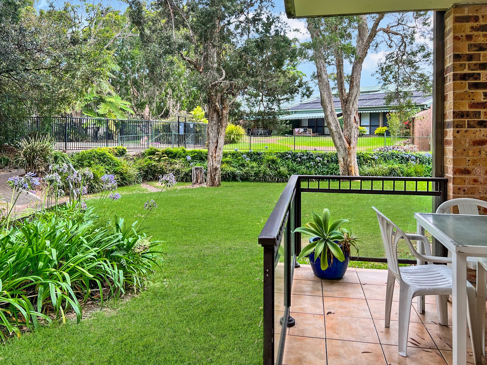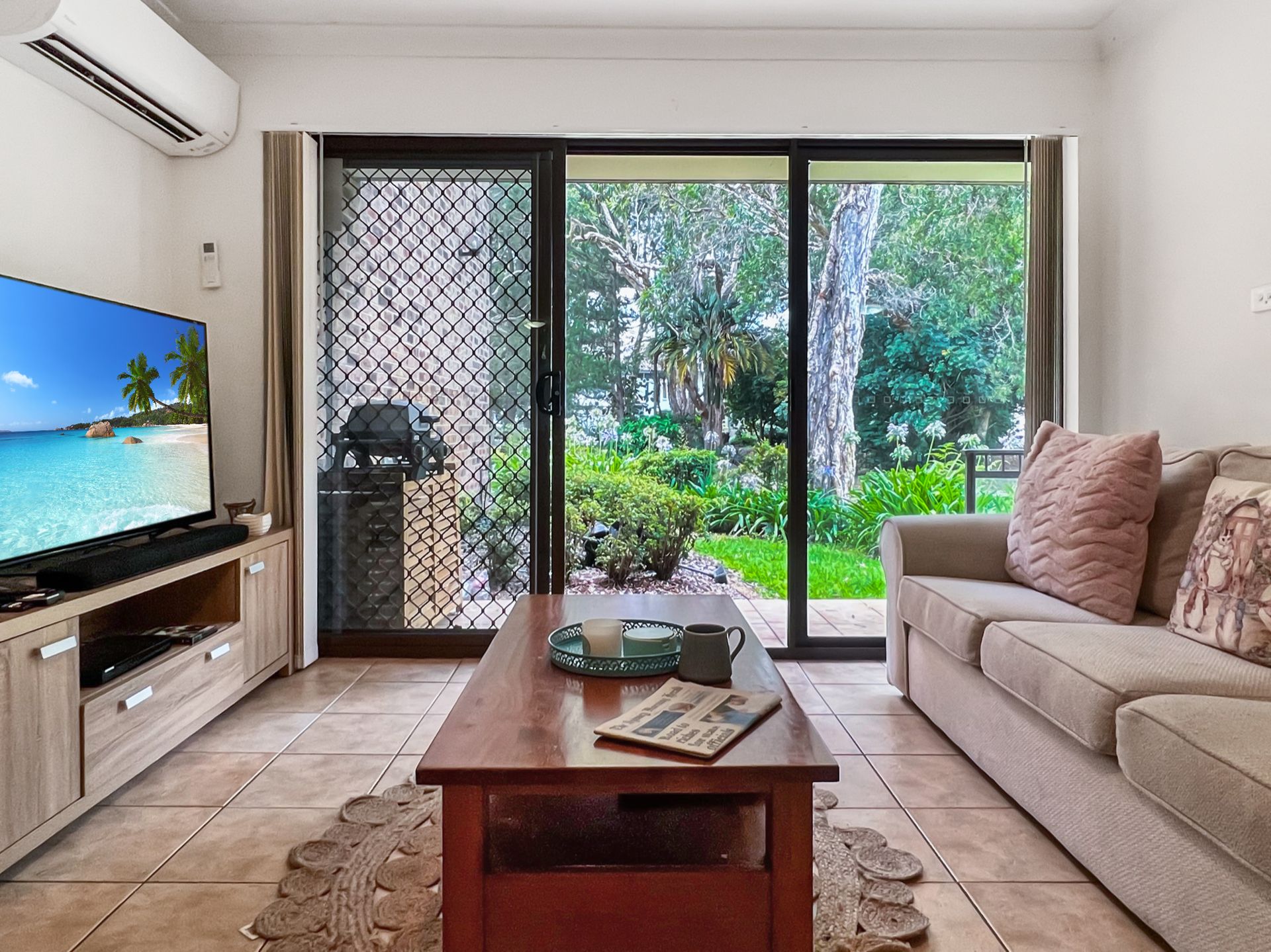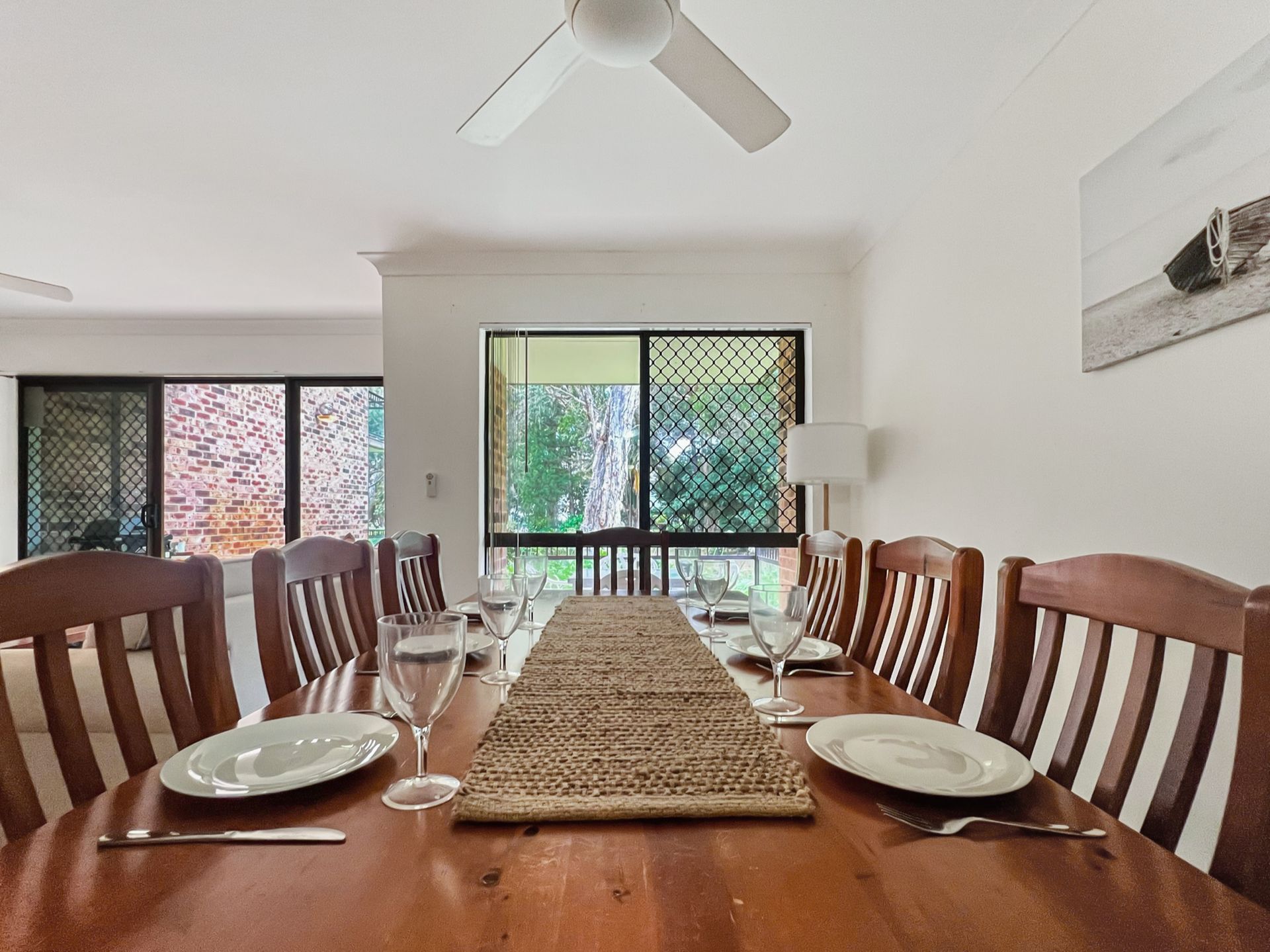 This neat and tidy ground floor unit is perfect for your next holiday stay in Port Stephens. It offers a tiled, air-conditioned open plan living area with comfortable seating, an android Smart TV, Bluetooth sound bar, ceiling fan and glass sliding doors out to a covered patio area with outdoor setting overlooking beautiful, lush gardens. The kitchen comes equipped with microwave, new coffee pod machine, fridge/freezer, dishwasher, oven and a stove, and the dining space is fitted with a solid wooden table and 8 chairs, and also has access to the outdoor patio area. There is split system air-conditioning throughout the unit and WiFi is provided.