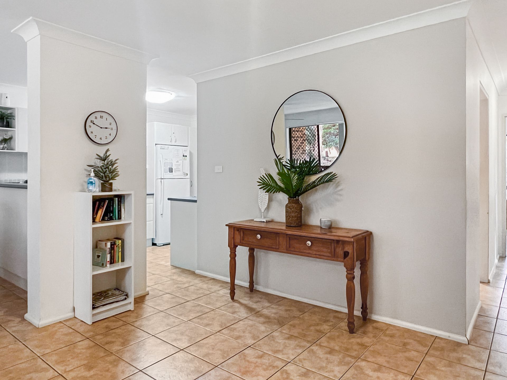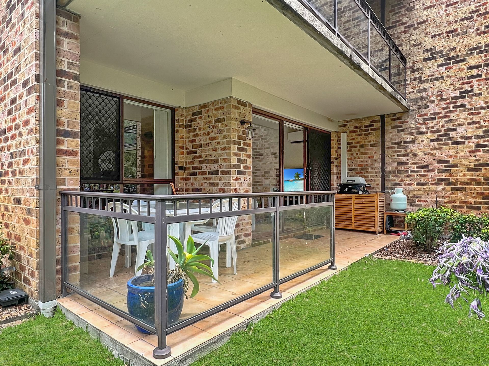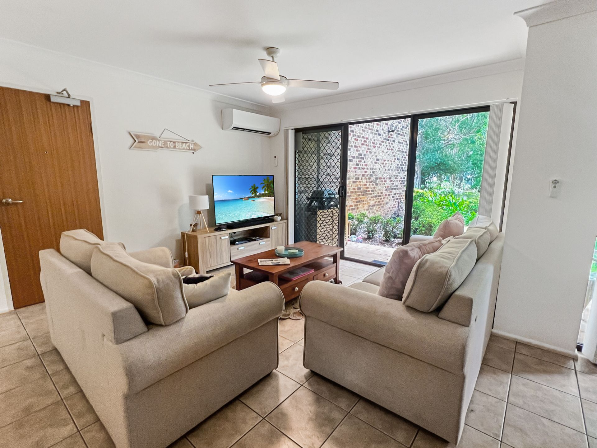 This neat and tidy ground floor unit is perfect for your next holiday stay in Port Stephens. It offers a tiled, air-conditioned open plan living area with comfortable seating, an android Smart TV, Bluetooth sound bar, ceiling fan and glass sliding doors out to a covered patio area with outdoor setting overlooking beautiful, lush gardens. The kitchen comes equipped with microwave, new coffee pod machine, fridge/freezer, dishwasher, oven and a stove, and the dining space is fitted with a solid wooden table and 8 chairs, and also has access to the outdoor patio area. There is split system air-conditioning throughout the unit and WiFi is provided.