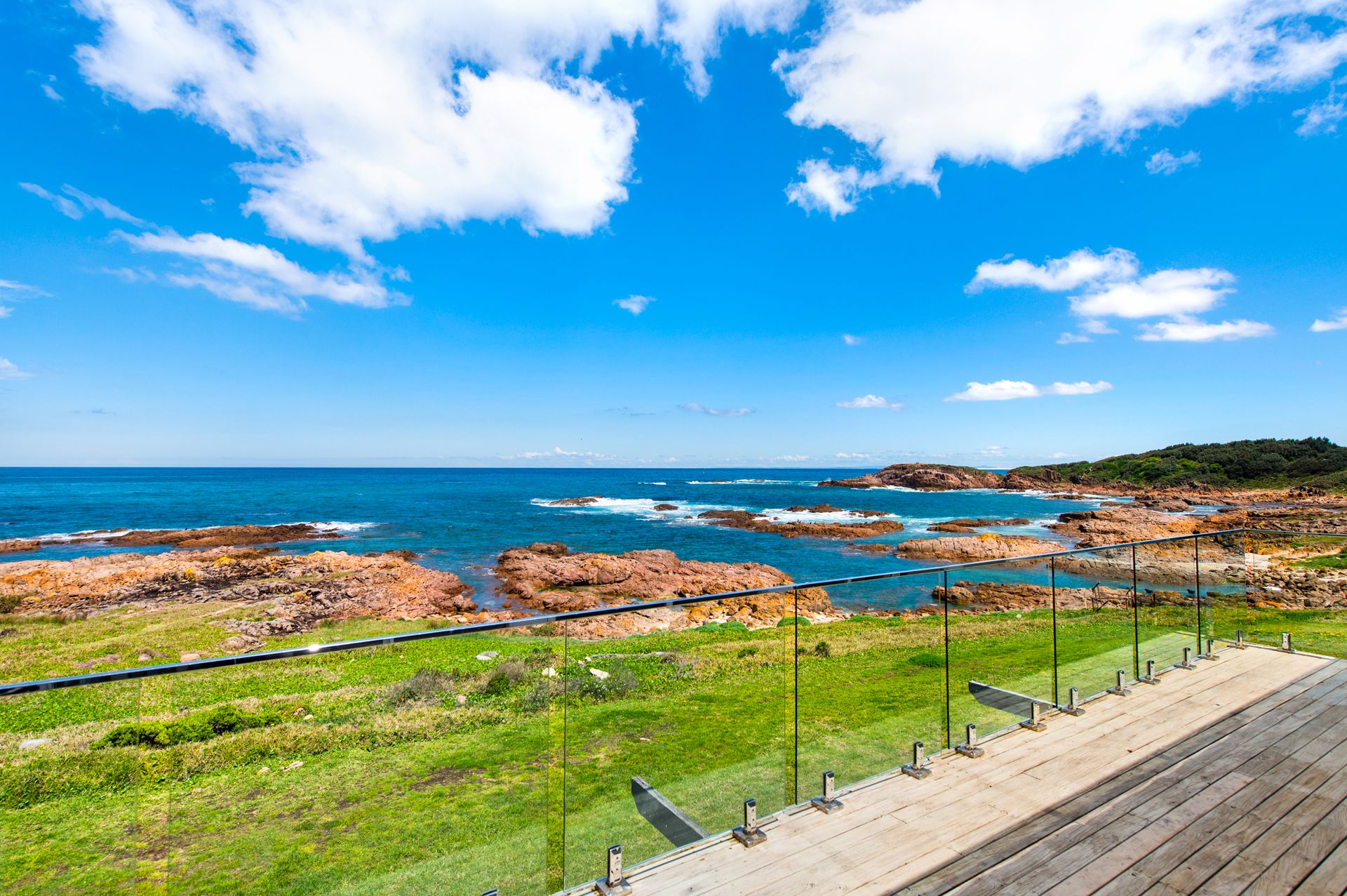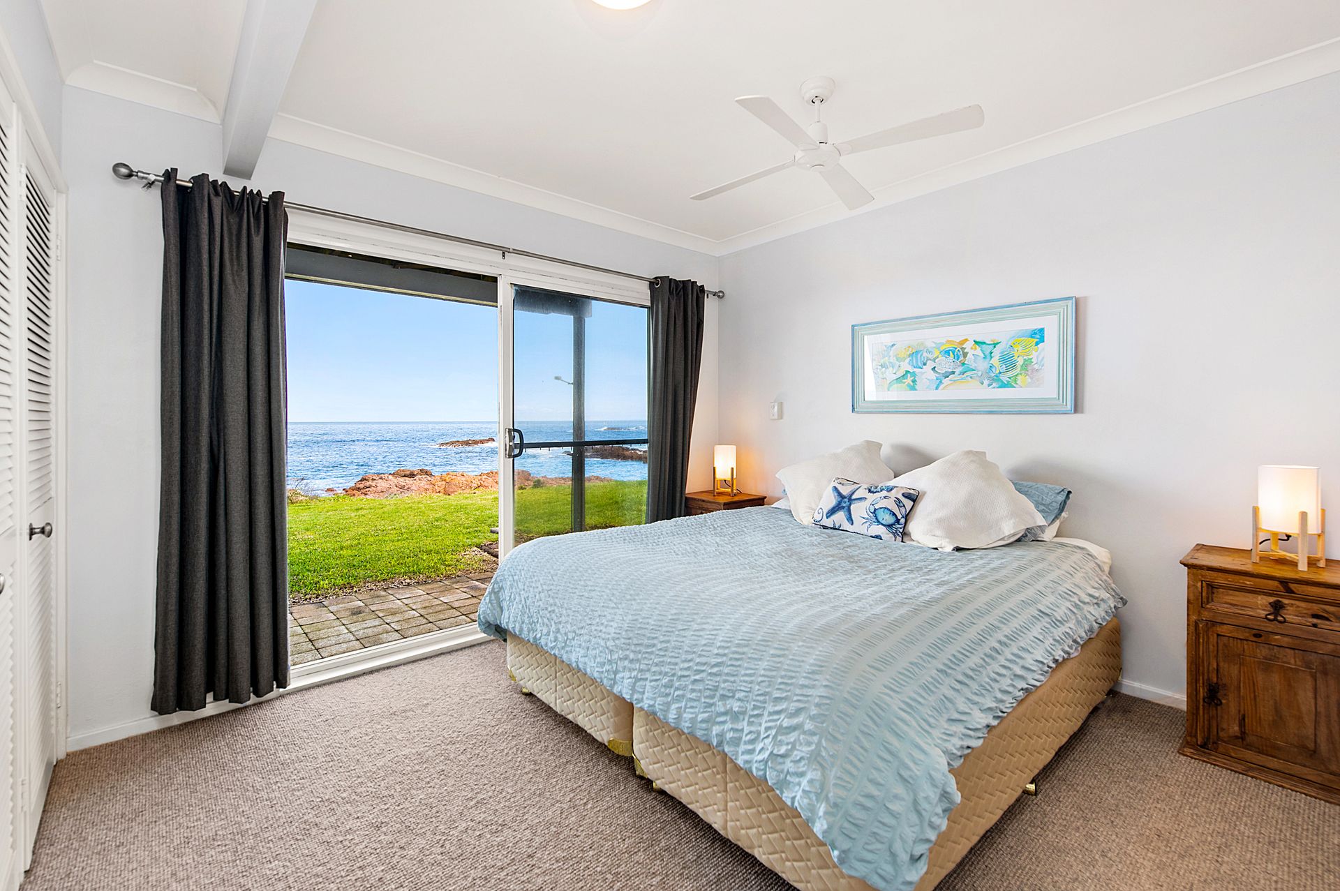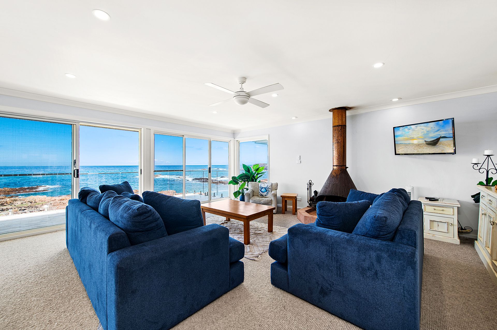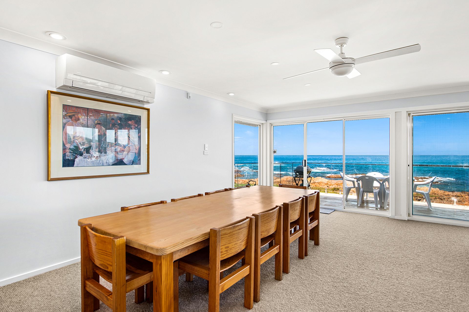 Upstairs, the spacious, open concept living area has been designed strategically to make the most of this unsurpassable location, with a wall of floor to ceiling glass windows drawing those truly spectacular and completely unobstructed ocean views in. The living area features a lounge area with flat screen TV, wifi, a fully equipped kitchen with a dishwasher, coffee machine and breakfast bar with stools, and an enormous 12-seater dining table. There is an air conditioner on the upper level and another one downstairs in one of the bedrooms. Additionally, fans are located inside the wardrobes. The indoors lead out to the glass-fronted front balcony overlooking the rugged and picturesque coastline – dine alfresco with the crashing of the waves and the spray of the ocean in the air.