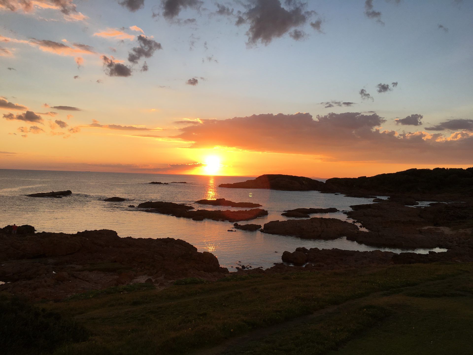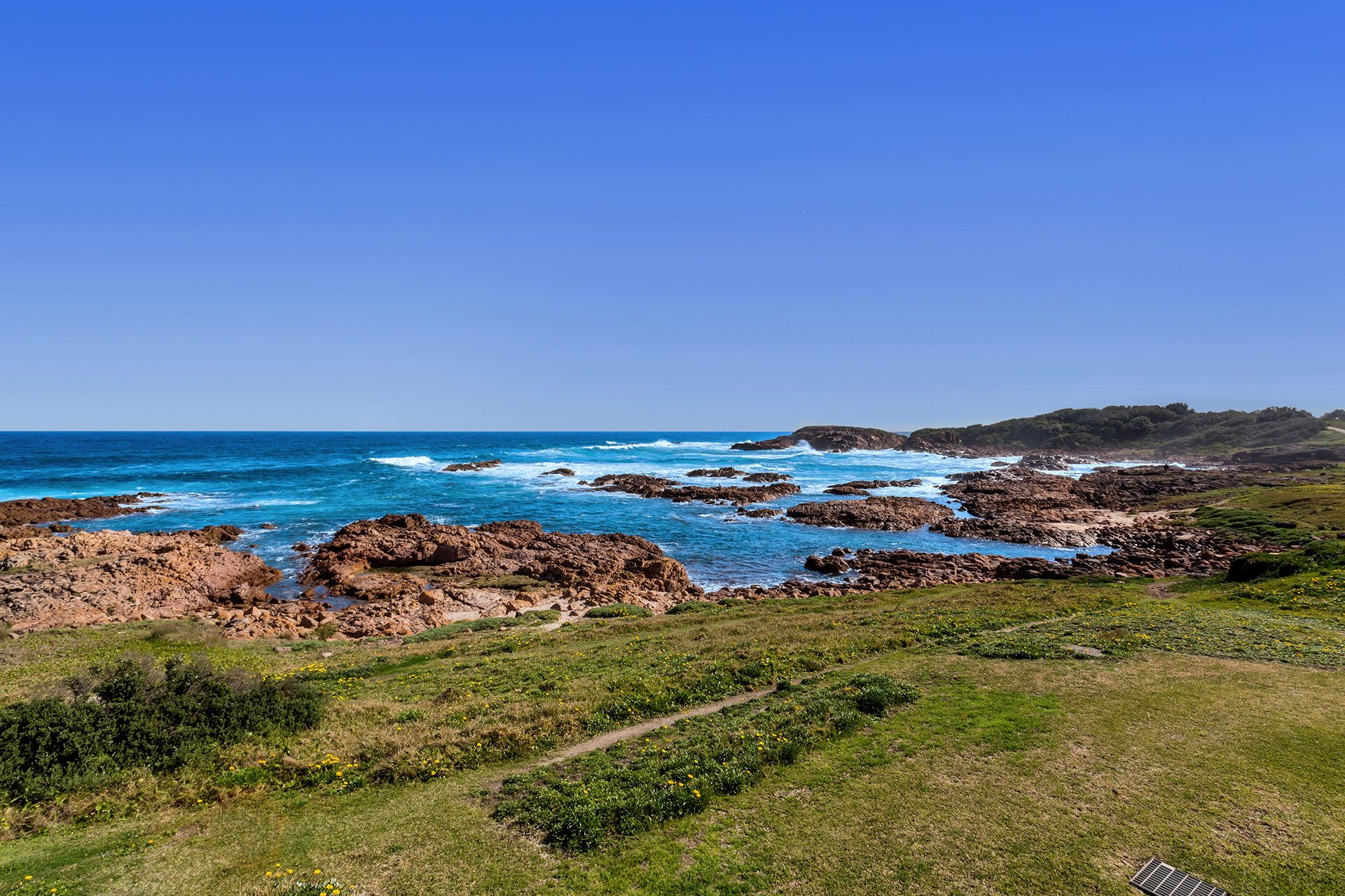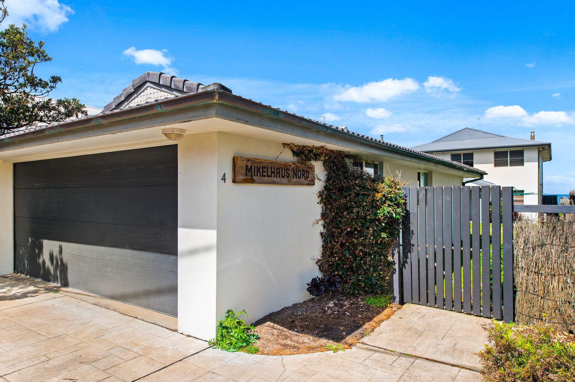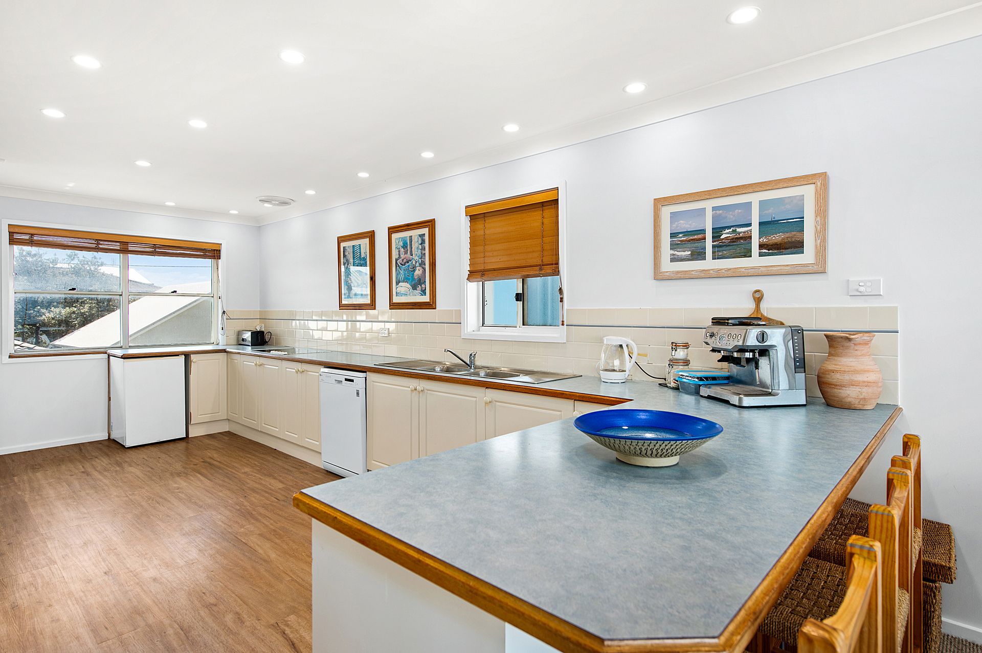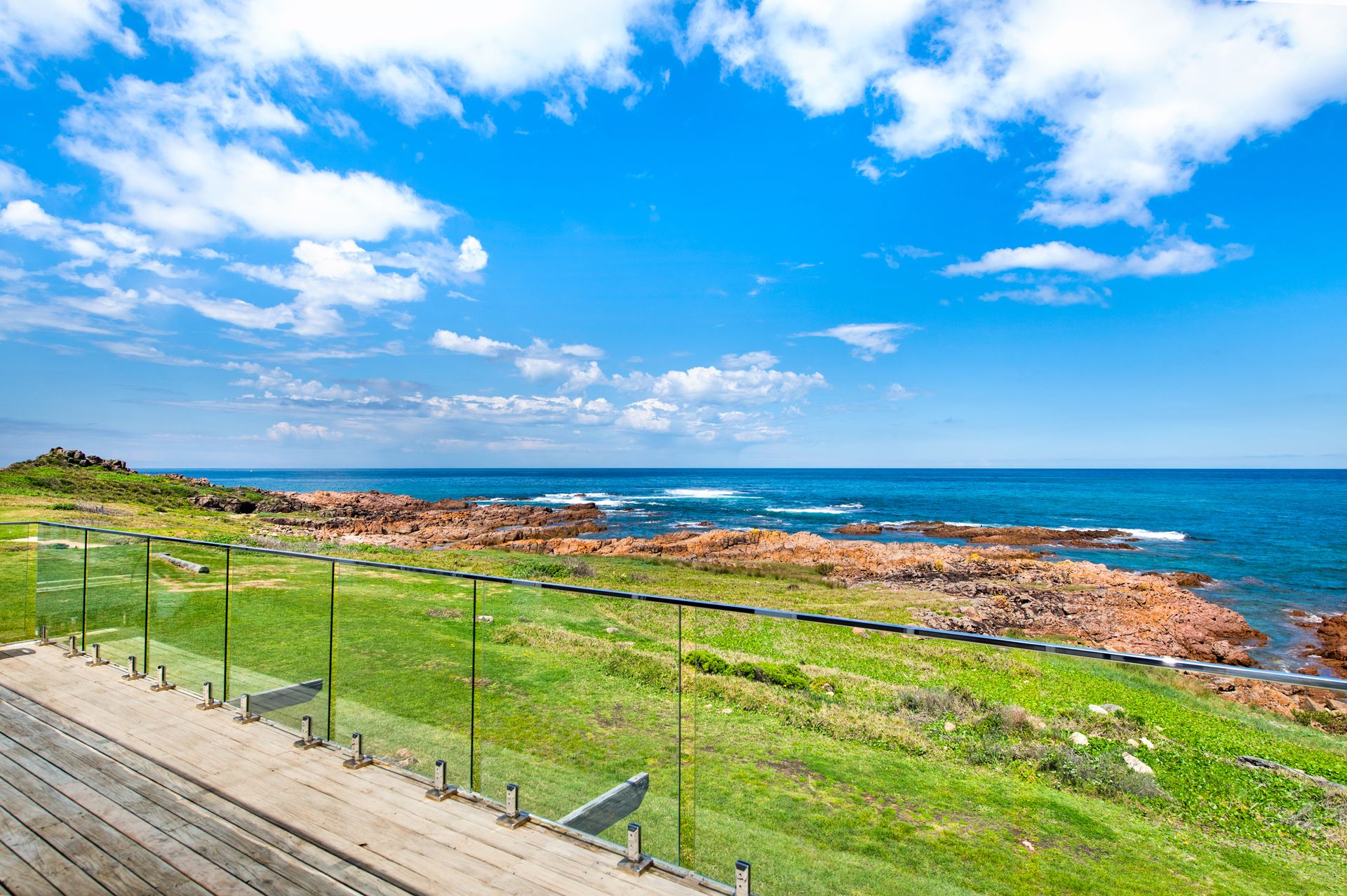 Upstairs, the spacious, open concept living area has been designed strategically to make the most of this unsurpassable location, with a wall of floor to ceiling glass windows drawing those truly spectacular and completely unobstructed ocean views in. The living area features a lounge area with flat screen TV, wifi, a fully equipped kitchen with a dishwasher, coffee machine and breakfast bar with stools, and an enormous 12-seater dining table. There is an air conditioner on the upper level and another one downstairs in one of the bedrooms. Additionally, fans are located inside the wardrobes. The indoors lead out to the glass-fronted front balcony overlooking the rugged and picturesque coastline – dine alfresco with the crashing of the waves and the spray of the ocean in the air.