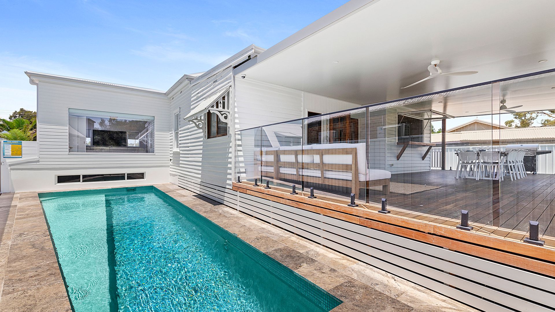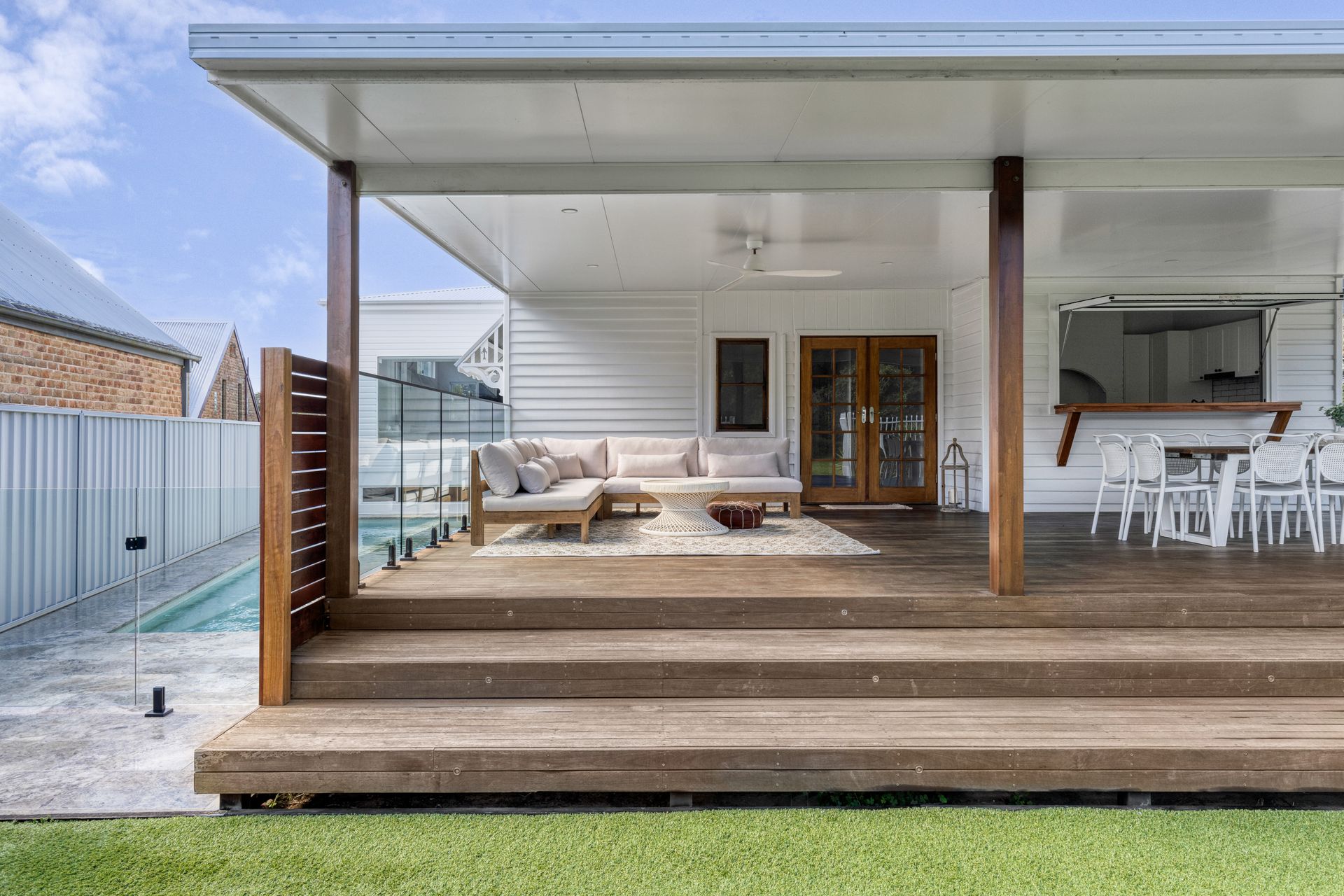 Expansive outdoor deck overlooking the garden and pool