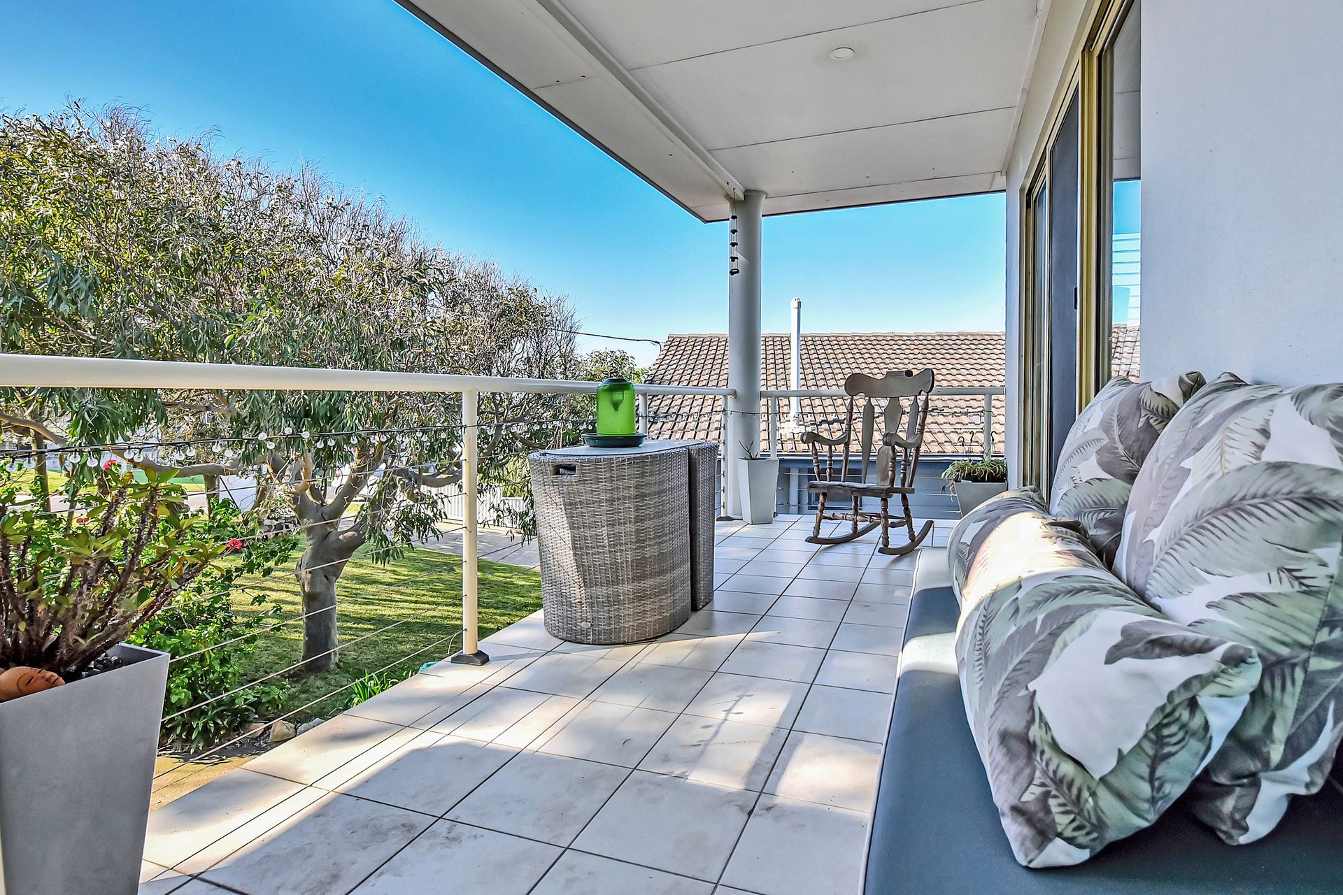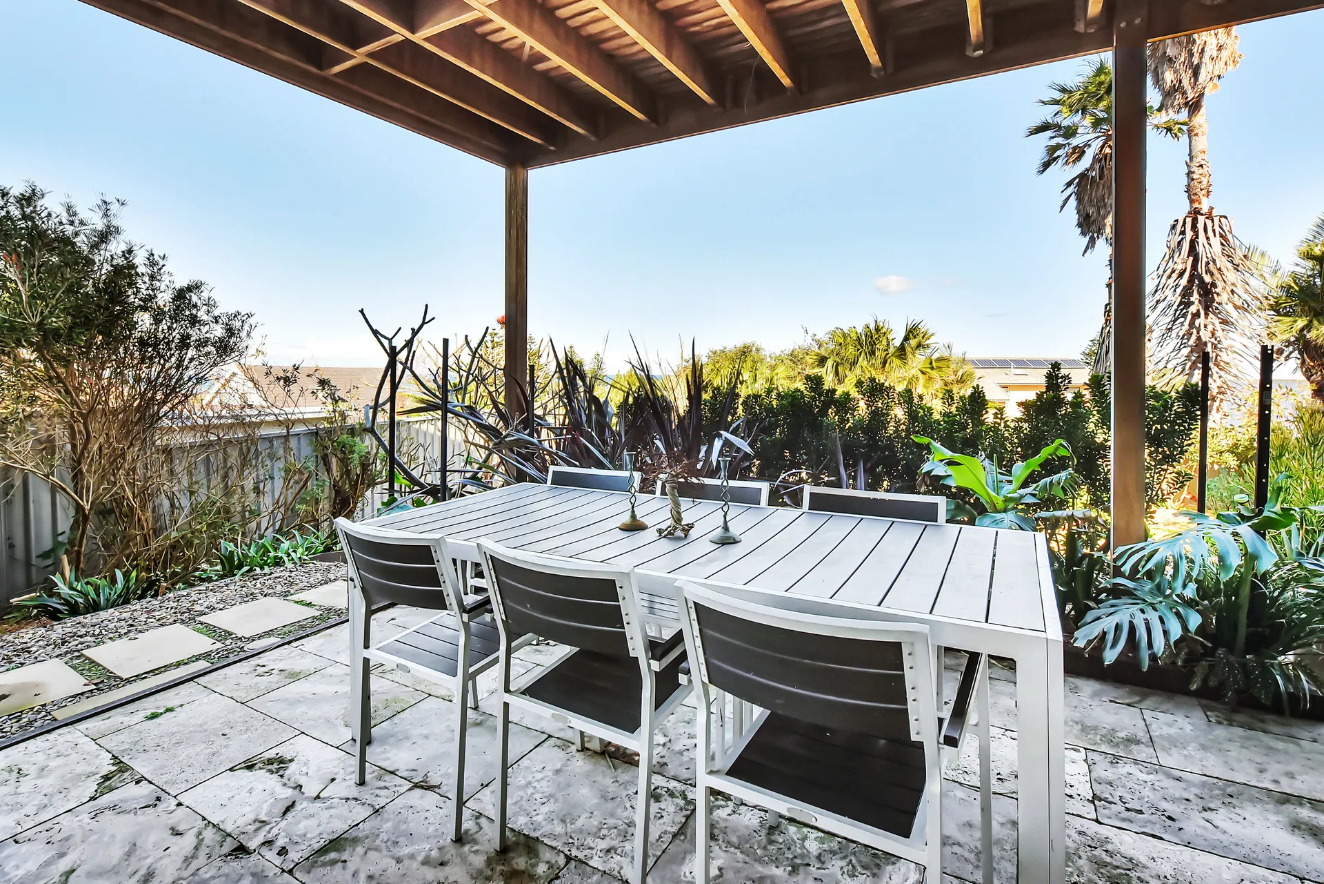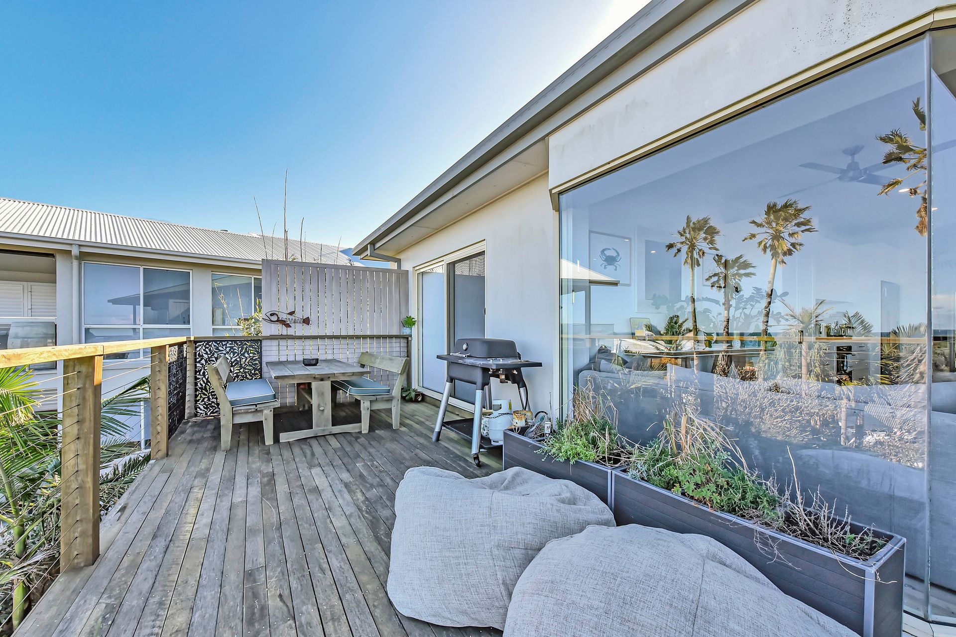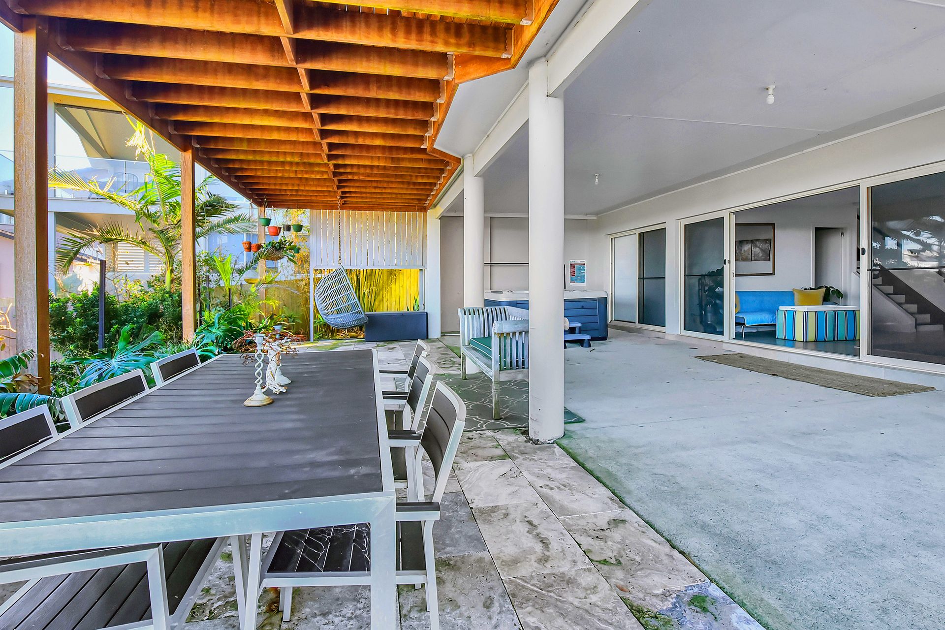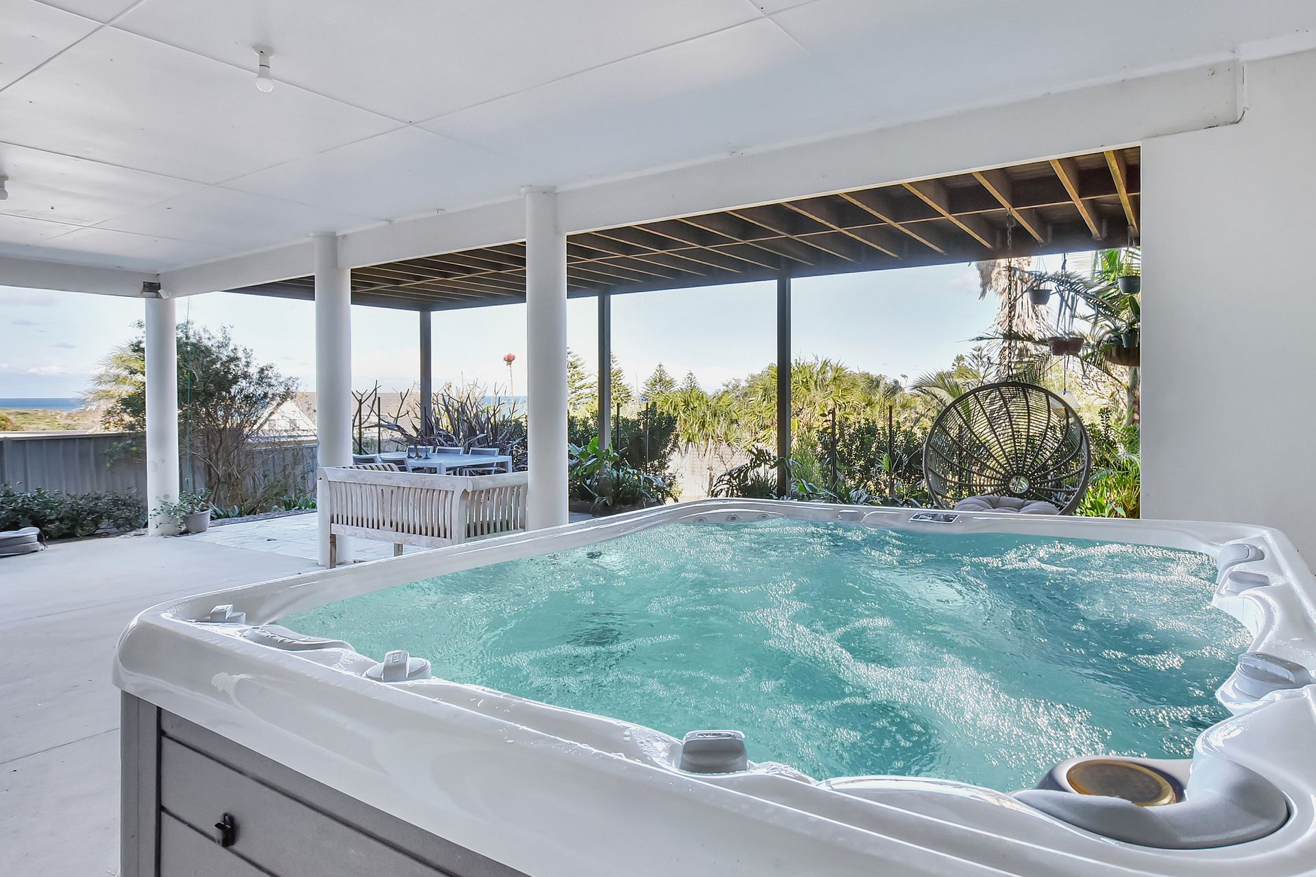 Outside, enjoy a six-person spa set in a leafy, fully fenced courtyard, making it pet-friendly and secure for families. A BBQ and outdoor dining space let you savour relaxed meals after a day at the beach.