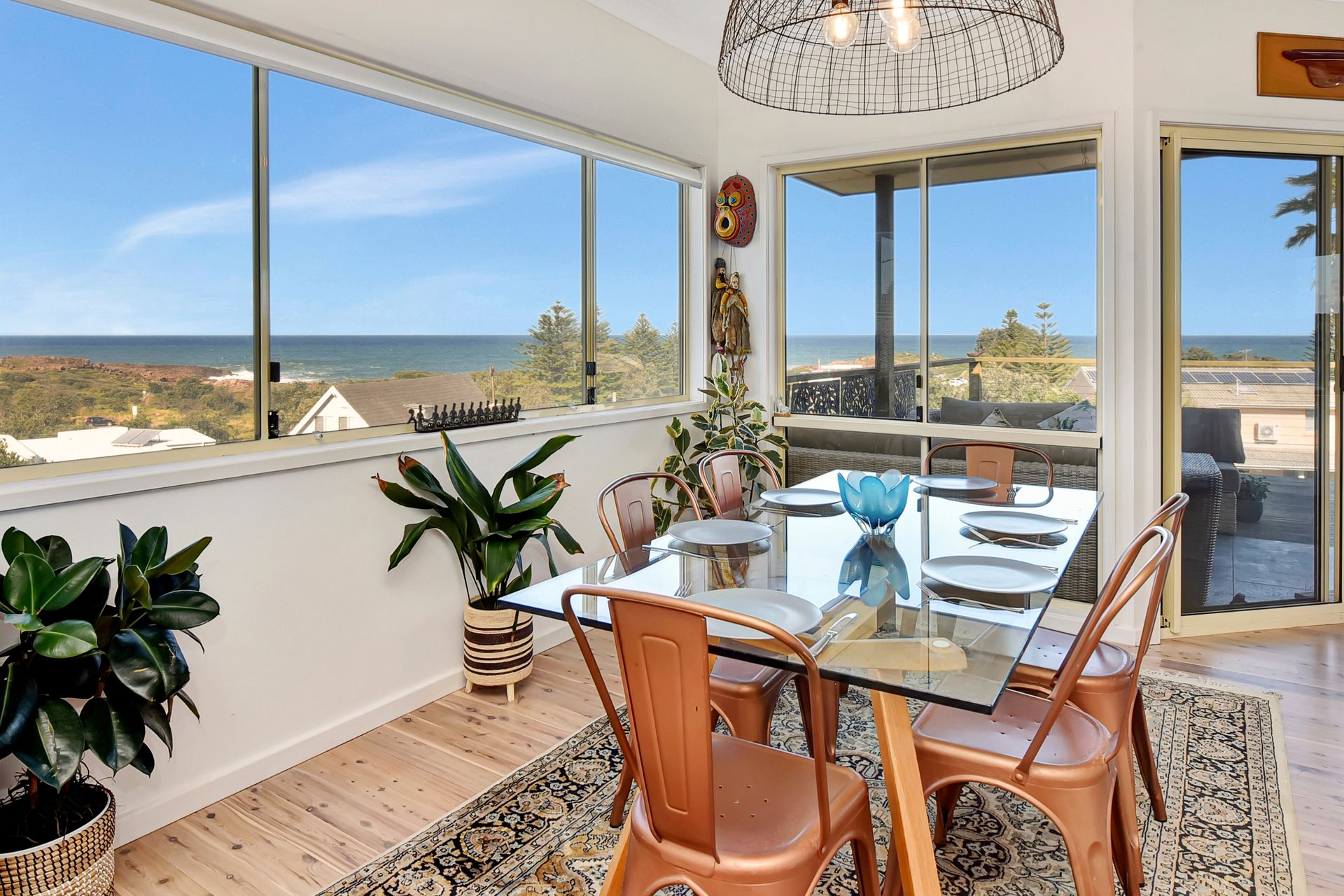 The open-plan living and dining area is filled with natural light, featuring comfortable seating, a Smart TV, and large windows framing the ocean. Glass doors open to a generous deck with two seating zones, perfect for morning coffees or evening platters with a sea breeze. Stay comfortable in any season with air conditioning, a fireplace, and ceiling fans