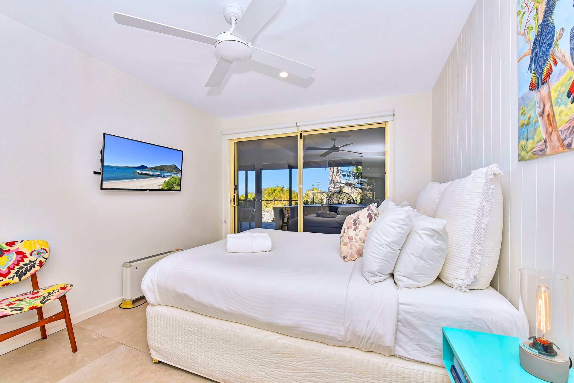Bedroom 1 (Upstairs): Queen, TV, balcony access, built-in robe, ceiling fan
