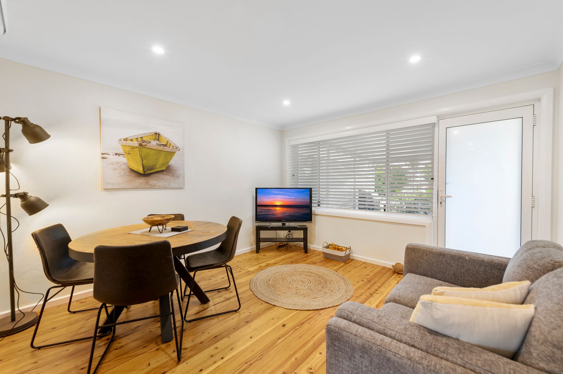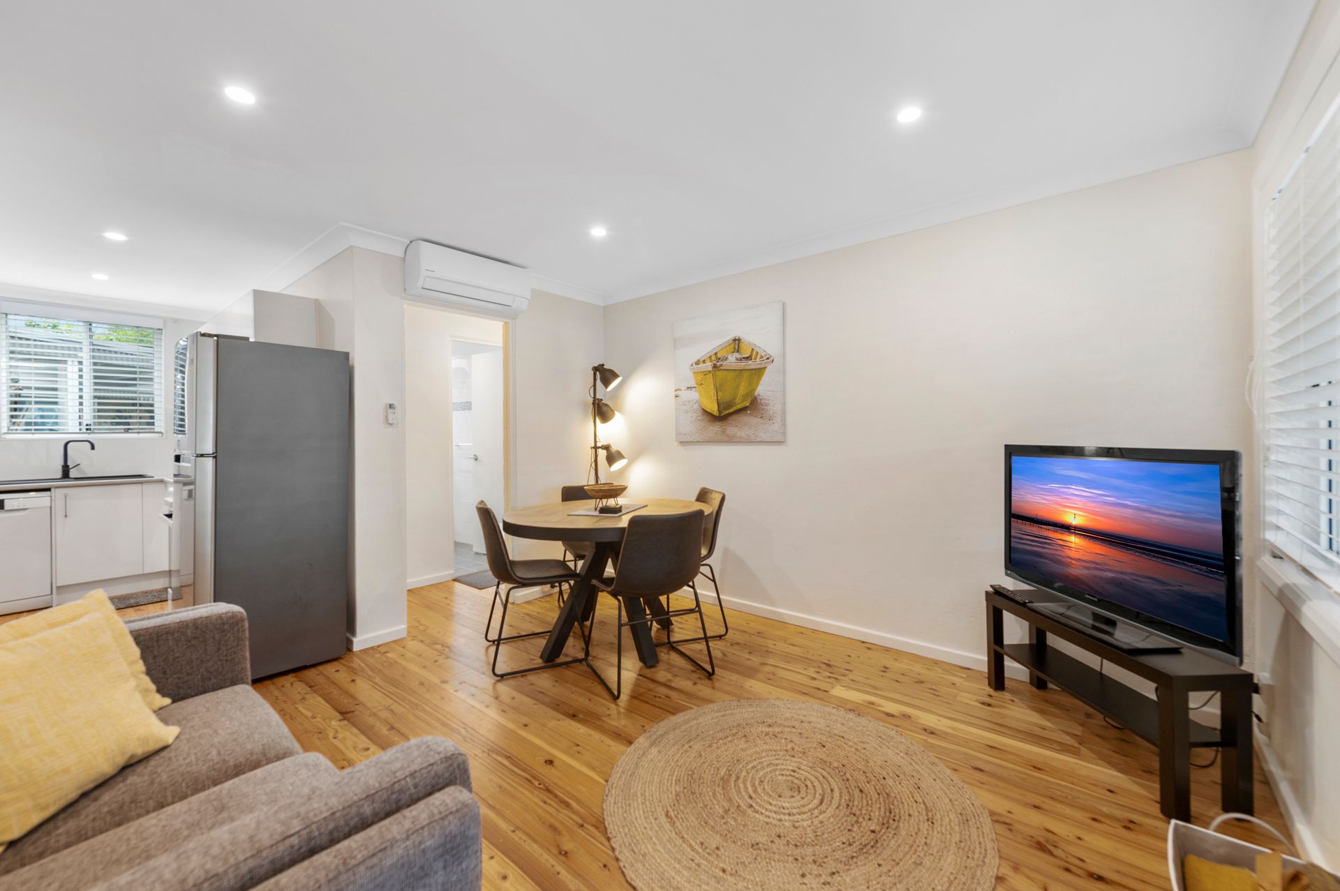 Upon entry into the unit you have an open-plan living, dining and kitchen area that is fully equipped with everything you need to relax and enjoy your meals after a day exploring Port Stephens. It has a comfortable lounge and smart TV in the living room and Wi-Fi is available, as well as a 4 seater dining table and a full kitchen with everything you need for meal preparation such as a microwave, sandwich press, oven, stove, cutlery and a dish washer for your convenience. There is split system air conditioning in this unit making your stay extremely comfortable all year round.