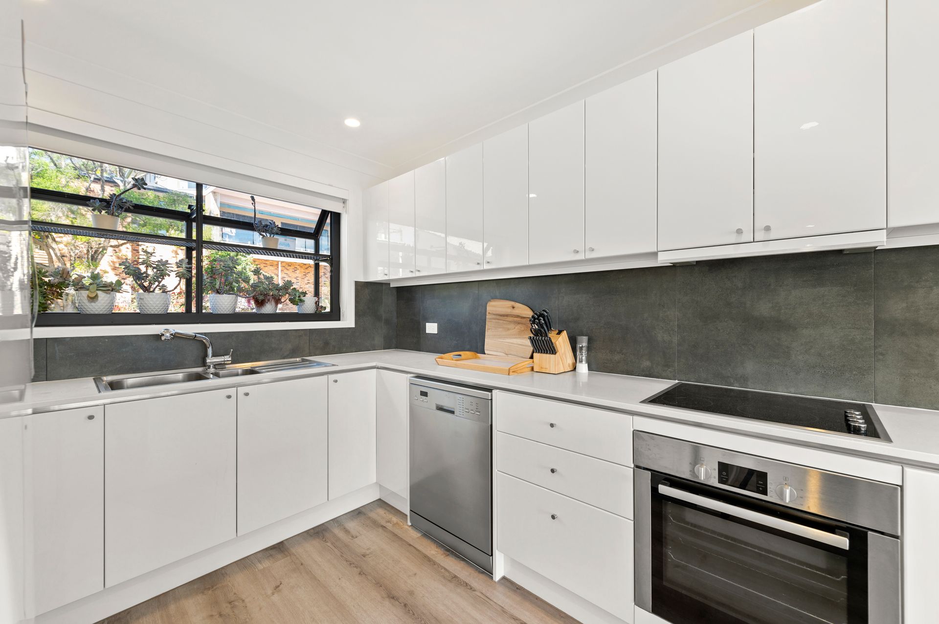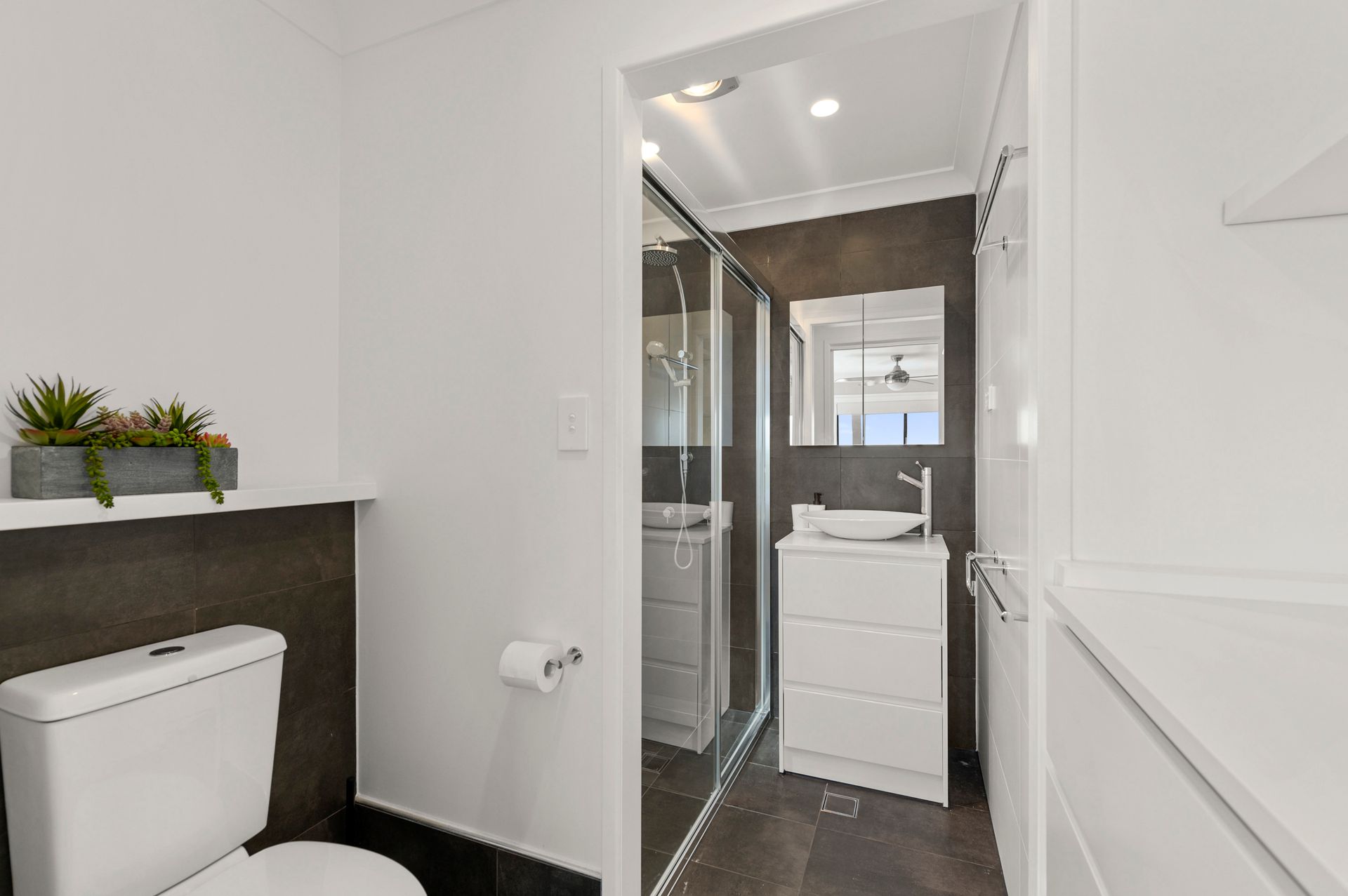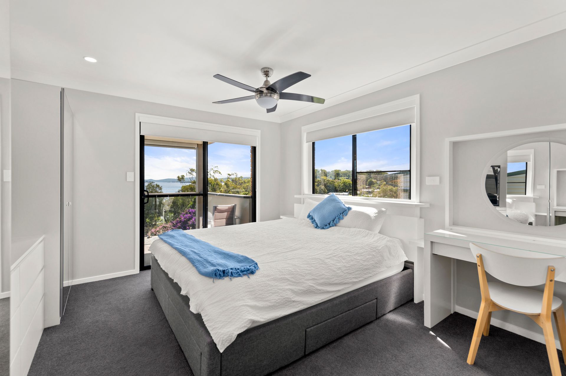 The air-conditioned upper floor offers open plan living that leads out to a large balcony with fabulous views, and an outdoor table and lounge. The spacious, modern kitchen is fully equipped, including a dishwasher and Nespresso coffee machine (BYO pods). In the morning, you can find yourself enjoying coffee and breakfast on the balcony while soaking in the beautiful vista of boats floating on the glistening waters. Late afternoon, cook up a BBQ with family and friends after a day at the beach, then sit back with a refreshing beverage as you watch the sunset across the water towards Soldiers Point. This level also boasts the master bedroom with king bed, a TV, vanity table, ensuite bathroom and private balcony.