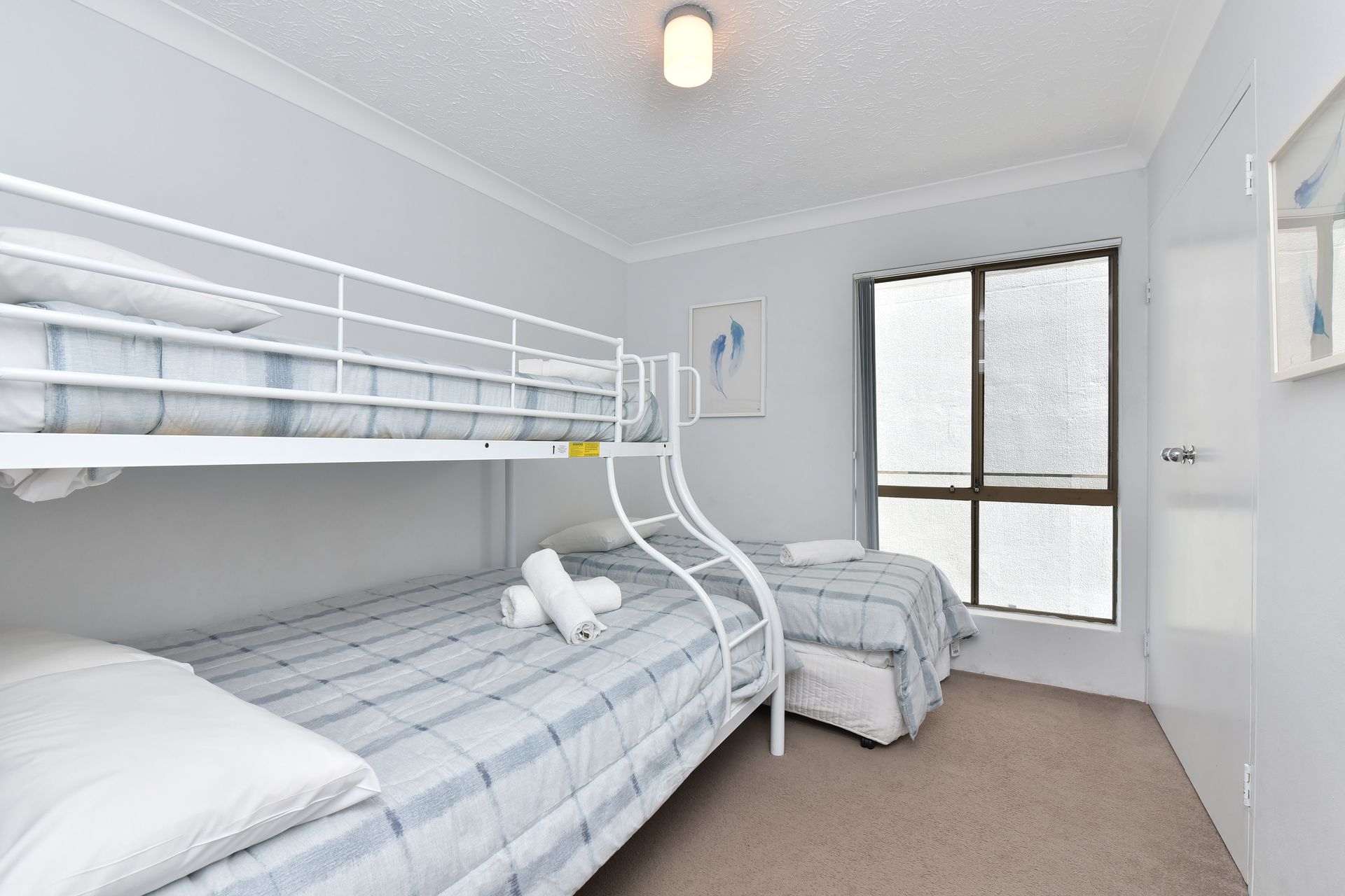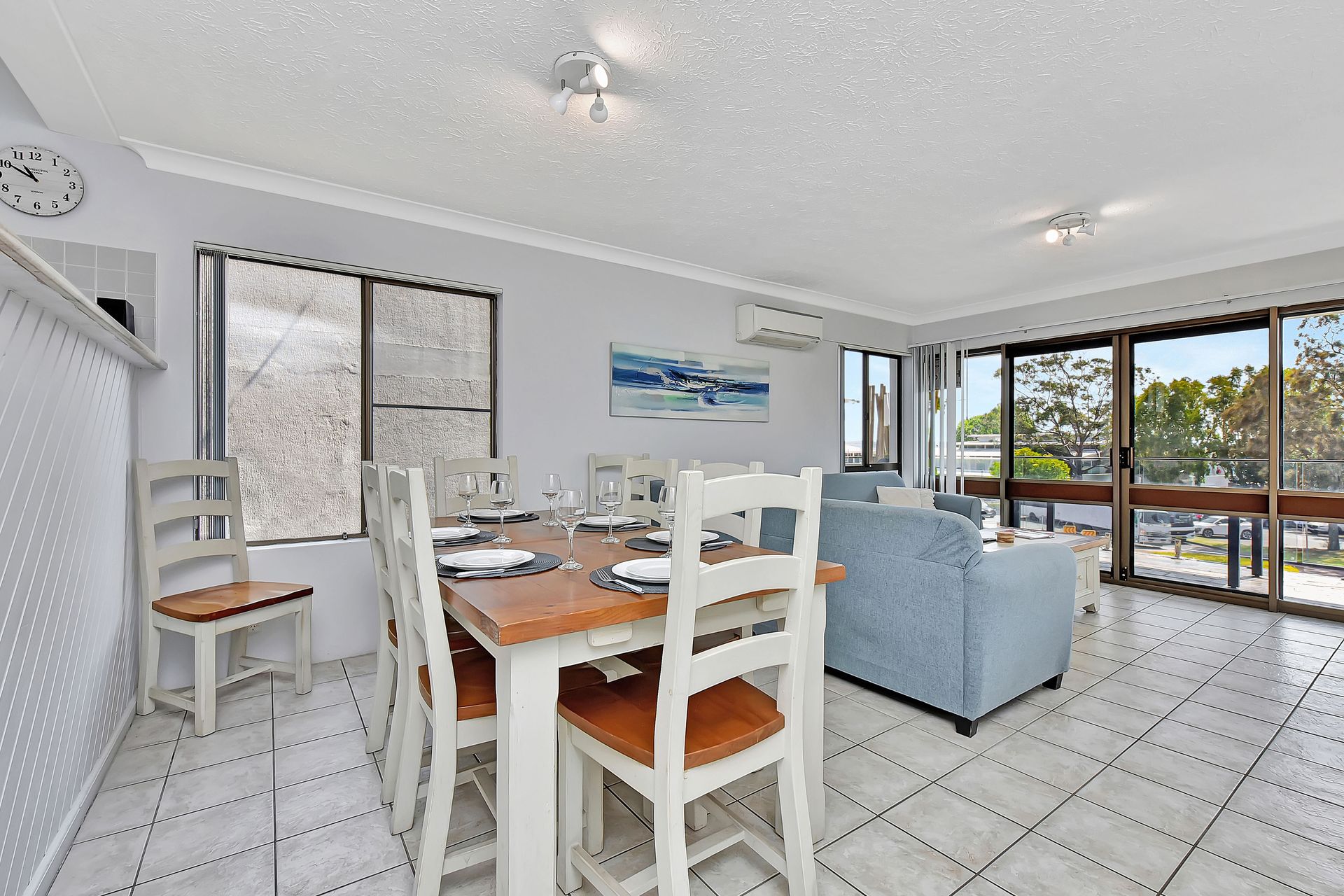 Accommodating up to eight guests, the unit features three thoughtfully designed bedrooms. The master suite includes a queen bed, walk-in robe, and a private ensuite for added tranquilly. The second bedroom offers a clever tri-bunk configuration (a double bed below with two singles), ideal for children or extra guests, while the third bedroom boasts a queen bed and access to a second balcony. Each room is styled to provide a restful retreat after a day exploring Nelson Bay’s natural beauty and vibrant local scene.