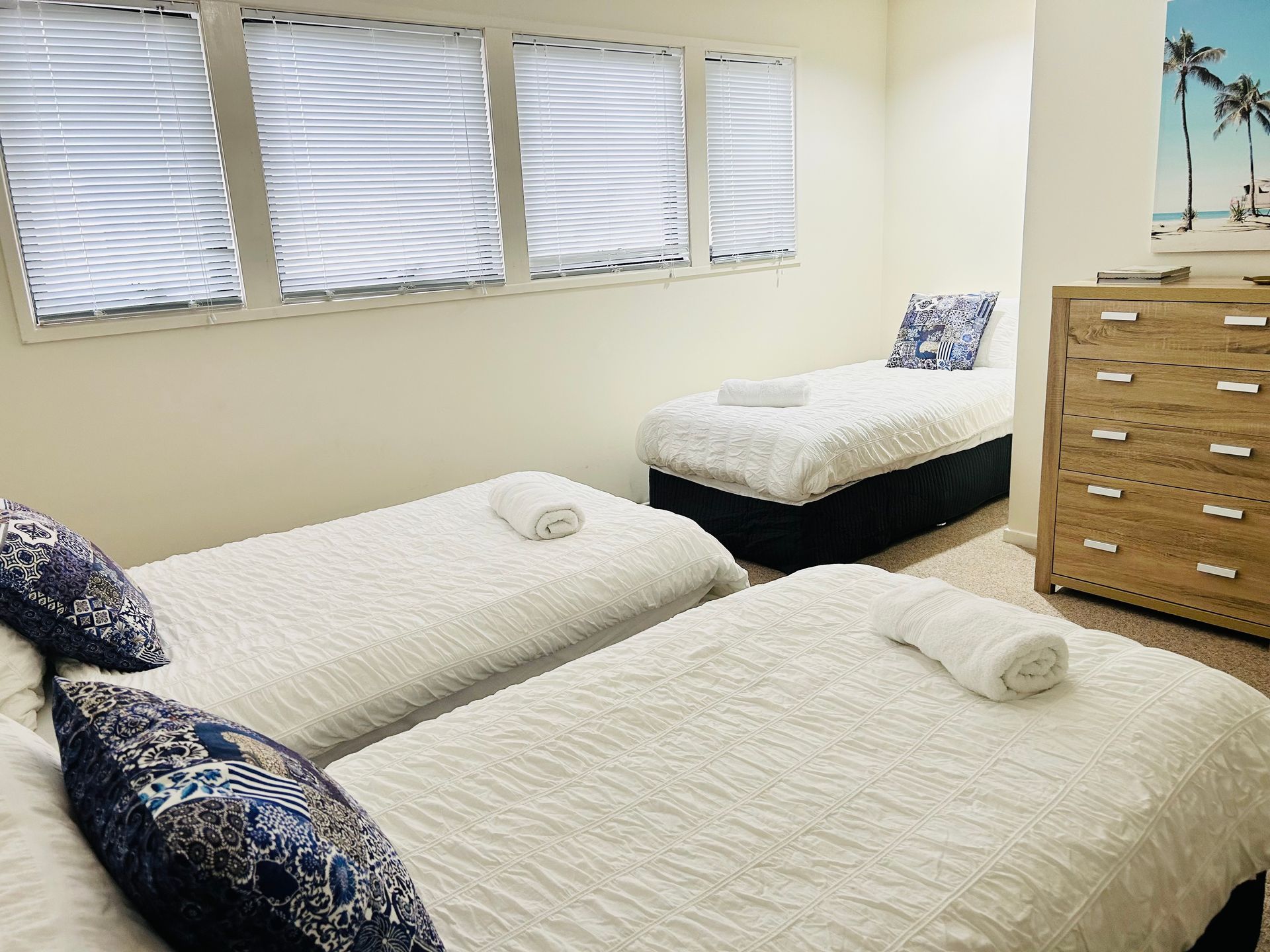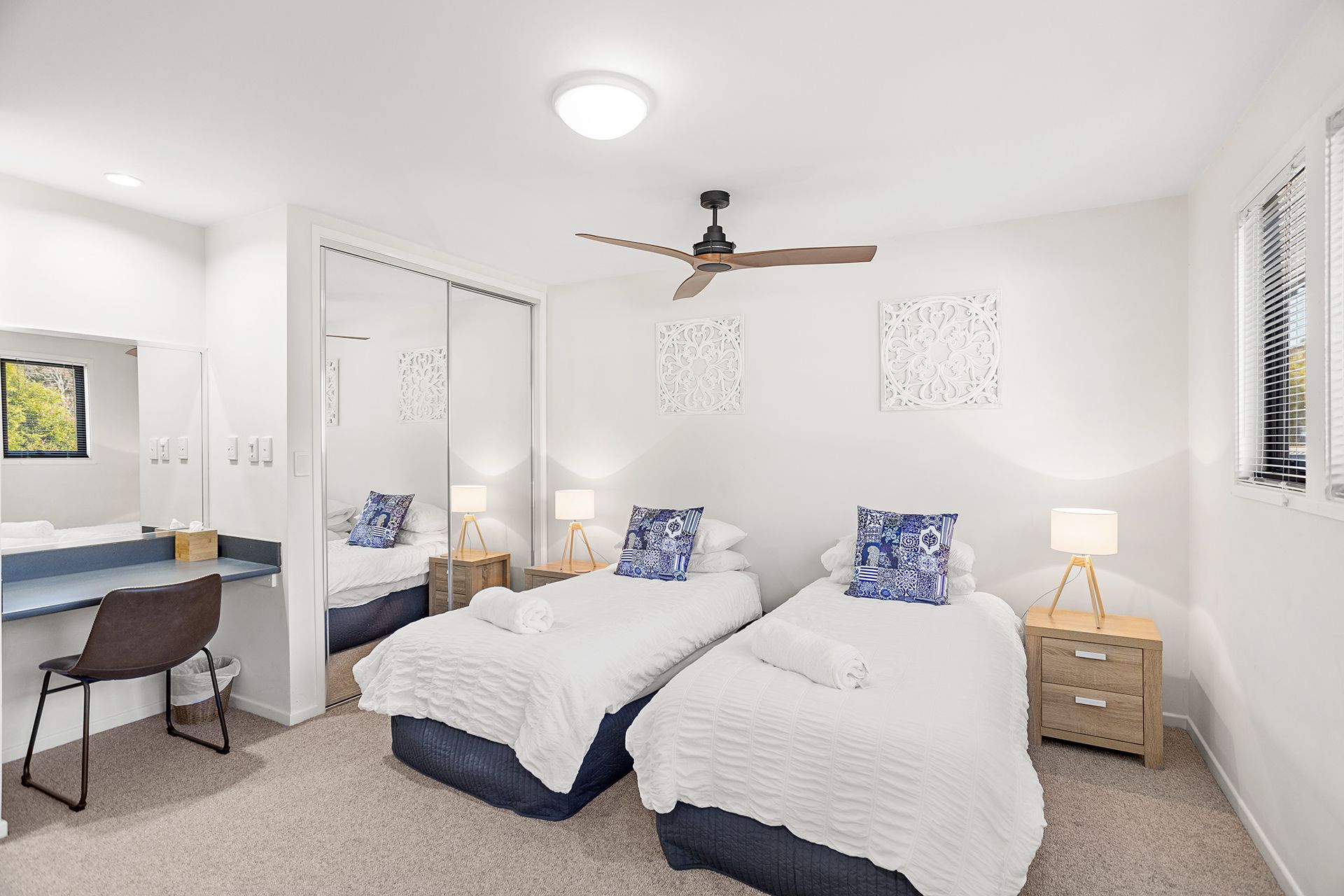 Upstairs are the 2 bedrooms, each with a ceiling fan and study nook. The main bedroom has a king bed and direct access to the balcony for a relaxing morning coffee overlooking the course, while the second bedroom offers 3 extra-long single beds. There is also a fold away as an extra bedding option for a child, and this level also has the bathroom with shower and toilet.