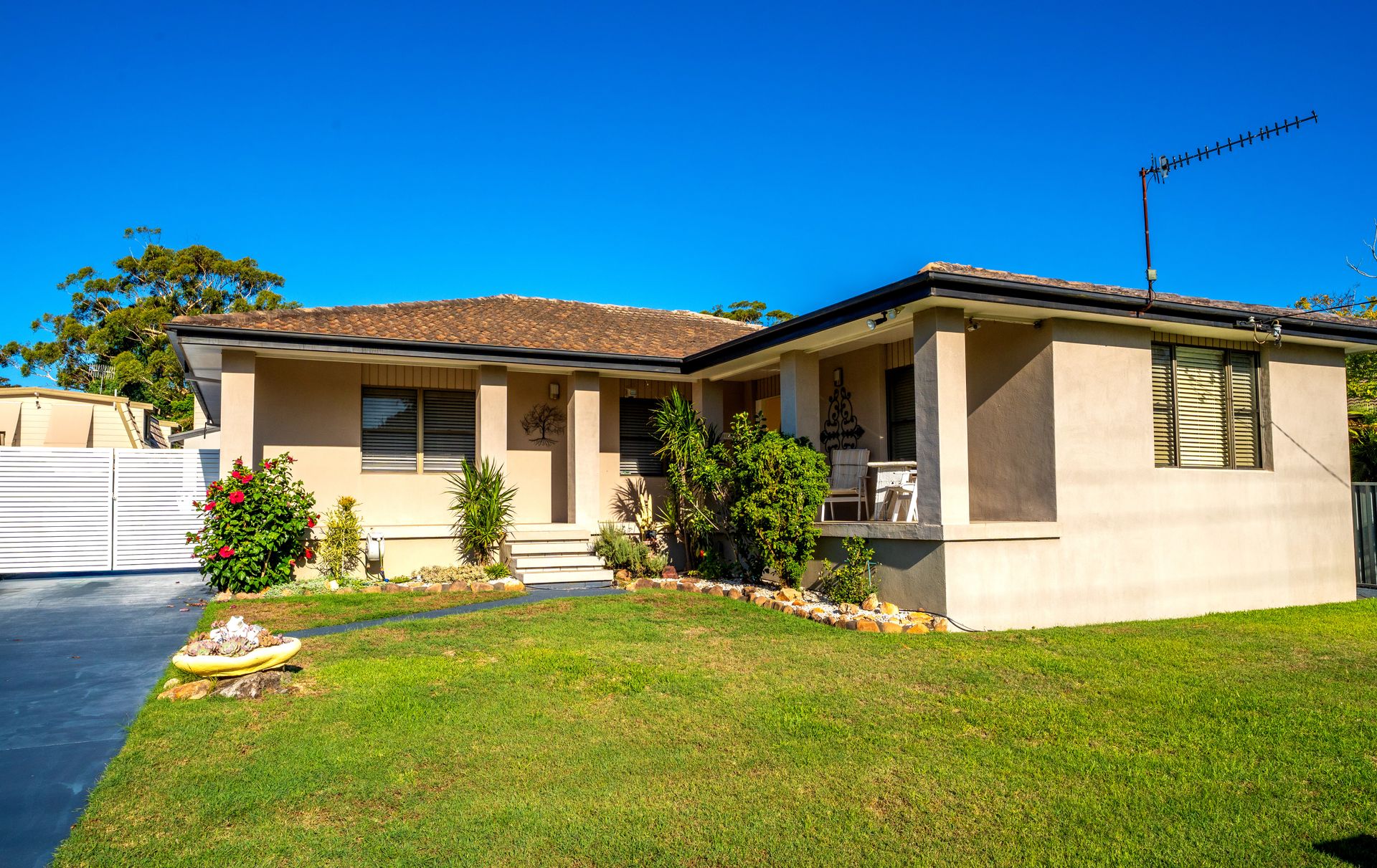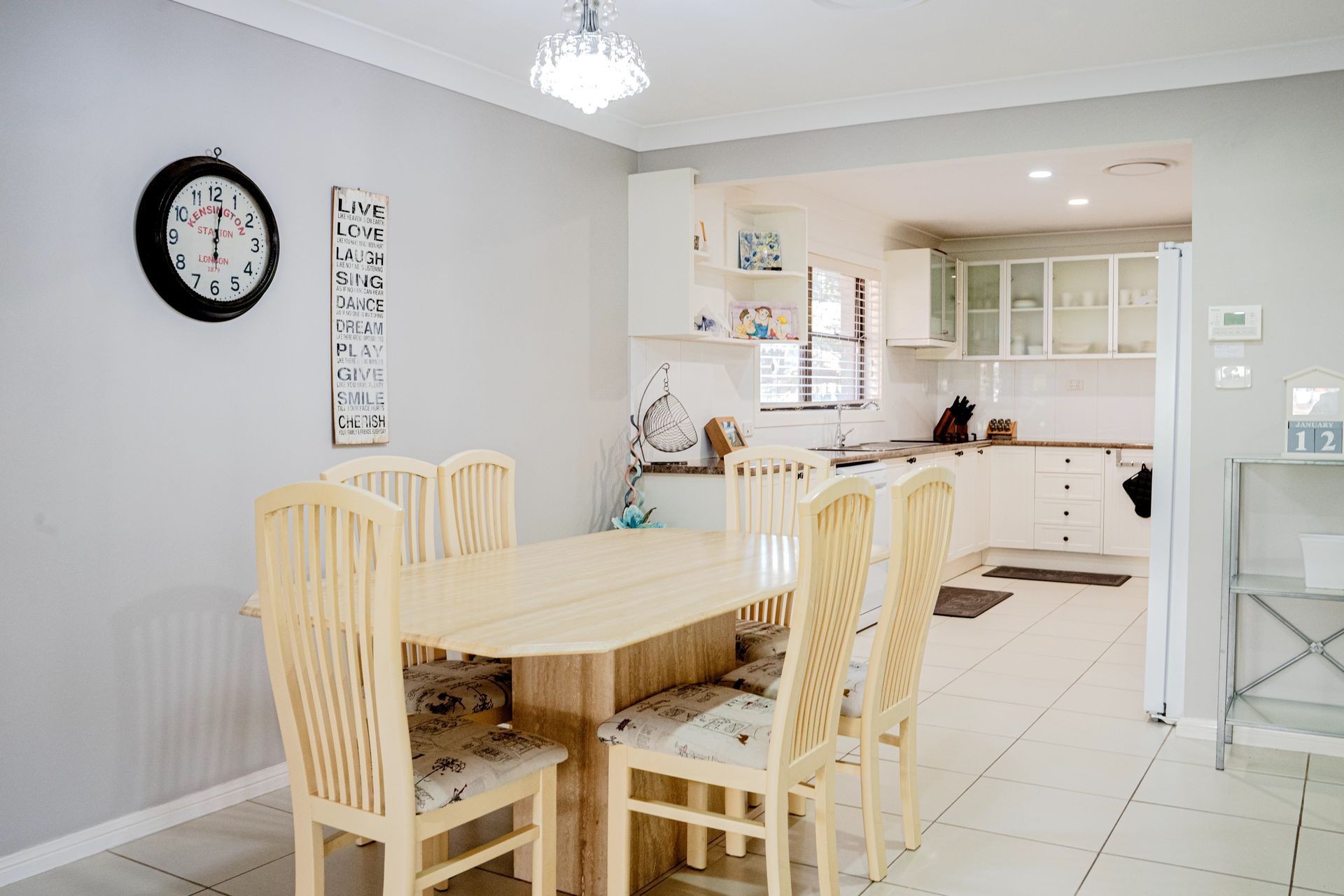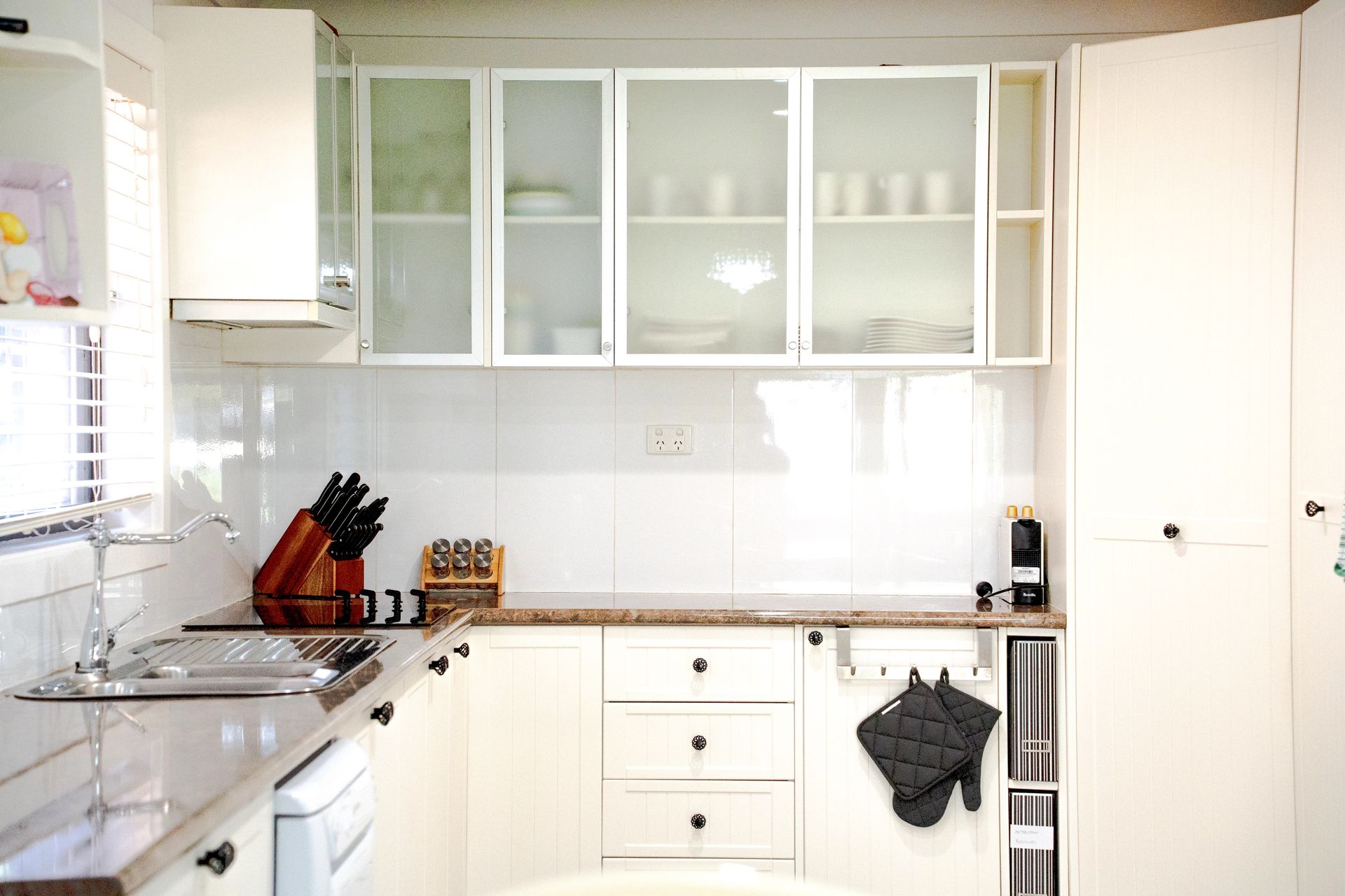 Inside, the home features a double lounge room area with a 75 inch smart TV and the enclosed outdoor patio also has a smart TV. The fully equipped kitchen includes an electric stove, oven, microwave, dishwasher, coffee machine, and a spacious island benchtop, making meal preparation easy. A pantry, full crockery and cutlery set, kettle, toaster, and highchair ensure the space is well-suited for families and longer stays.