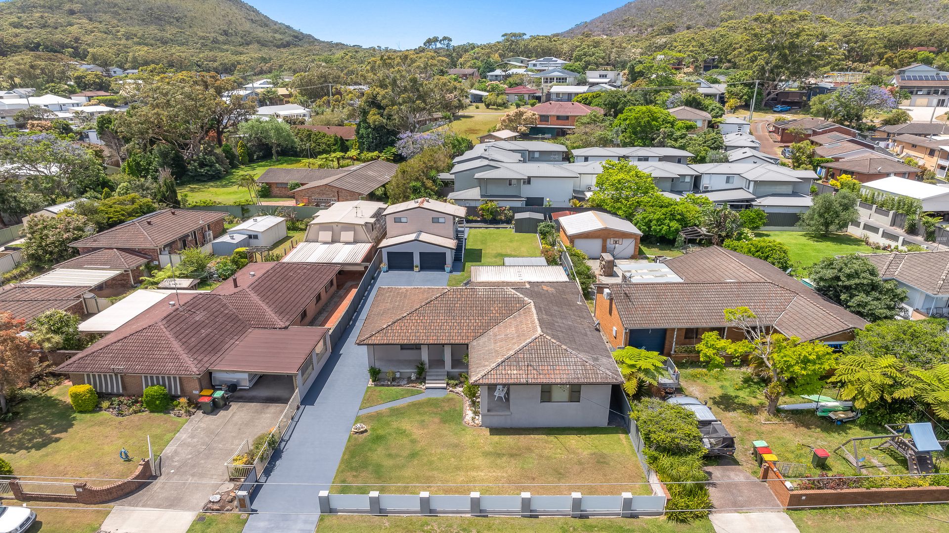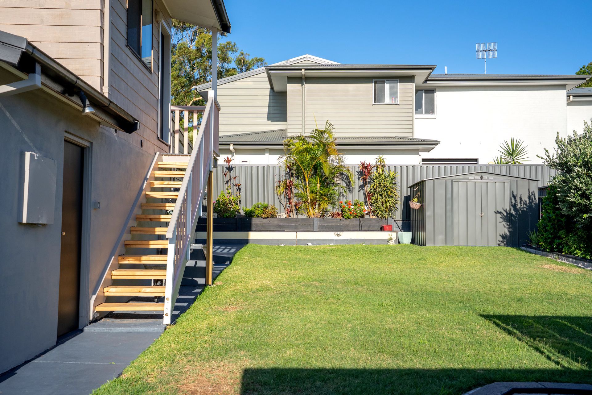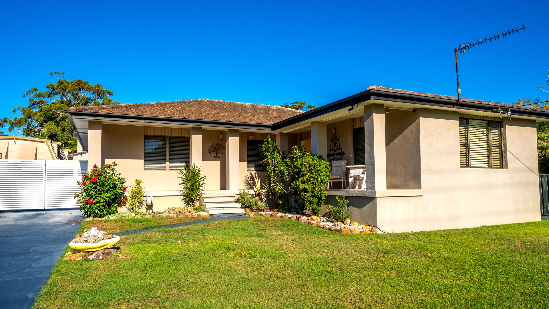 Inside, the home features a double lounge room area with a 75 inch smart TV and the enclosed outdoor patio also has a smart TV. The fully equipped kitchen includes an electric stove, oven, microwave, dishwasher, coffee machine, and a spacious island benchtop, making meal preparation easy. A pantry, full crockery and cutlery set, kettle, toaster, and highchair ensure the space is well-suited for families and longer stays.