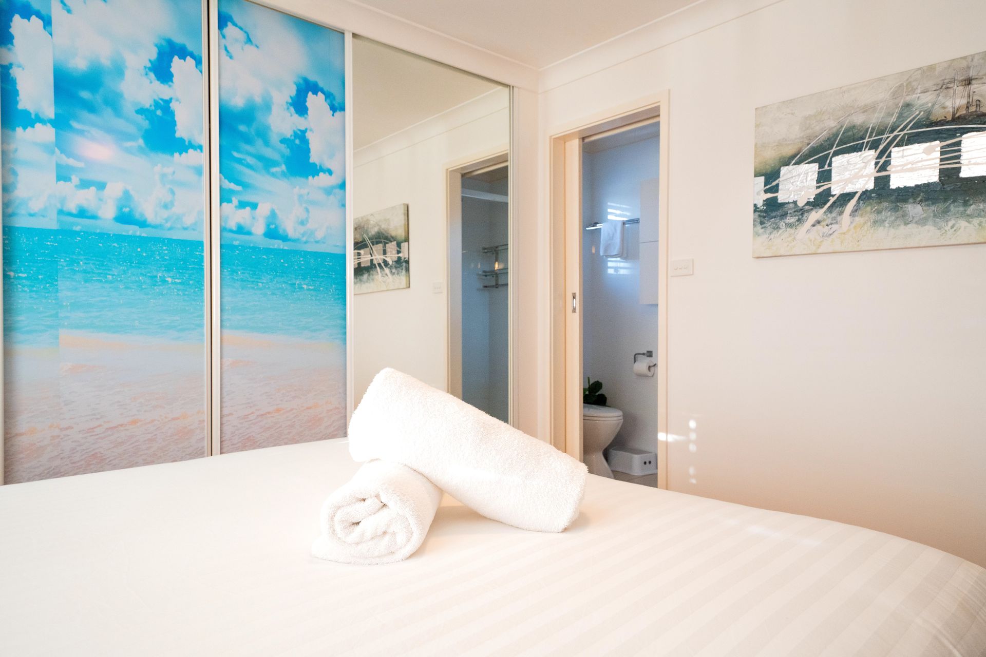 Bedroom 1 : Queen, En-suite, Air Conditioning, Built In Robe, Ceiling Fan, Smart TV