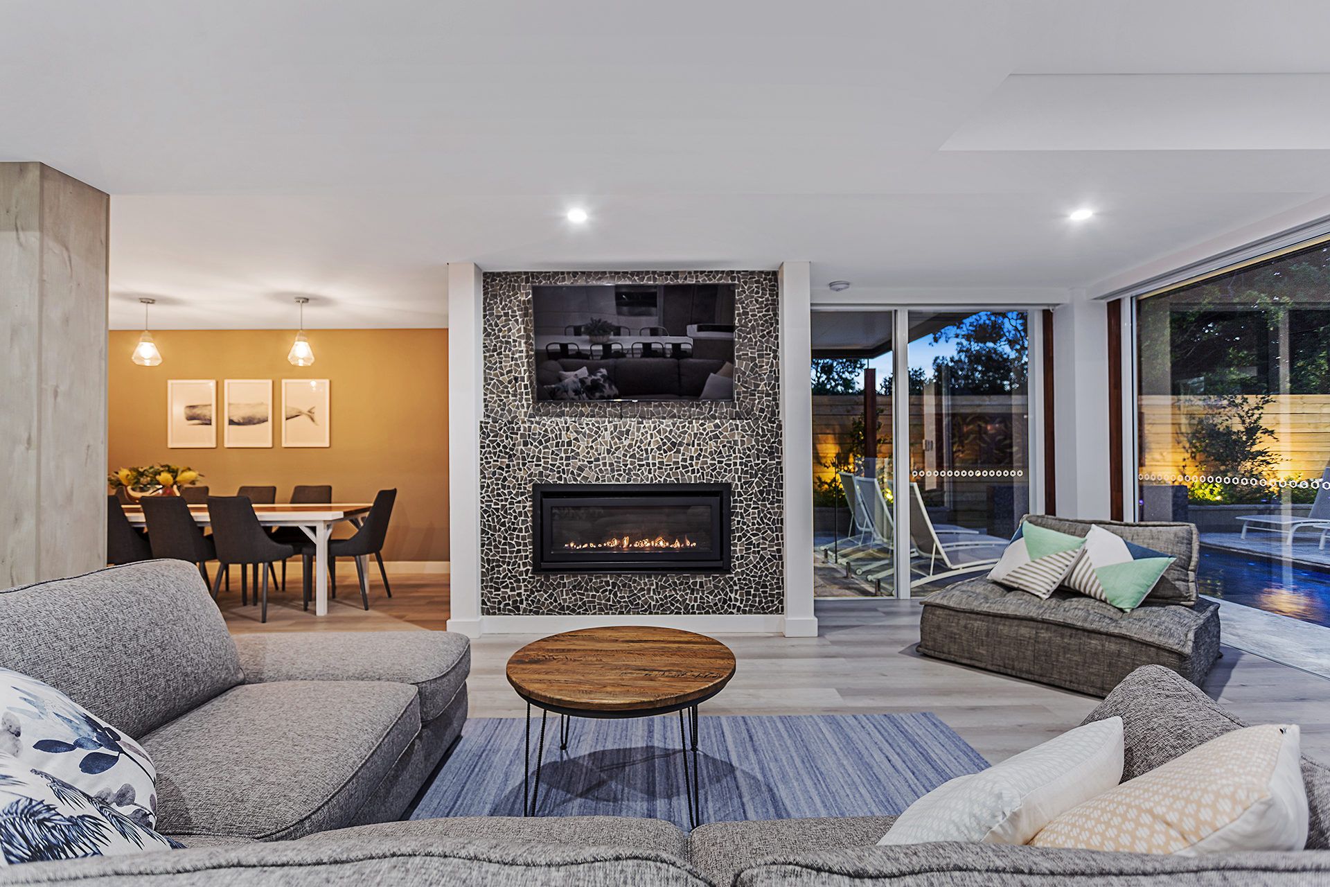 The open-plan living area has a large wall-mounted Smart TV with Netflix, fireplace, corner lounge, ducted air-conditioning and electric remote-control operated blinds. The large lounge caters for 5-6 as well as room for extra seating on the separate ottoman style lounge.
