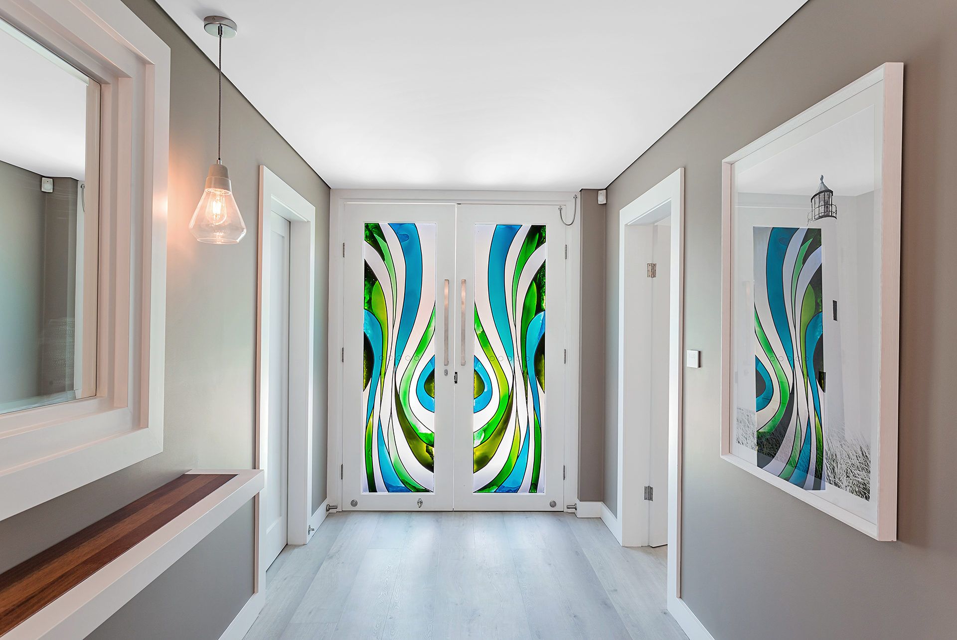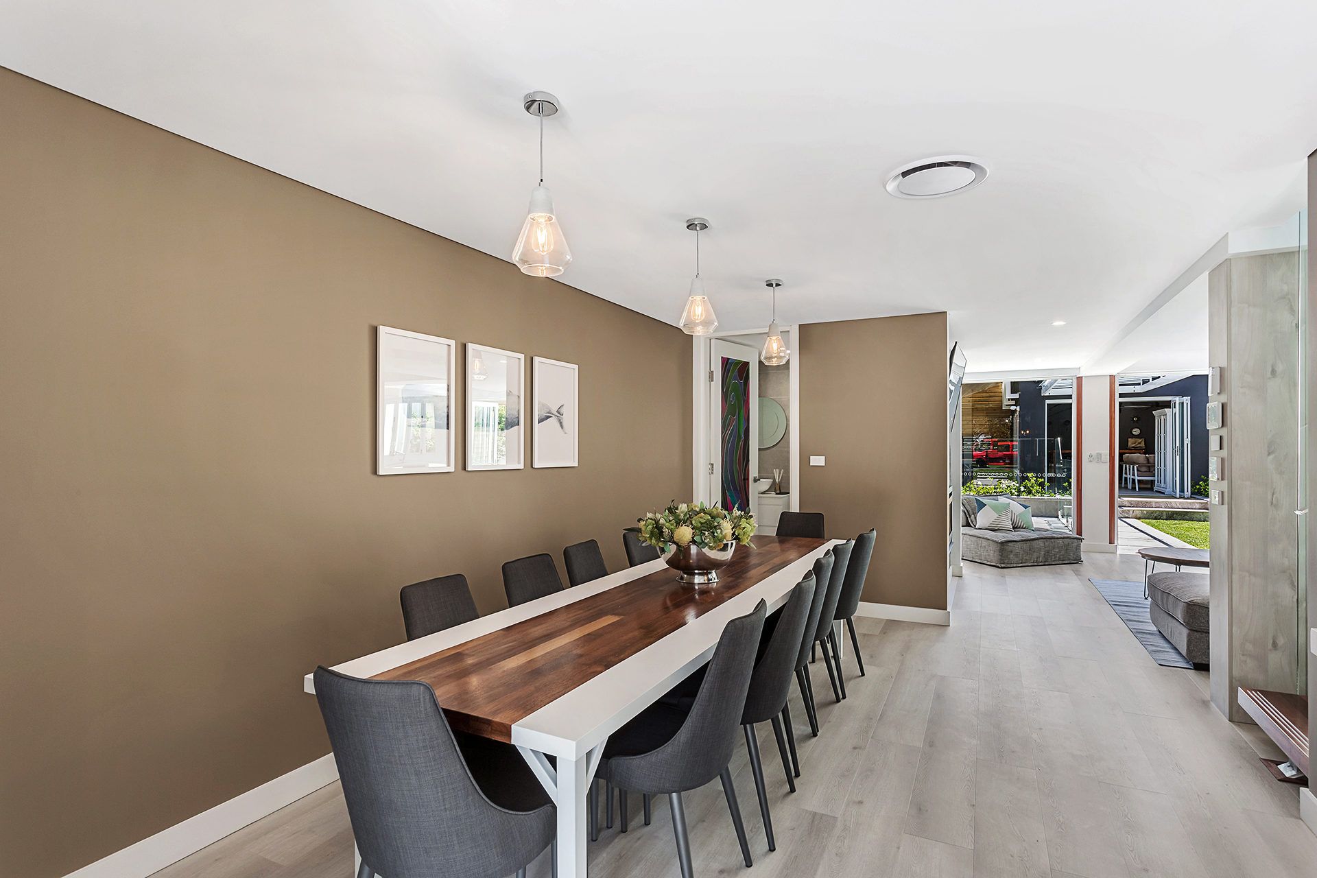 As you enter the first level you will find the master bedroom as well as the living, dining and kitchen areas which flow out to the outdoor entertaining spaces. In the dining area, there is an extra-large 12-seater custom made dining table surrounded by stunning artwork as well as cushioned seating and ducted air-conditioning.