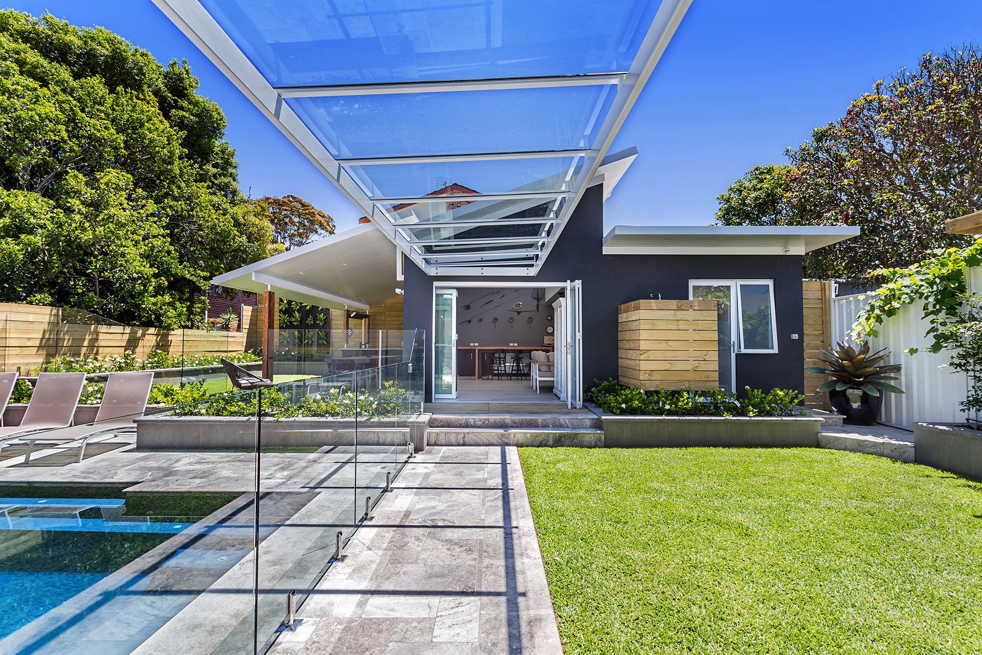 Now we come to one of the most impressive areas of the property, the pool house. This incredibly designed space is surrounded by glass bi-fold doors allowing it to flow out to the multiple outdoor entertaining areas. The pool house features a full bar with ample fridge space, bar table with seating for 6, bathroom, large corner lounge with seating for 6-8, ping pong table, heater, ceiling fan and wall-mounted Smart TV with Netflix. Guests can also enjoy a selection of board games for the family or kids, as well as an array of books to choose from.