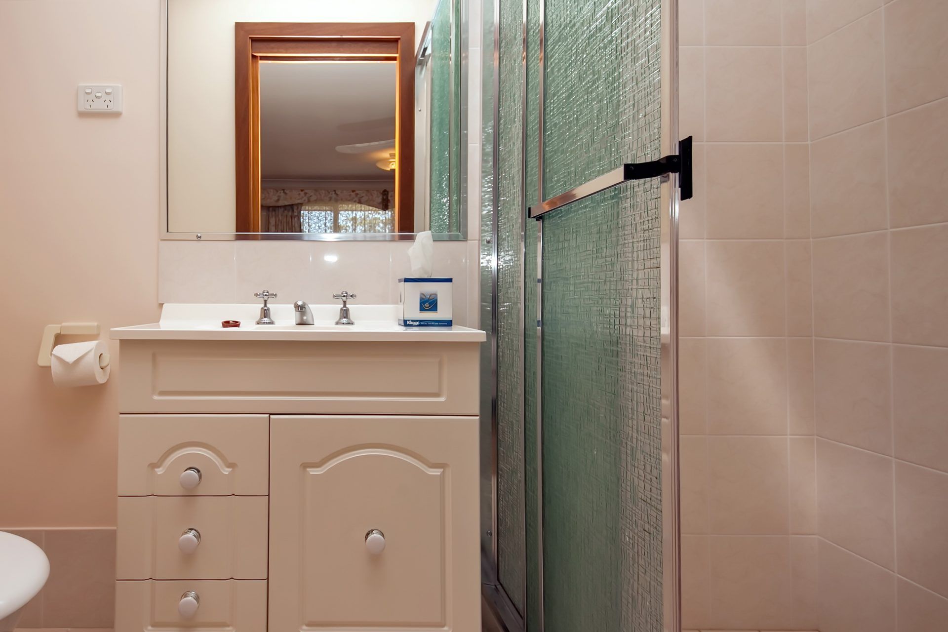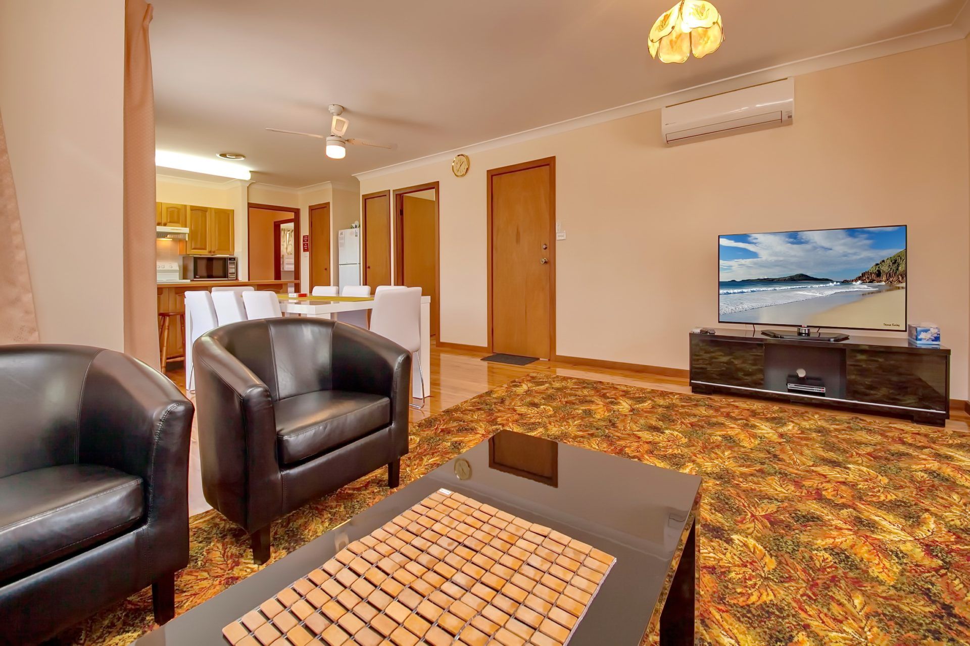 The House - This single level house has timber floors throughout, an air conditioned living area with a flascreen TV and DVD player, a dining area with ceiling fan and a fully equipped kitchen with a microwave, upright stove and dishwasher. Three bedrooms, main with a ceiling fan and queen bed, the second bedroom with two sets of bunk beds and the third with a sofa bed and extra flat screen TV, main bathroom and ensuite with showers (no baths) and an internal laundry with a washer (no dryer). There is also secure parking in a single lock up garage plus an off street car space.