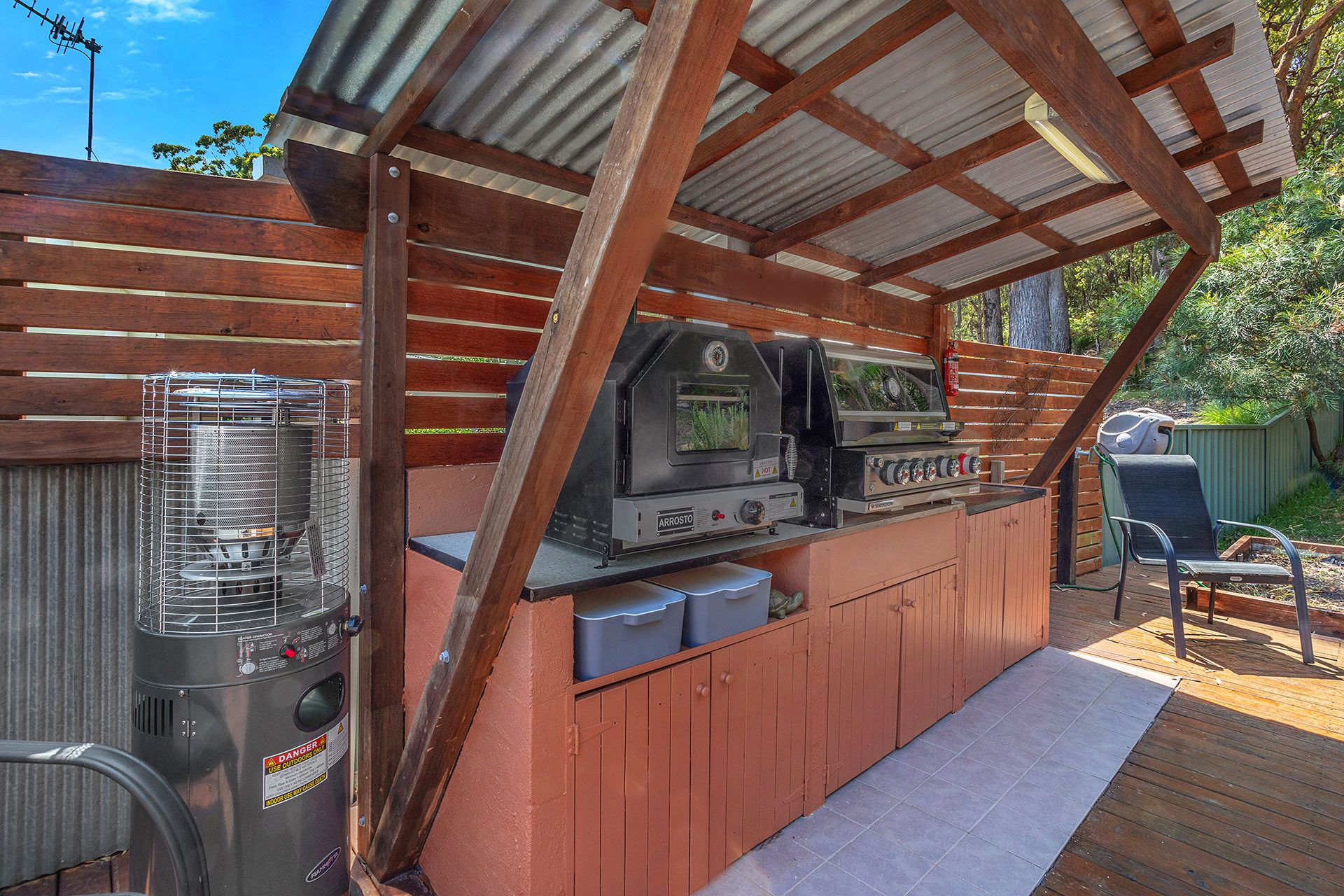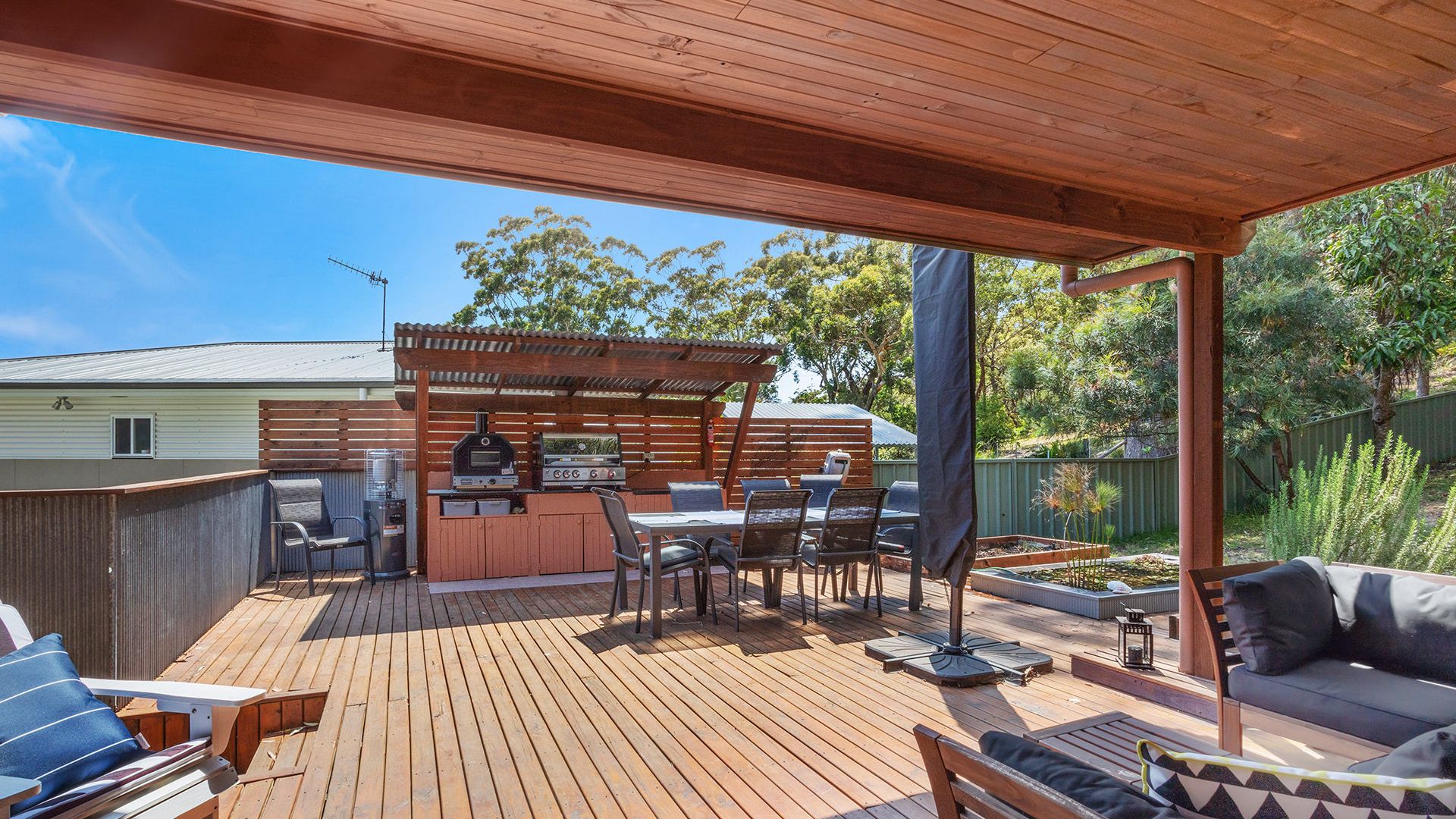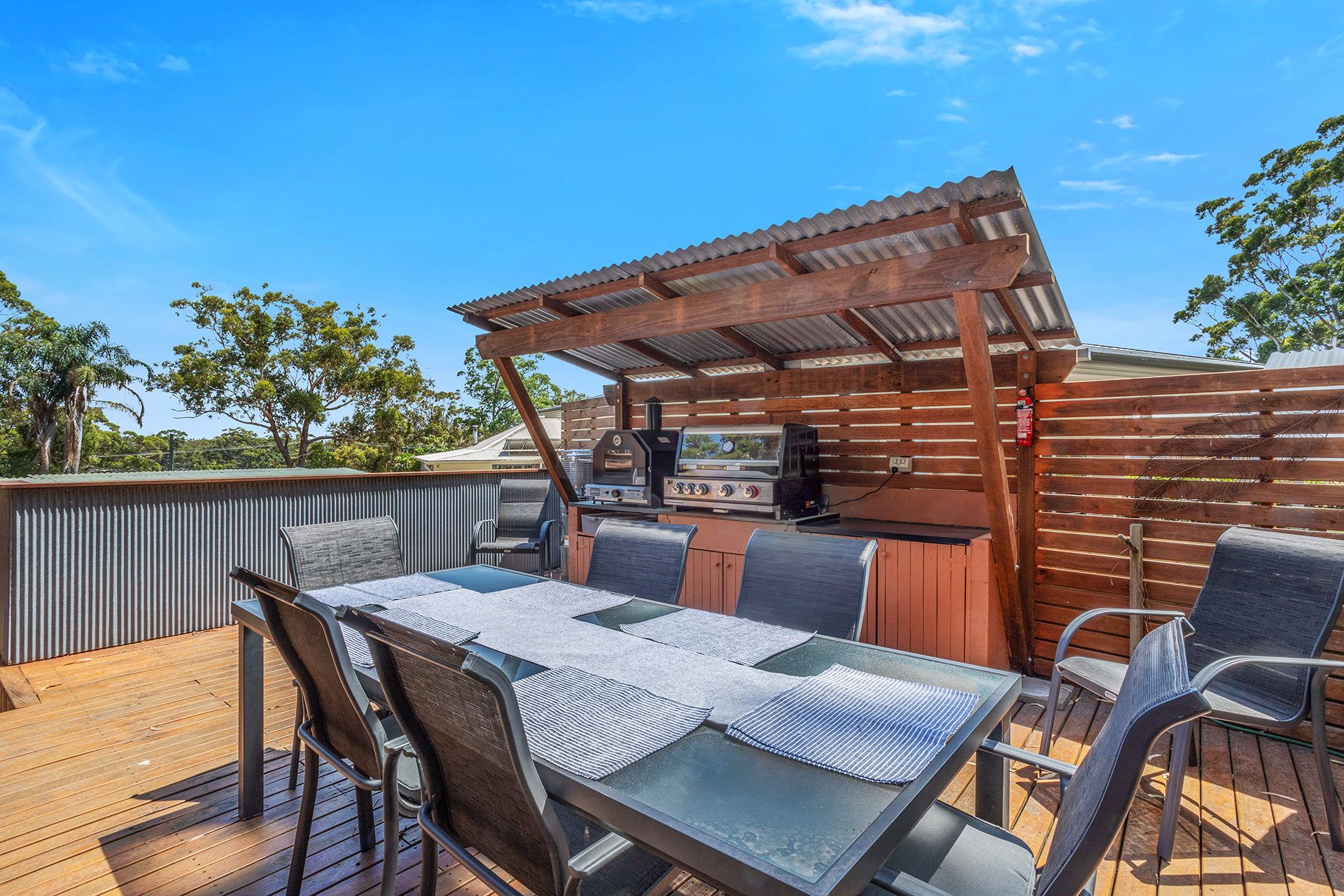 Upstairs is emphasized by natural light and high beamed ceilings, creating a warm and spacious environment. The open plan living and dining area provides plenty of space for carefree entertaining, with the lounge room offering a 55 inch flat screen smart TV, Google Chrome cast, sound bar, ceiling fans, unlimited Wi-Fi and Tomaree Mountain views. The well equipped kitchen includes a dishwasher, large oven, gas stove, coffee machine and plenty of bench space. Bi-fold doors open out to an air conditioned family room with more seating and another smart TV which form the basis of a peaceful and quiet retreat sprawling onto an expansive timber deck (partially covered) for summer BBQ's and alfresco dining. The deck offers outdoor furnishings, gas BBQ, pizza oven and outdoor heating for the cooler nights, this area leads out to a fenced grassed backyard with private access into the National Park and beaches.