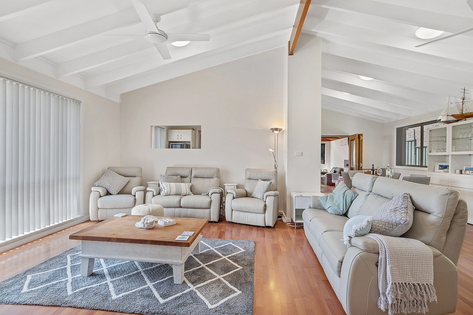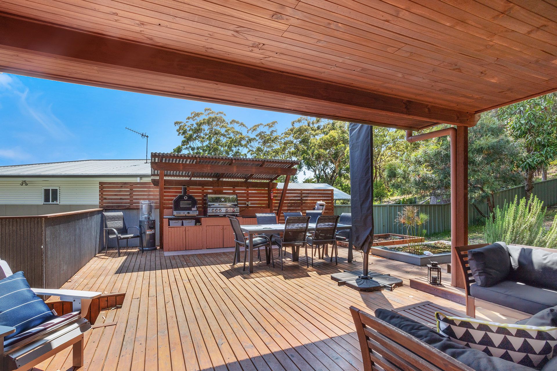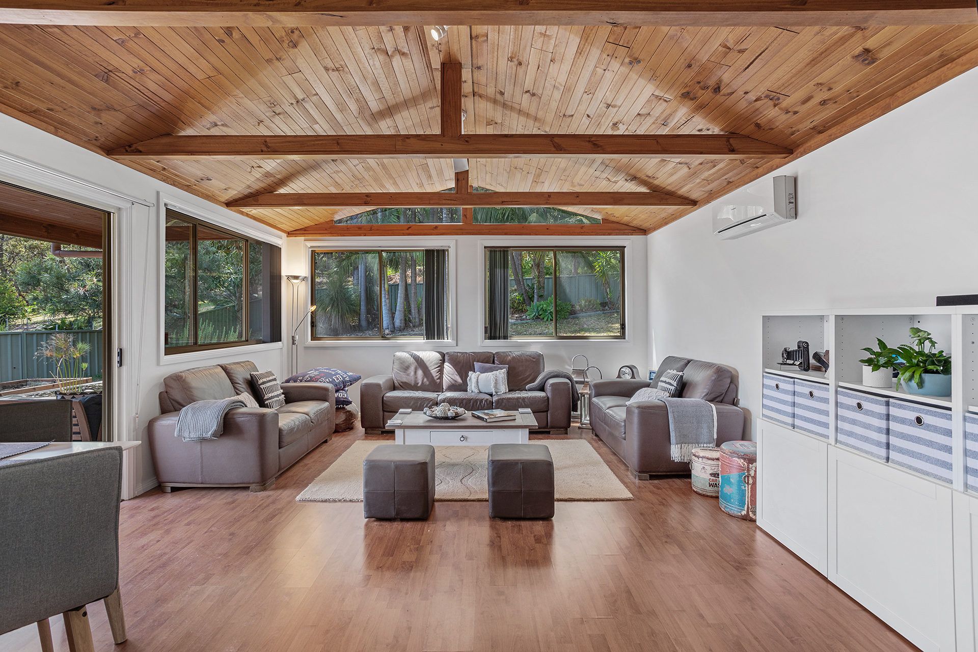 Upstairs is emphasized by natural light and high beamed ceilings, creating a warm and spacious environment. The open plan living and dining area provides plenty of space for carefree entertaining, with the lounge room offering a 55 inch flat screen smart TV, Google Chrome cast, sound bar, ceiling fans, unlimited Wi-Fi and Tomaree Mountain views. The well equipped kitchen includes a dishwasher, large oven, gas stove, coffee machine and plenty of bench space. Bi-fold doors open out to an air conditioned family room with more seating and another smart TV which form the basis of a peaceful and quiet retreat sprawling onto an expansive timber deck (partially covered) for summer BBQ's and alfresco dining. The deck offers outdoor furnishings, gas BBQ, pizza oven and outdoor heating for the cooler nights, this area leads out to a fenced grassed backyard with private access into the National Park and beaches.