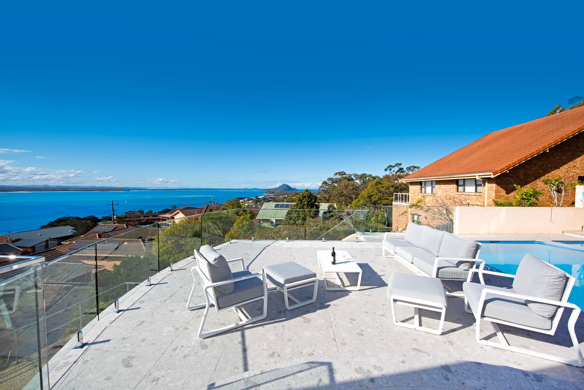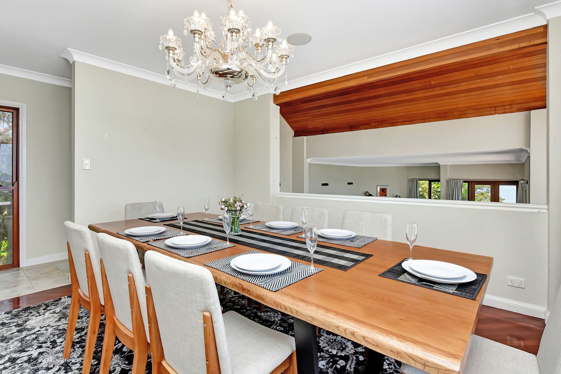 Inside, you’ll find two spacious lounge rooms and a well-equipped bar, perfect for entertaining. The formal dining area offers a sophisticated setting for meals while taking in panoramic bay views. Indoor-outdoor flow is seamless with the design wrapping around a large, elevated deck which incorporates a swimming pool, outdoor dining and lounge. Relax by the pool or enjoy a barbecue with the stunning backdrop of the bay. Please note that the property is located on a steep hillside, with parts of the driveway at a 45-degree angle. Off-street parking is provided in a designated bay, with steps leading up to the front door.