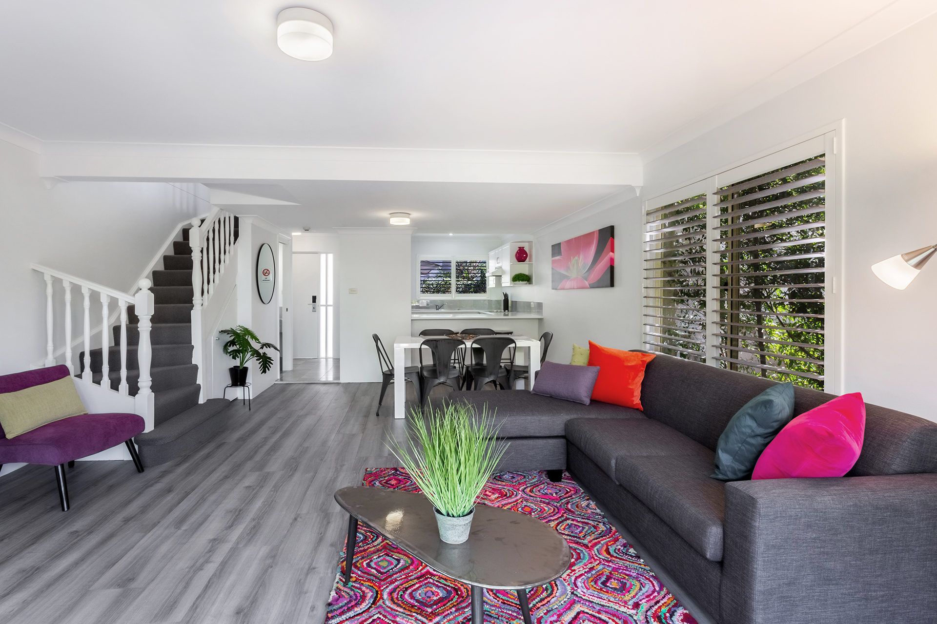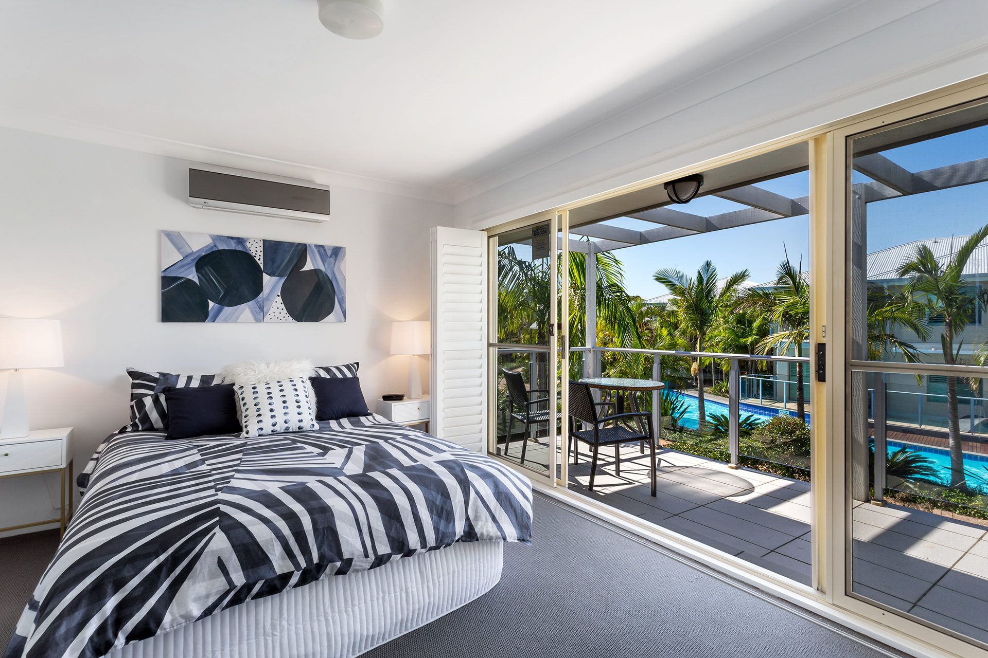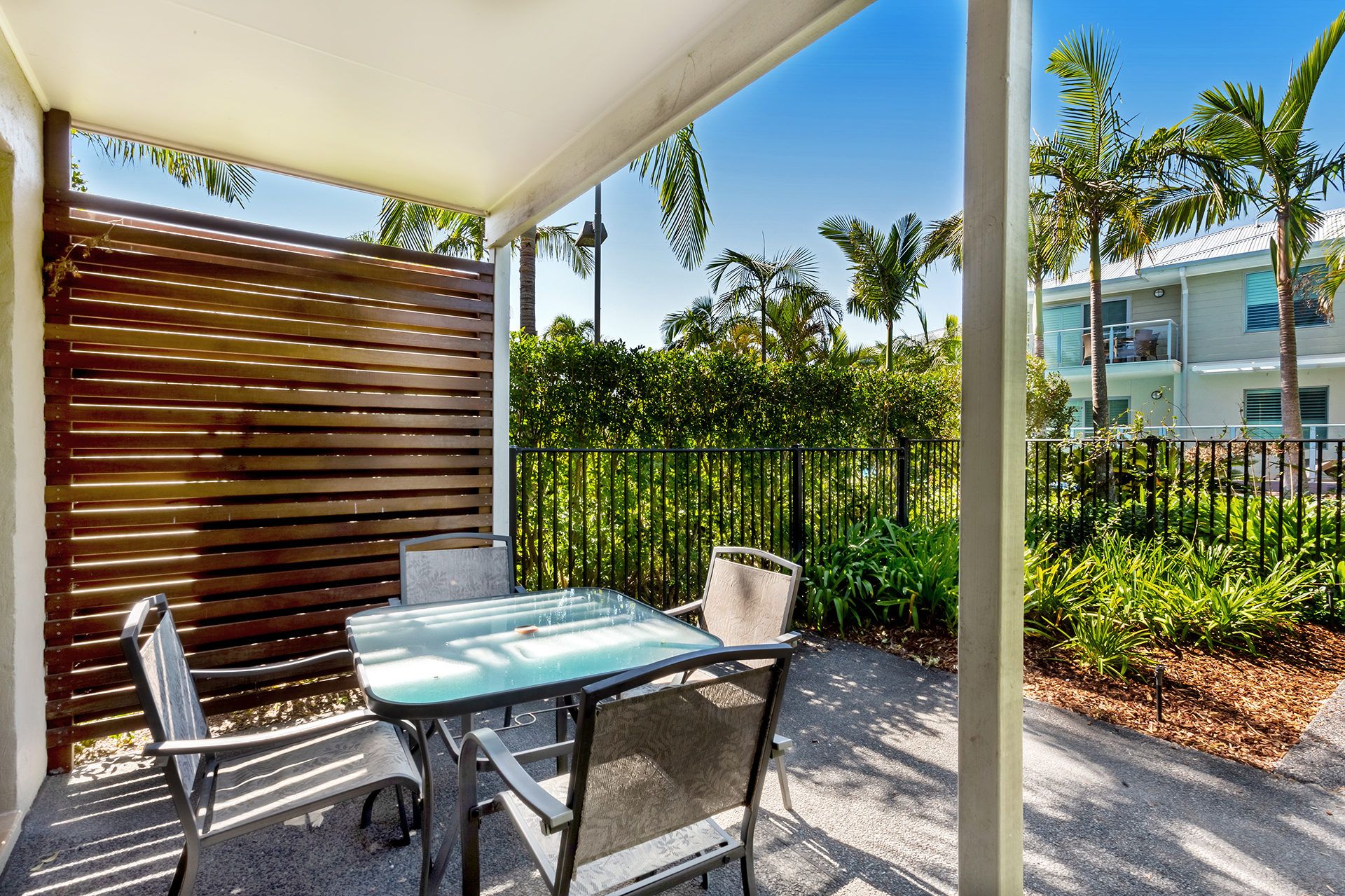 This vibrant 2-level townhouse overlooks the pool from the first floor balcony. The lower level has an air-conditioned living area with a flat screen TV and DVD player, a 6-seater dining table and a kitchen with dishwasher, microwave, oven and cooktop, plus a powder room. The upper level has 2 air-conditioned bedrooms. The main bedroom has queen bed and private balcony overlooking the pool and gardens, while the second bedroom has 2 single beds, and the sleek bathroom offers a spa bath and separate shower. There is also an enclosed, private courtyard, and a single carport for undercover parking.