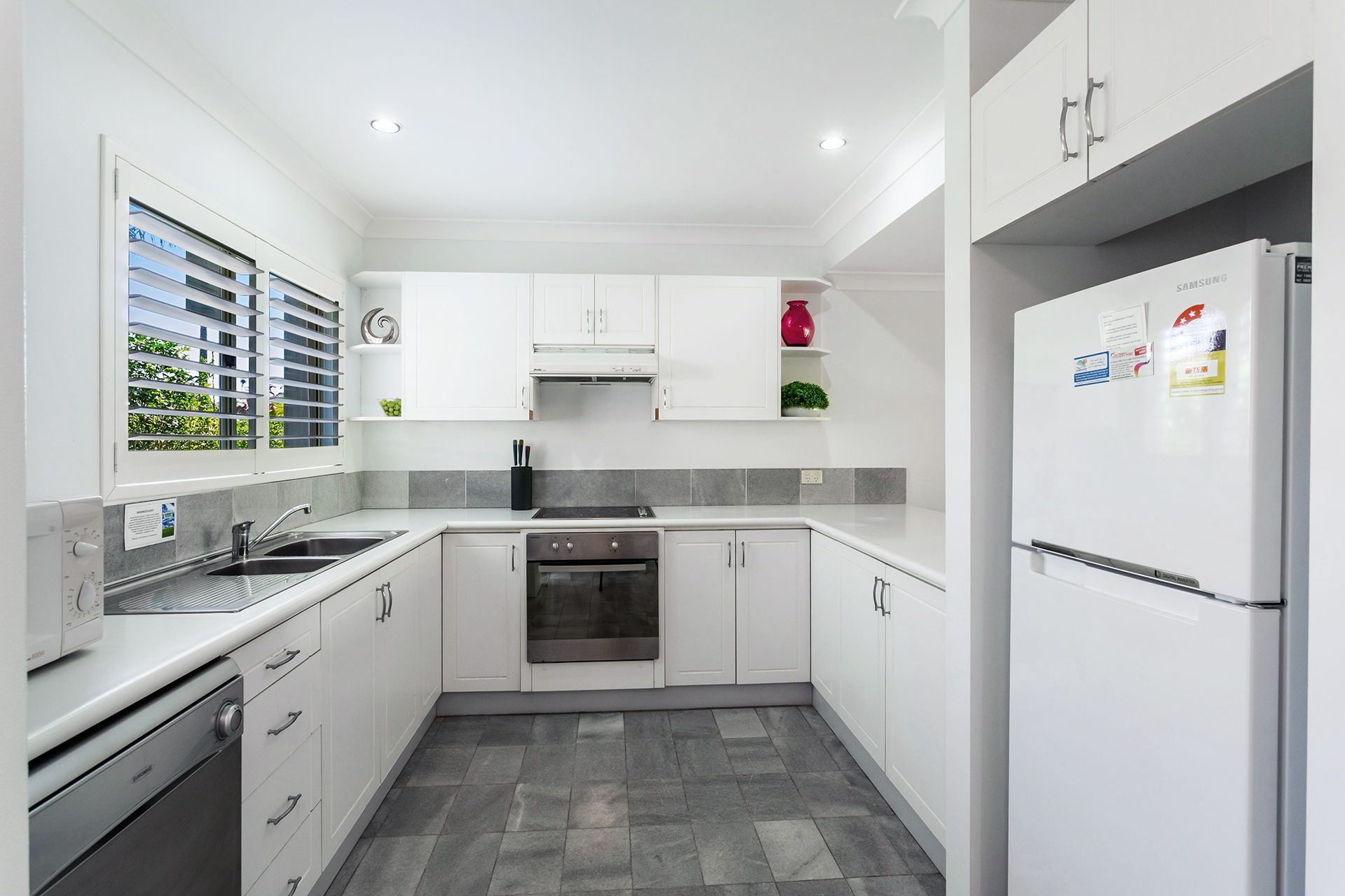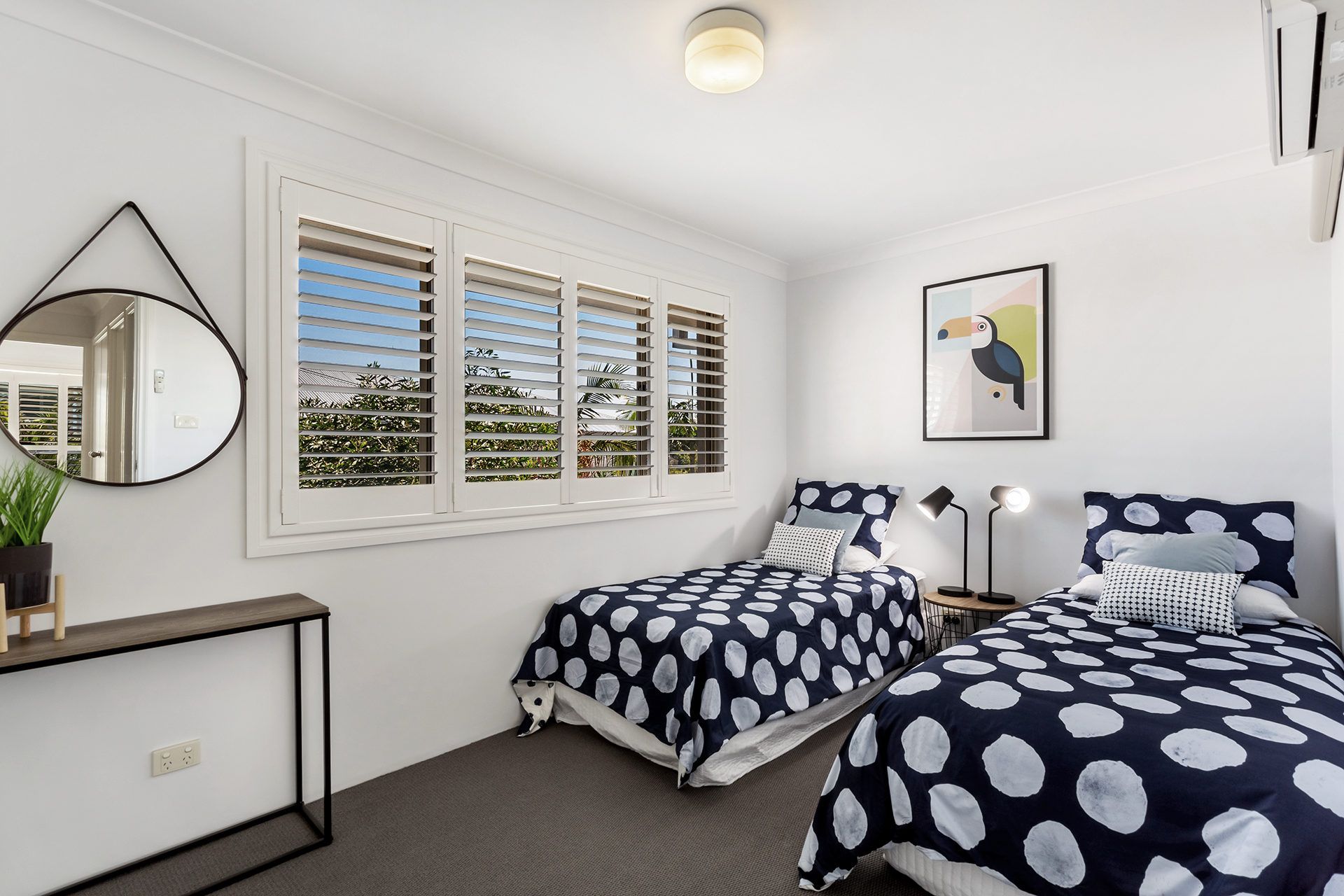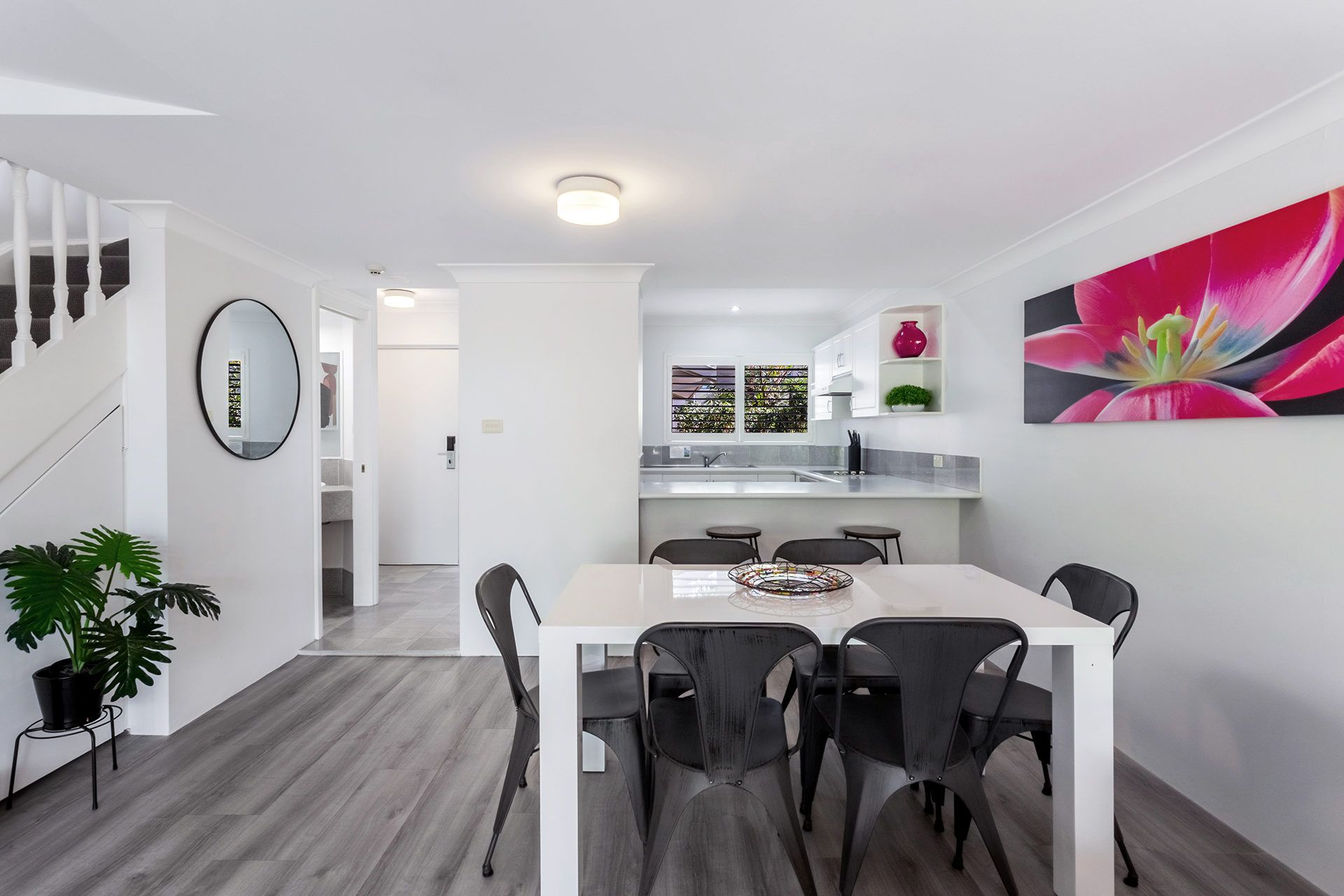 This vibrant 2-level townhouse overlooks the pool from the first floor balcony. The lower level has an air-conditioned living area with a flat screen TV and DVD player, a 6-seater dining table and a kitchen with dishwasher, microwave, oven and cooktop, plus a powder room. The upper level has 2 air-conditioned bedrooms. The main bedroom has queen bed and private balcony overlooking the pool and gardens, while the second bedroom has 2 single beds, and the sleek bathroom offers a spa bath and separate shower. There is also an enclosed, private courtyard, and a single carport for undercover parking.
