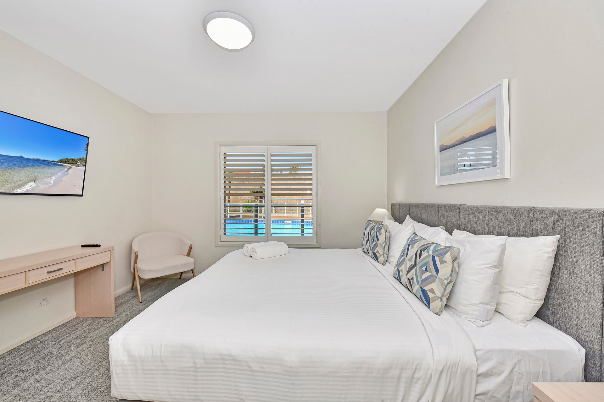 Bedroom 1 : King Split, Television, Study Desk, Air Conditioning, Balcony Access, Courtyard Access, Built In Robe, Private