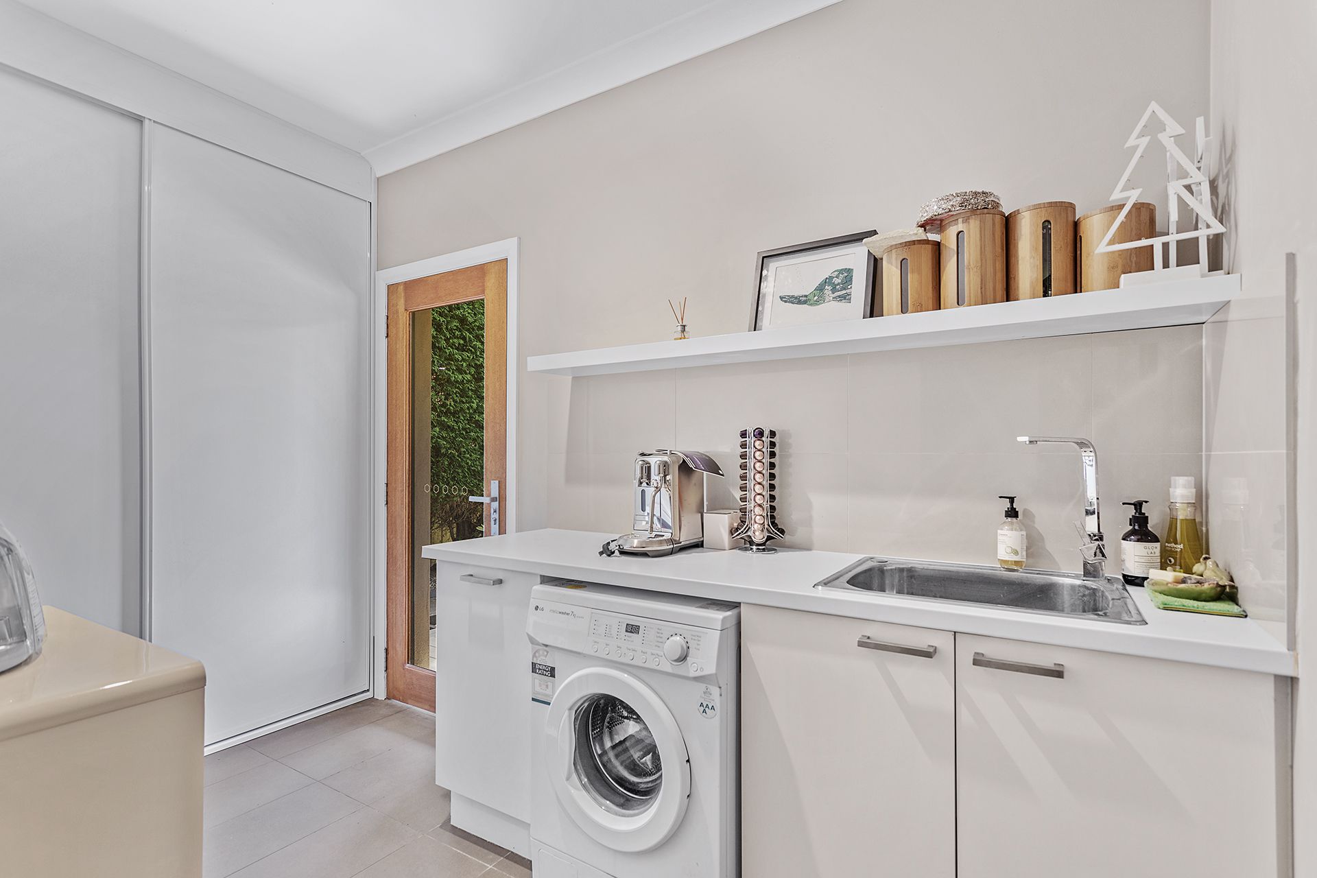 There is a small laundry room with an extra sink, further bench top space, a washing machine and there is a clothesline in the backyard. Due to the driveway being steep there is a railing on the side, and the garage is for owner use only. There is parking available in the quiet street.
