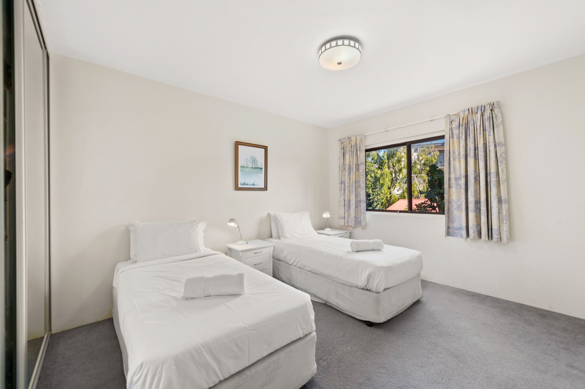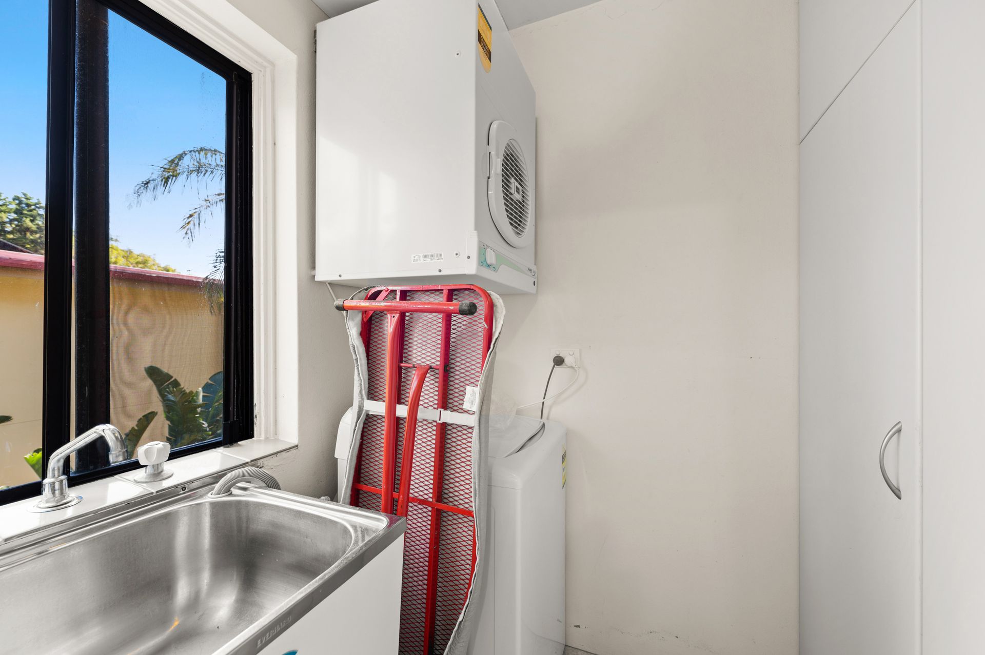 There are 2 lovely bedrooms with built-in robes and pedestal fans; one offers a queen bed and balcony access, and the other has 2 twin beds. The bathroom has a bathtub, walk-in shower and a toilet, and the internal laundry has a washing machine, dryer and ironing facilities. Parking is available for 2 vehicles with one in a secure, single garage and the other an off-street space.