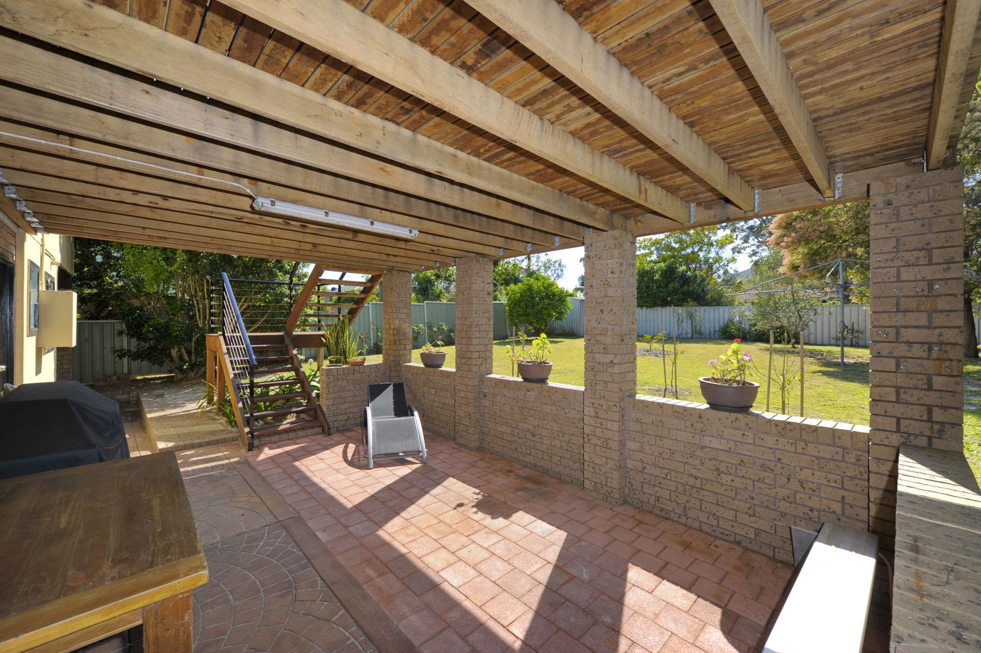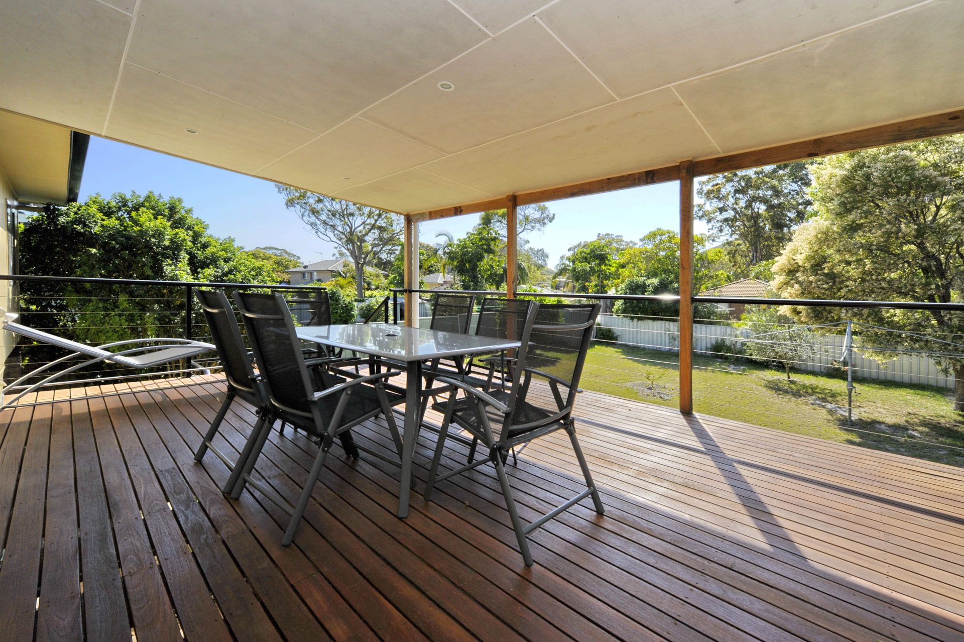 The cottage's entrance is at the rear, where external stairs lead up to a spacious, air-conditioned open-plan living and dining area. The well-equipped kitchen includes a dishwasher, oven, fridge/freezer, and microwave, perfect for preparing meals during your stay. This floor also features the main bathroom, which includes a shower and a separate toilet. The living area opens out to a front balcony, providing a refreshing sea breeze, while the rear deck is ideal for entertaining, offering views of the large, fully fenced yard.