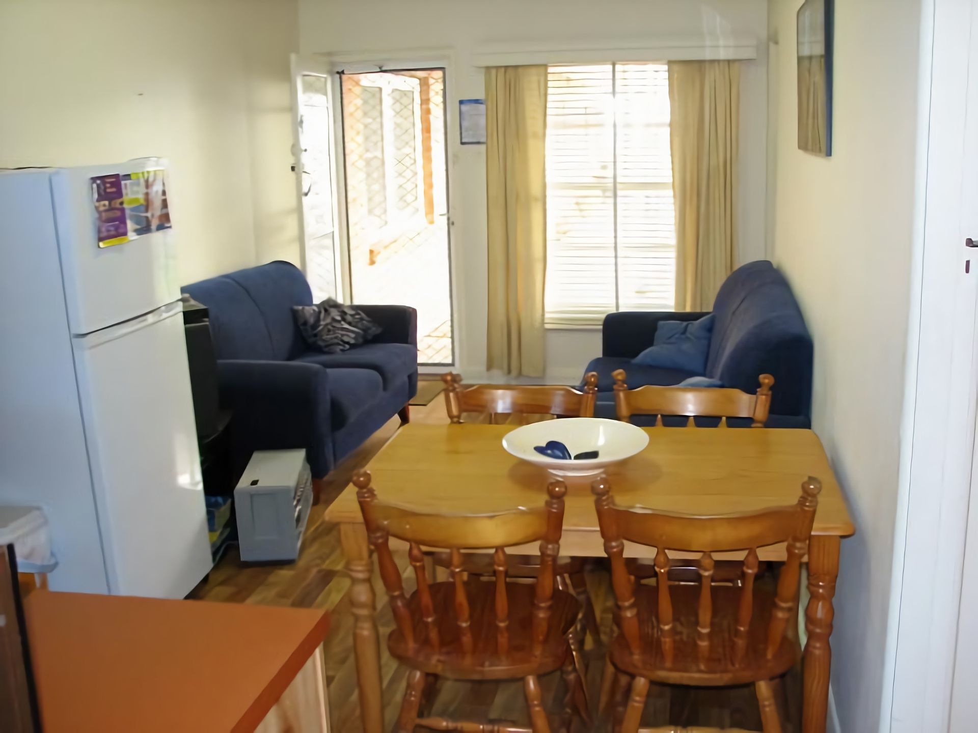 The Unit - This neat and tidy small two bedroom unit is comfortable and affordable.The combined lounge/dining/kitchen area offers 2 x two seater lounges with a medium sized TV, DVD, a wooden dining table and four chairs and a full sized fridge and microwave in the kitchen area. The bright main bedroom, while having older style furniture is comfortable with its four drawer dressing table and queen sized bed and built in robe. The 2nd bedroom offers a single bed as well as a set of bunks in solid wood, a bedside table with lamp as well as a built in robe. The 2-way bathroom that is off the main living/dining area has a vanity washroom and the main part of the bathroom has a small sized corner bath with the shower of the top, the toilet and the washing machine. There is also a communal laundry with access to a coin operated washing machine. The open car space is located at the rear of the building and is accessible from Bullecourt Street.