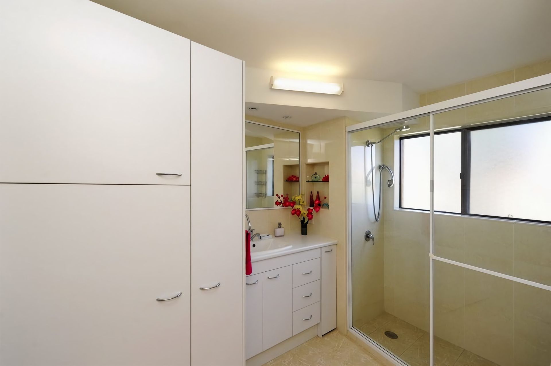 The modern tiled bathroom has a shower and vanity with the toilet located next door. Internal laundry with washing machine only. Off street parking only.