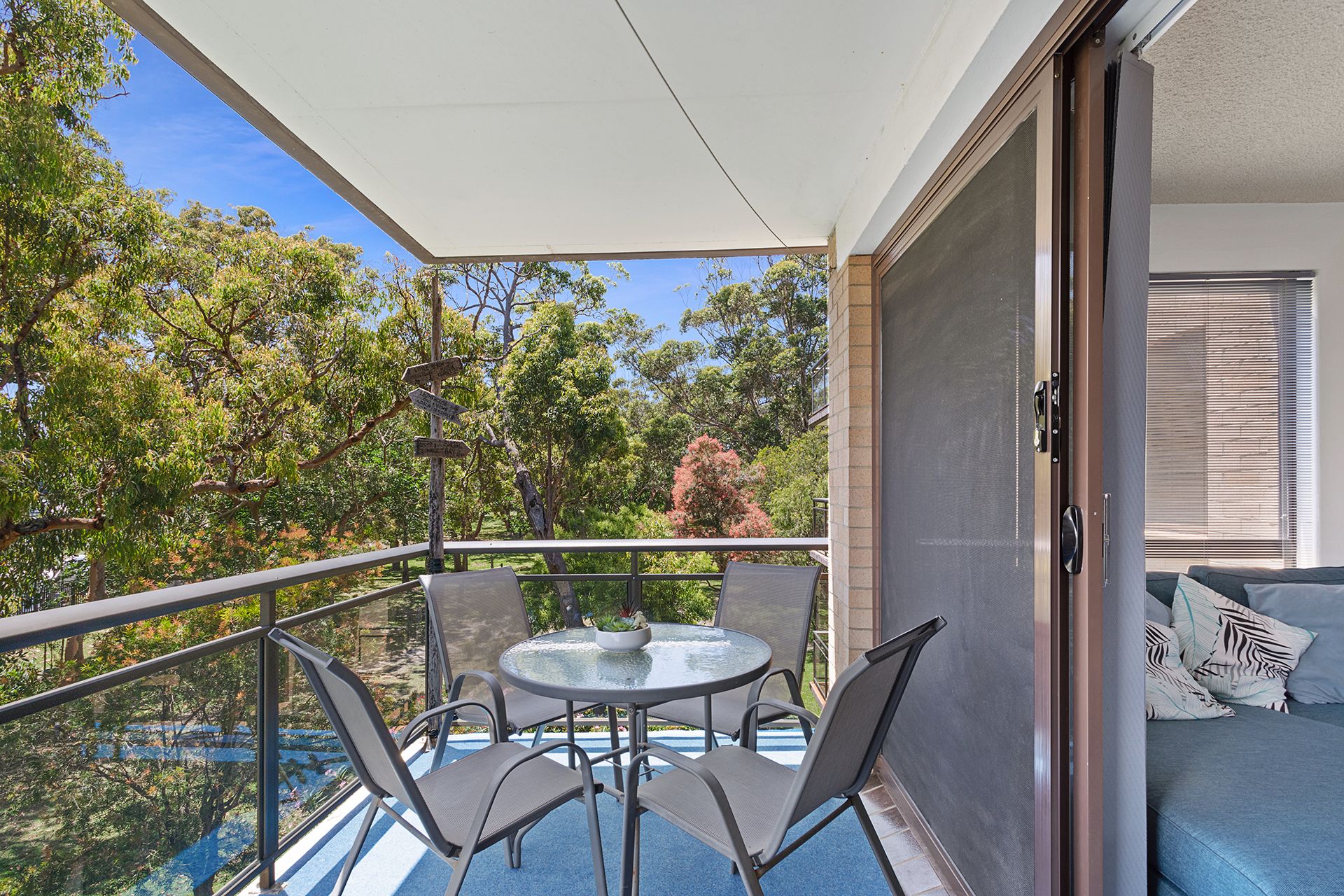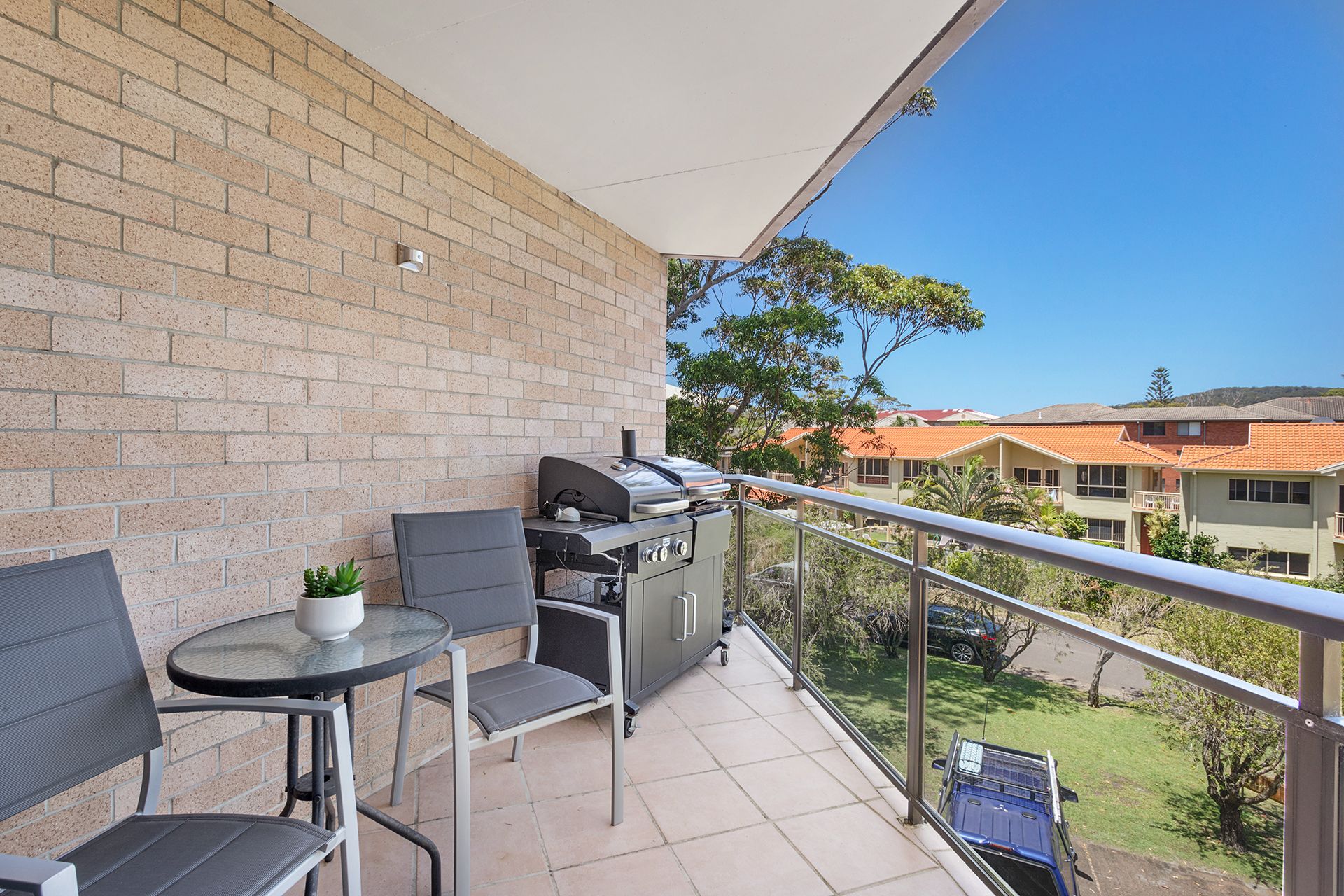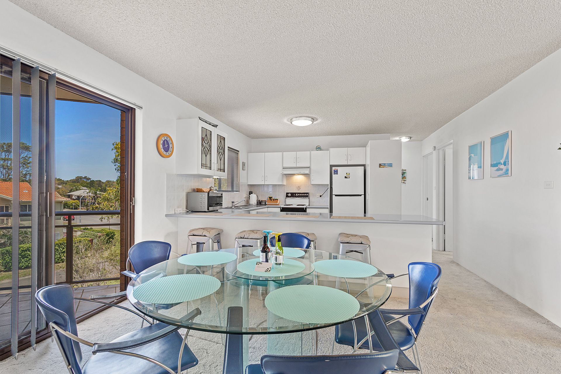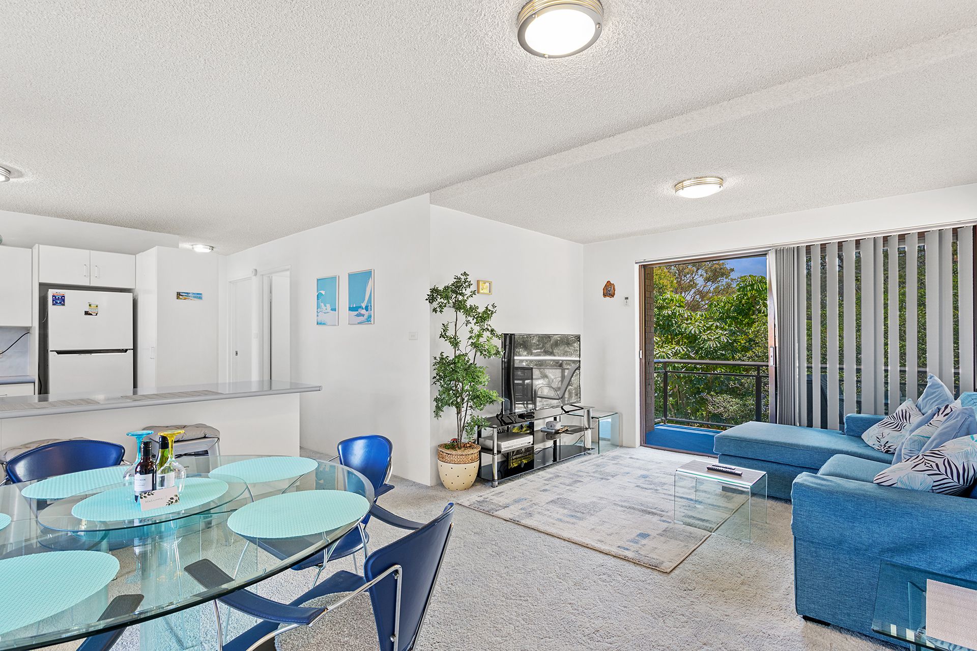 This second floor unit provides guests with spacious, light-filled interiors and partial water views from the balcony with an open, leafy outlook. The open plan living room offers contemporary furnishings including a comfy lounge, big screen Smart TV with free Wi-Fi, and a glass dining table, plus huge windows to capture sea breezes. The living space flows out to 2 covered balconies, one off the lounge area with an outdoor setting to enjoy alfresco dining, and the other off the dining area with a gas BBQ and seating. The well-equipped kitchen has a stove, microwave and full size fridge/freezer, affording guests the convenient option of preparing meals in this home away from home.
