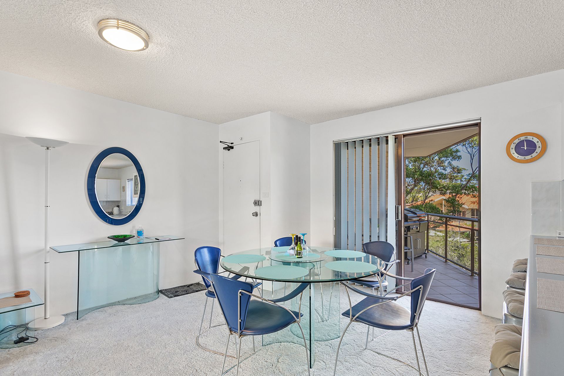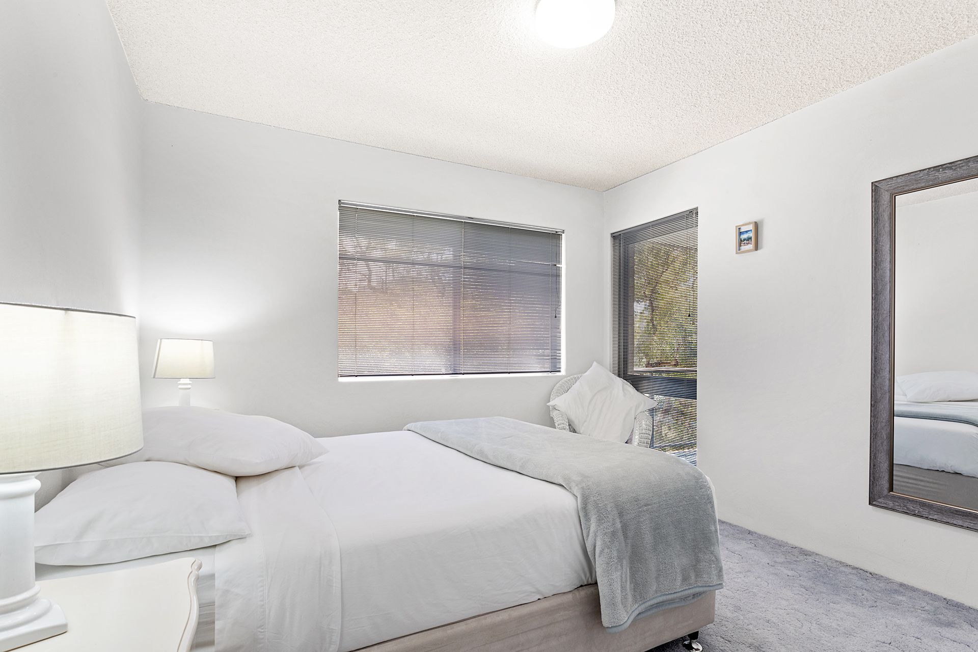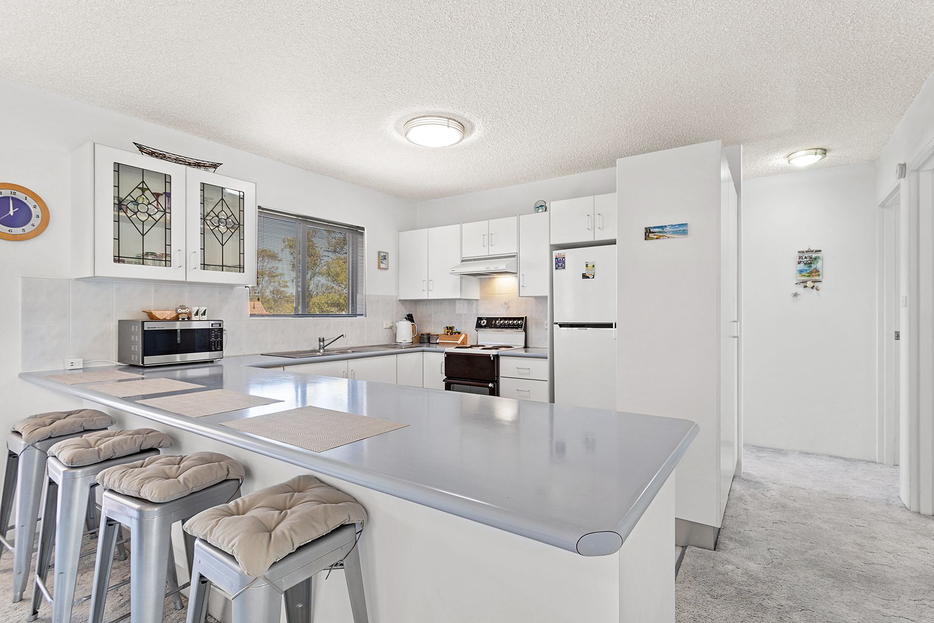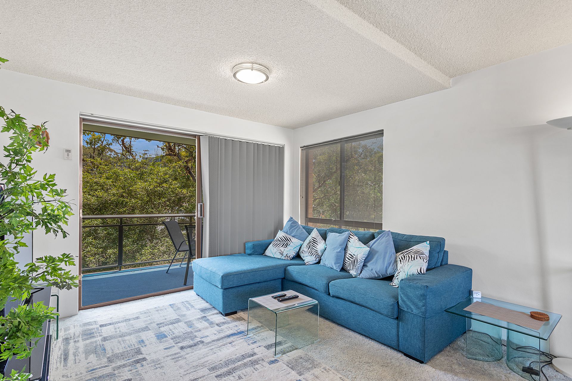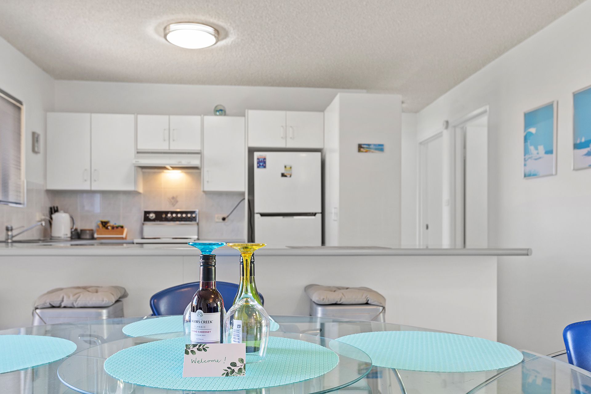 This second floor unit provides guests with spacious, light-filled interiors and partial water views from the balcony with an open, leafy outlook. The open plan living room offers contemporary furnishings including a comfy lounge, big screen Smart TV with free Wi-Fi, and a glass dining table, plus huge windows to capture sea breezes. The living space flows out to 2 covered balconies, one off the lounge area with an outdoor setting to enjoy alfresco dining, and the other off the dining area with a gas BBQ and seating. The well-equipped kitchen has a stove, microwave and full size fridge/freezer, affording guests the convenient option of preparing meals in this home away from home.