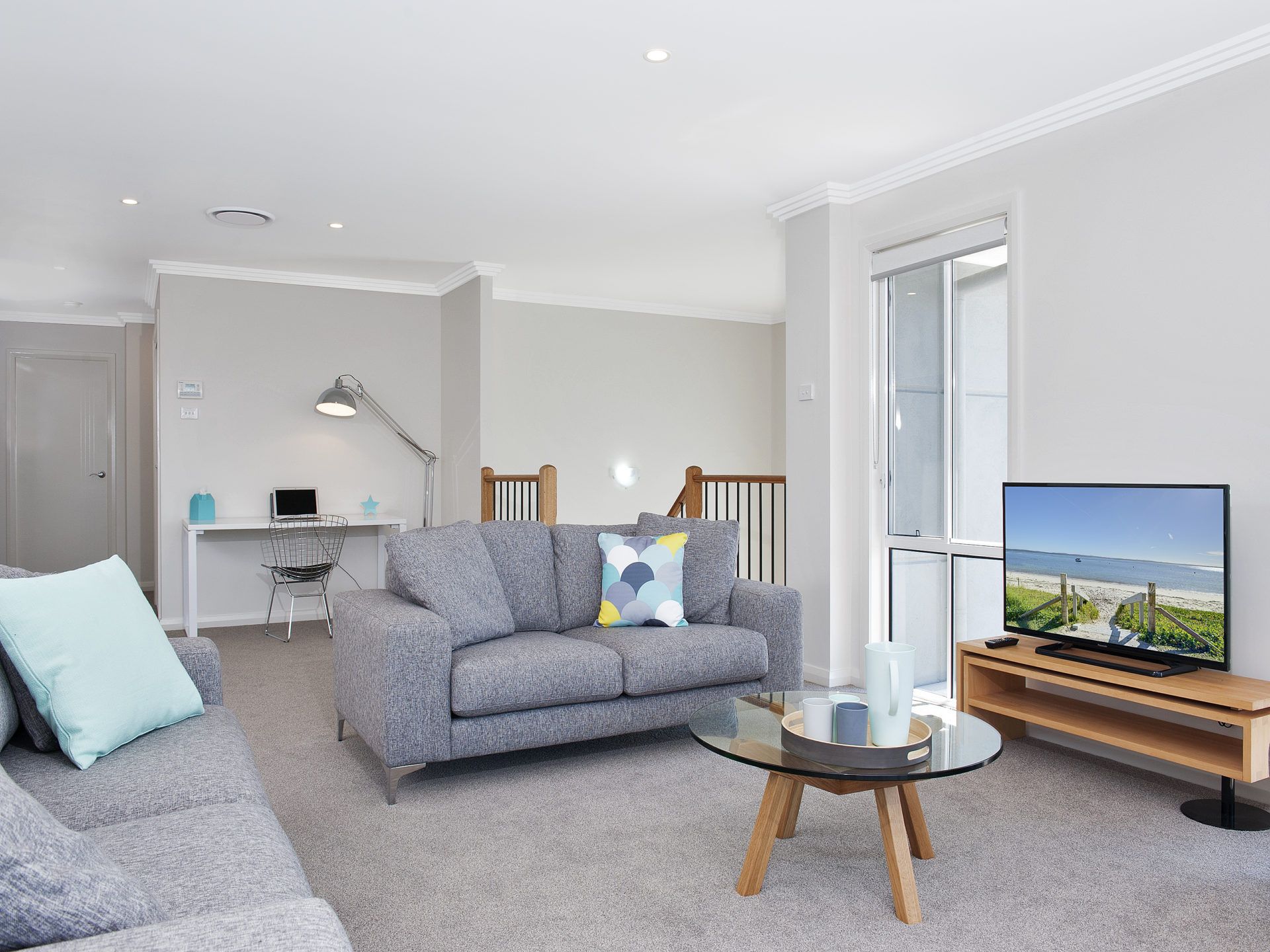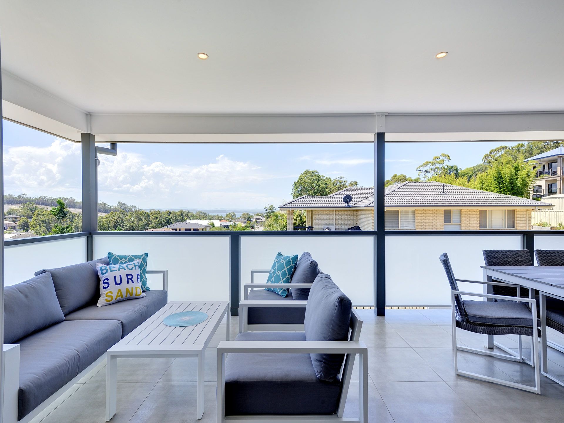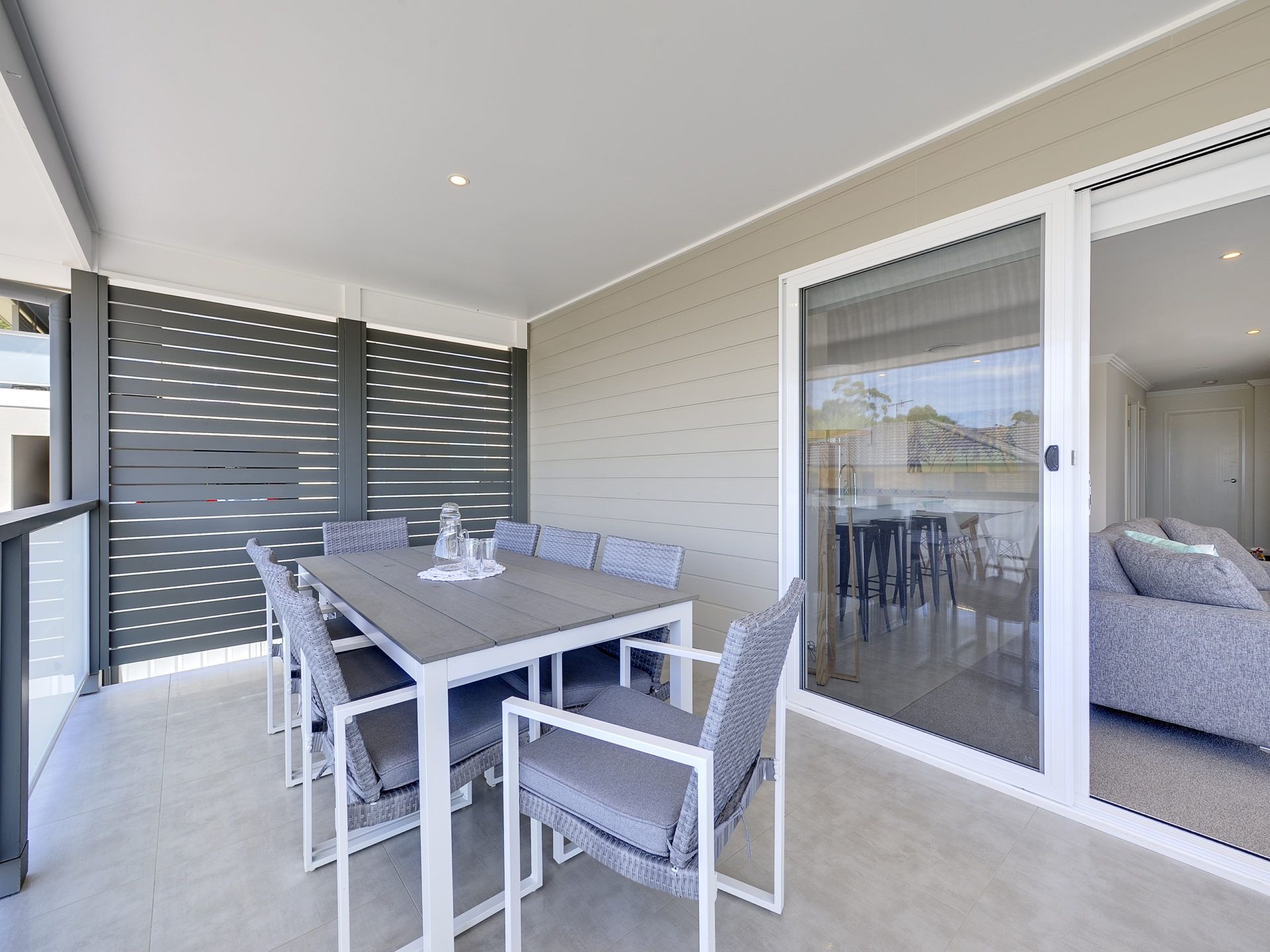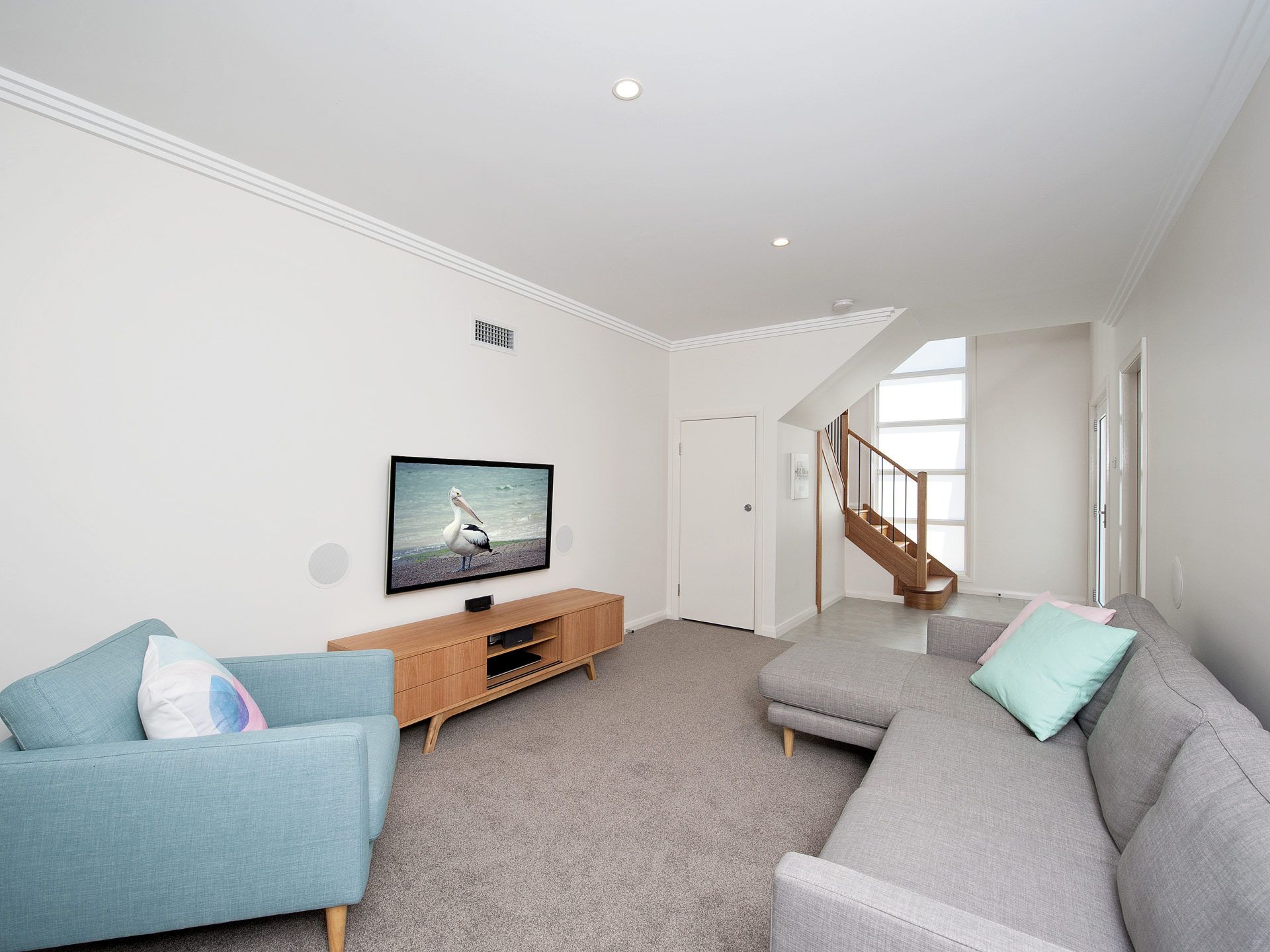 The House - You will not be disappointed when staying at this beautifully designed and appointed home. From the state of the art kitchen space to the impeccable bathrooms, offering plenty of room for the whole family. The property features a spacious living & dining area that joins the kitchen on the first floor, combining to provide a large open plan space that leads to a private undercover balcony with tasteful outdoor furnishings. From the balcony you can enjoy the views of the water and beyond to the mountains in the distance. The house is fitted with down lights and ducted air conditioning throughout. The sitting area is carpeted with a modern lounge suite, flat screen TV and a study zone. The modern fully equipped kitchen comes fitted with wall oven, gas stove top, microwave, fridge/freezer and dishwasher plus bar stools at the kitchen bench. The dining area provides a glass table and stylish bucket chairs. Continuing on the first floor is the main bathroom with a free standing bath, glass shower, double vanity with the toilet located separately. The laundry is next door to the bathroom which then leads out to an open deck which houses the BBQ and a clothes line.