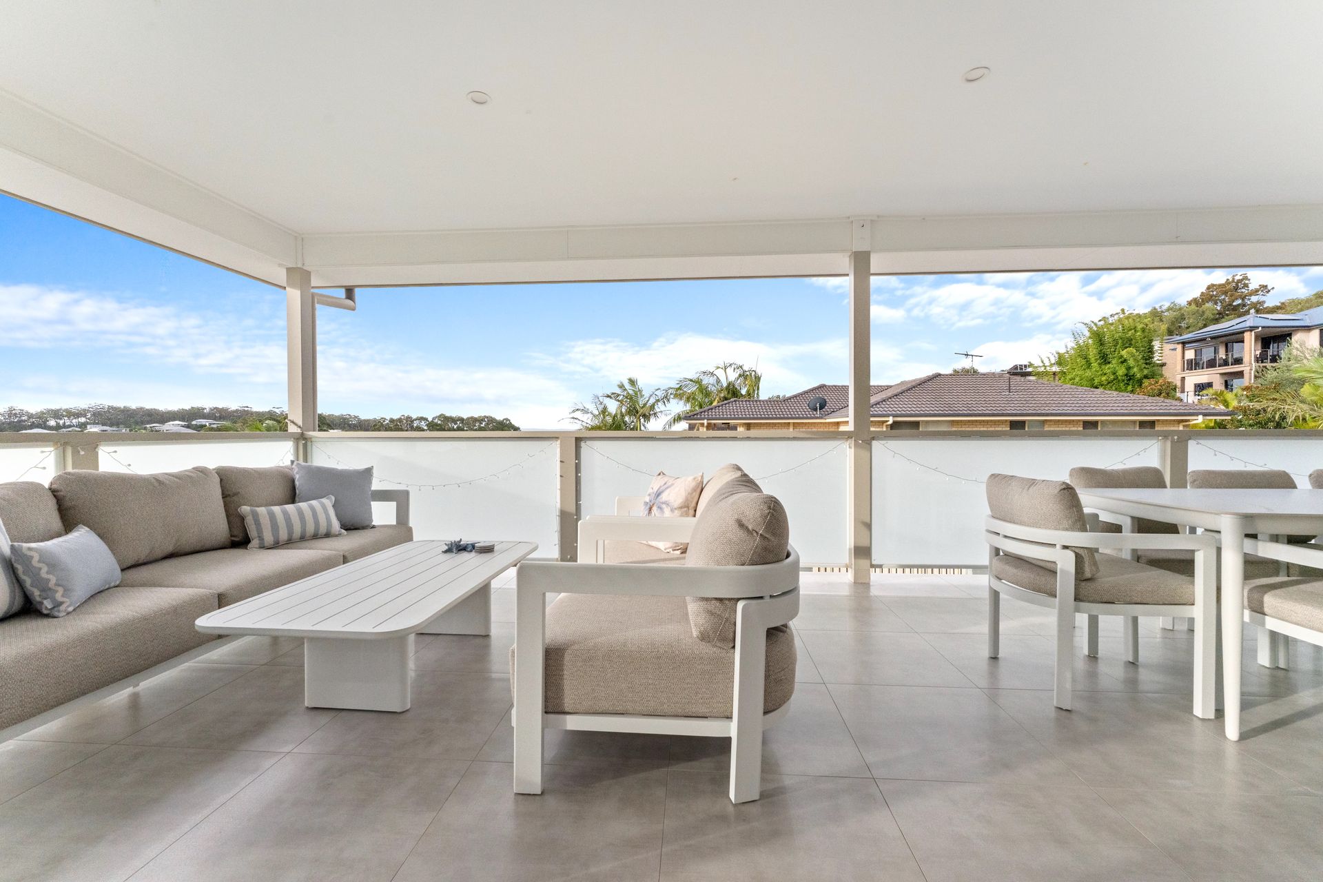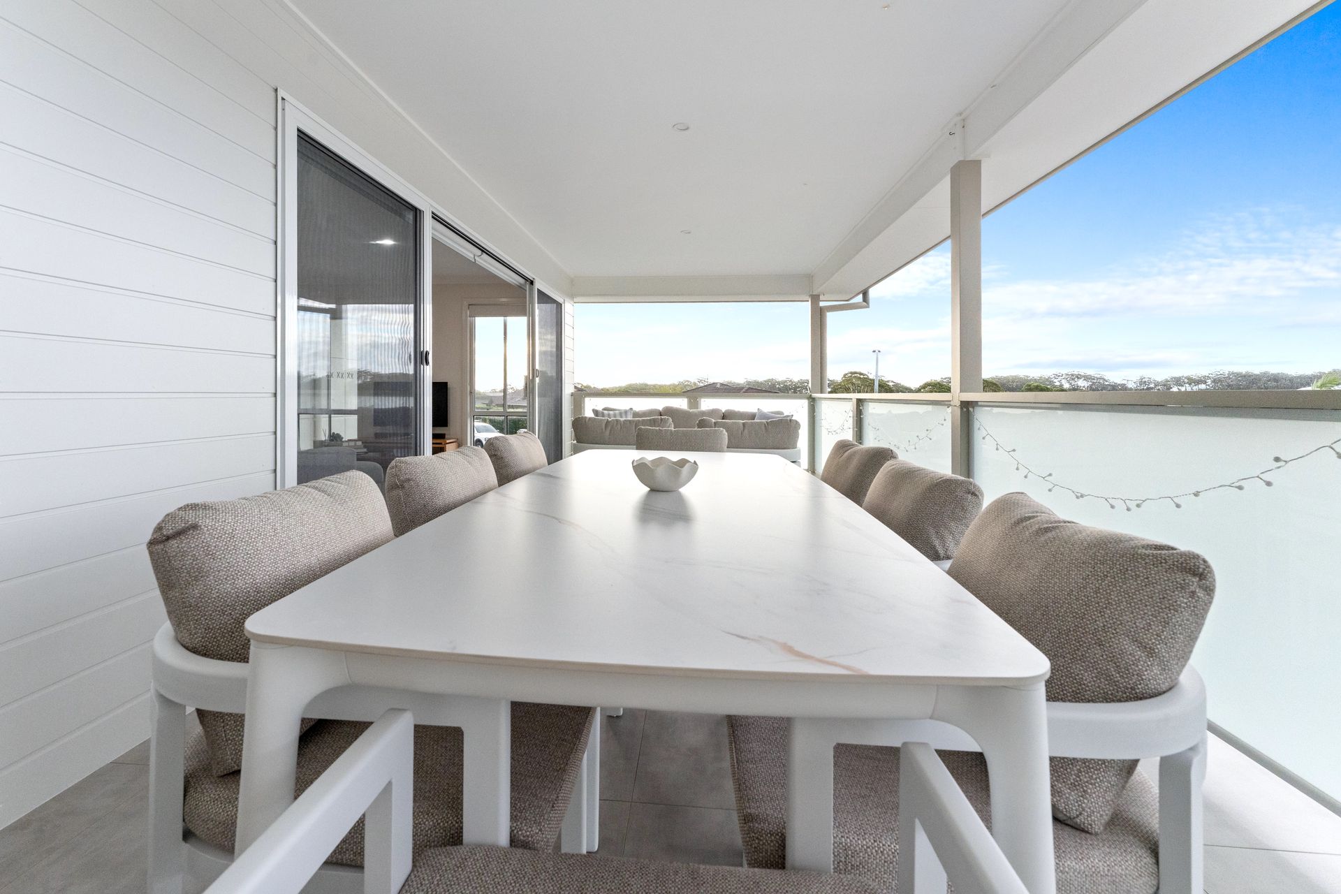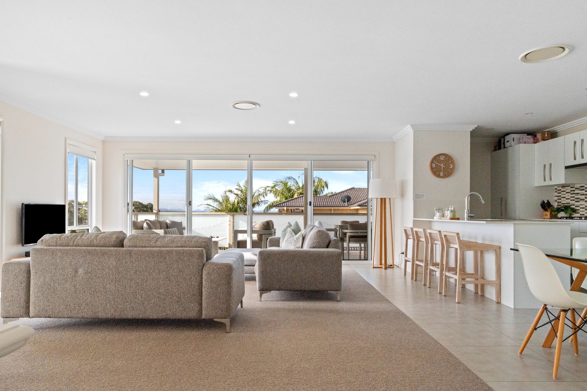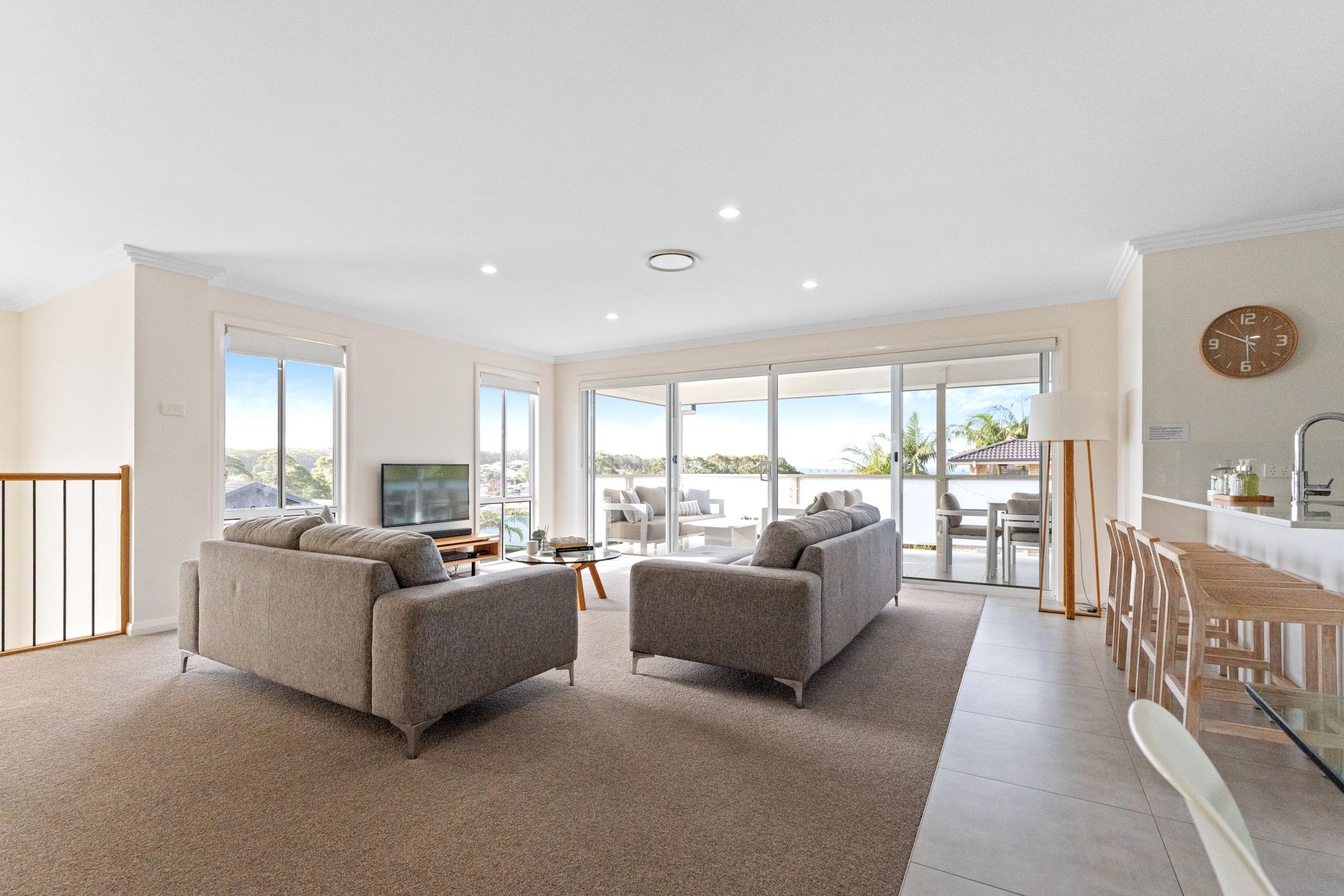 The House - You will not be disappointed when staying at this beautifully designed and appointed home. From the state of the art kitchen space to the impeccable bathrooms, offering plenty of room for the whole family. The property features a spacious living & dining area that joins the kitchen on the first floor, combining to provide a large open plan space that leads to a private undercover balcony with tasteful outdoor furnishings. From the balcony you can enjoy the views of the water and beyond to the mountains in the distance. The house is fitted with down lights and ducted air conditioning throughout. The sitting area is carpeted with a modern lounge suite, flat screen TV and a study zone. The modern fully equipped kitchen comes fitted with wall oven, gas stove top, microwave, fridge/freezer and dishwasher plus bar stools at the kitchen bench. The dining area provides a glass table and stylish bucket chairs. Continuing on the first floor is the main bathroom with a free standing bath, glass shower, double vanity with the toilet located separately. The laundry is next door to the bathroom which then leads out to an open deck which houses the BBQ and a clothes line.