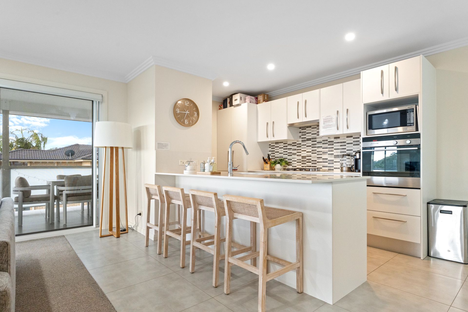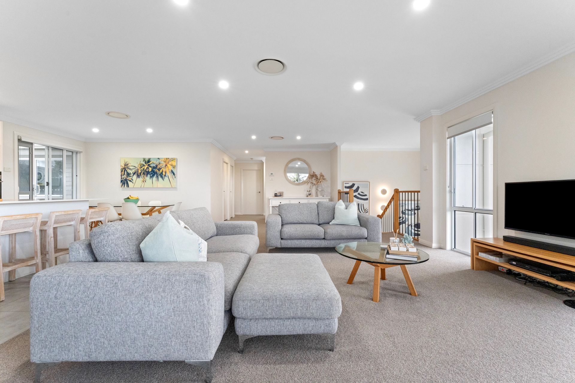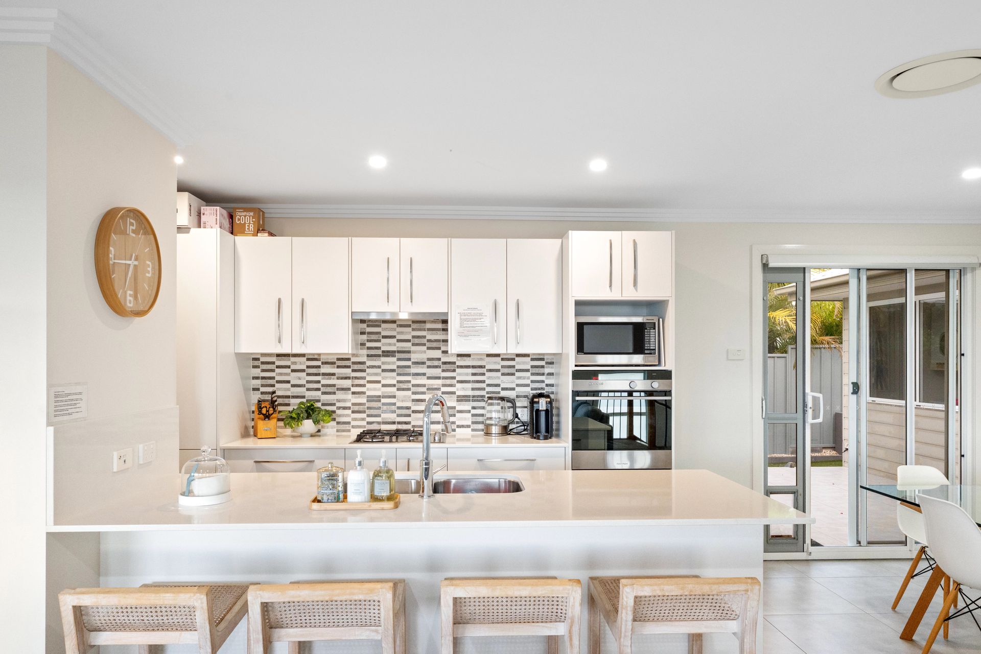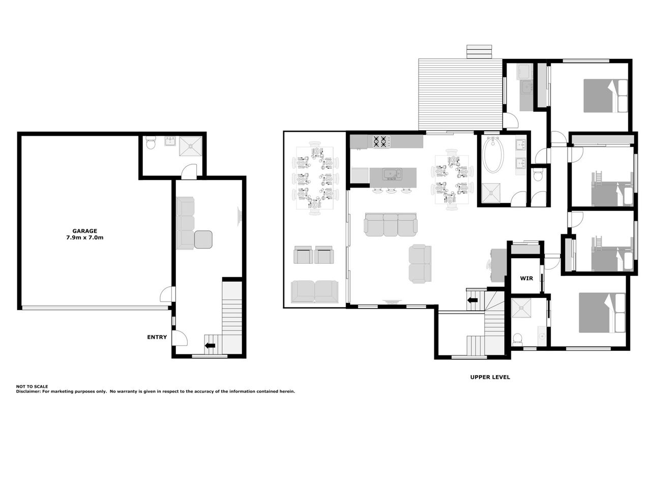 The House - You will not be disappointed when staying at this beautifully designed and appointed home. From the state of the art kitchen space to the impeccable bathrooms, offering plenty of room for the whole family. The property features a spacious living & dining area that joins the kitchen on the first floor, combining to provide a large open plan space that leads to a private undercover balcony with tasteful outdoor furnishings. From the balcony you can enjoy the views of the water and beyond to the mountains in the distance. The house is fitted with down lights and ducted air conditioning throughout. The sitting area is carpeted with a modern lounge suite, flat screen TV and a study zone. The modern fully equipped kitchen comes fitted with wall oven, gas stove top, microwave, fridge/freezer and dishwasher plus bar stools at the kitchen bench. The dining area provides a glass table and stylish bucket chairs. Continuing on the first floor is the main bathroom with a free standing bath, glass shower, double vanity with the toilet located separately. The laundry is next door to the bathroom which then leads out to an open deck which houses the BBQ and a clothes line.