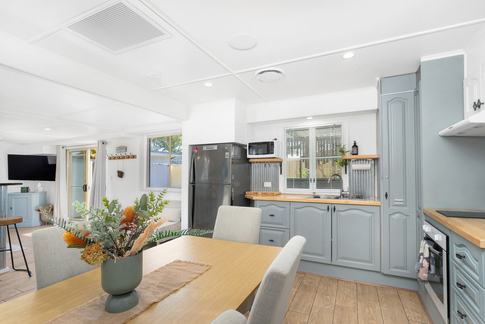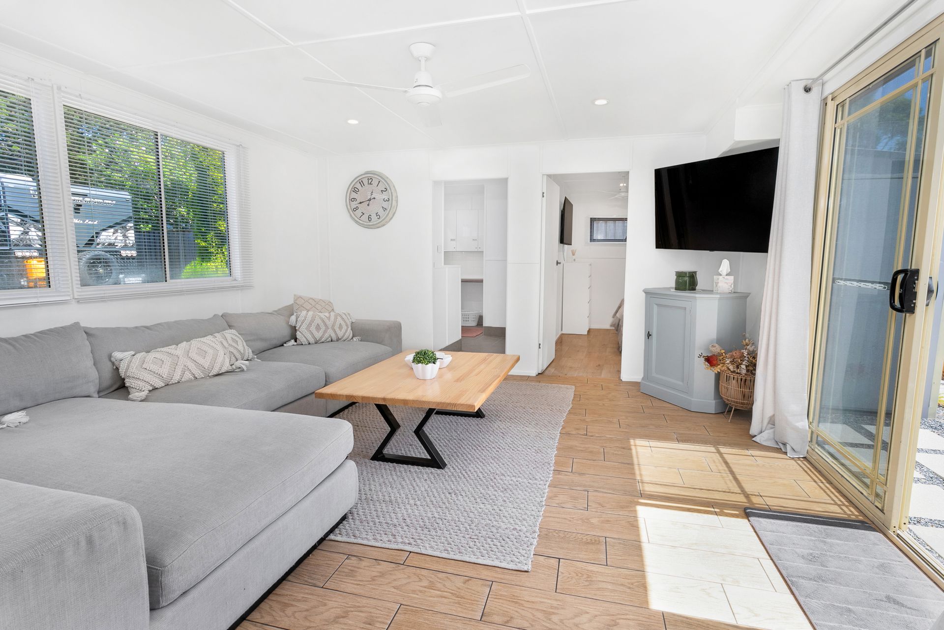 Spacious open-plan layout with a comfortable lounge area featuring a Smart TV