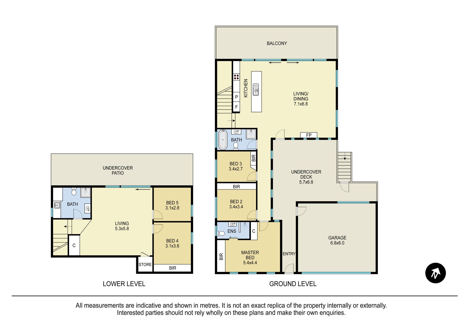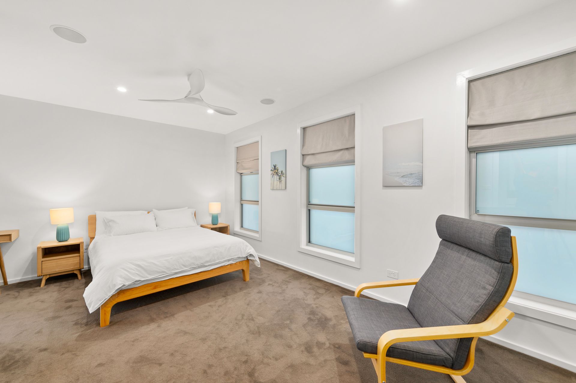 Enter on the top floor through a private undercover area with an outdoor lounge, to open plan living that flows out to the expansive north-facing balcony with gas BBQ, outdoor lounge and dining, and panoramic views over the surrounding area and across the water. The living area includes a fireplace, TV, Bluetooth sound system with surround sound and Wi-Fi, plus an 8-seater dining table, and the fully equipped kitchen includes a dishwasher, coffee machine and fridge with ice maker. This floor has 3 bedrooms, all with ceiling fans and built-in robes. Two bedrooms each have a queen bed, one of which also has a desk and ensuite bathroom with shower and toilet, and the third bedroom has 2 single beds. There is also a luxe bathroom with bathtub, shower and toilet.