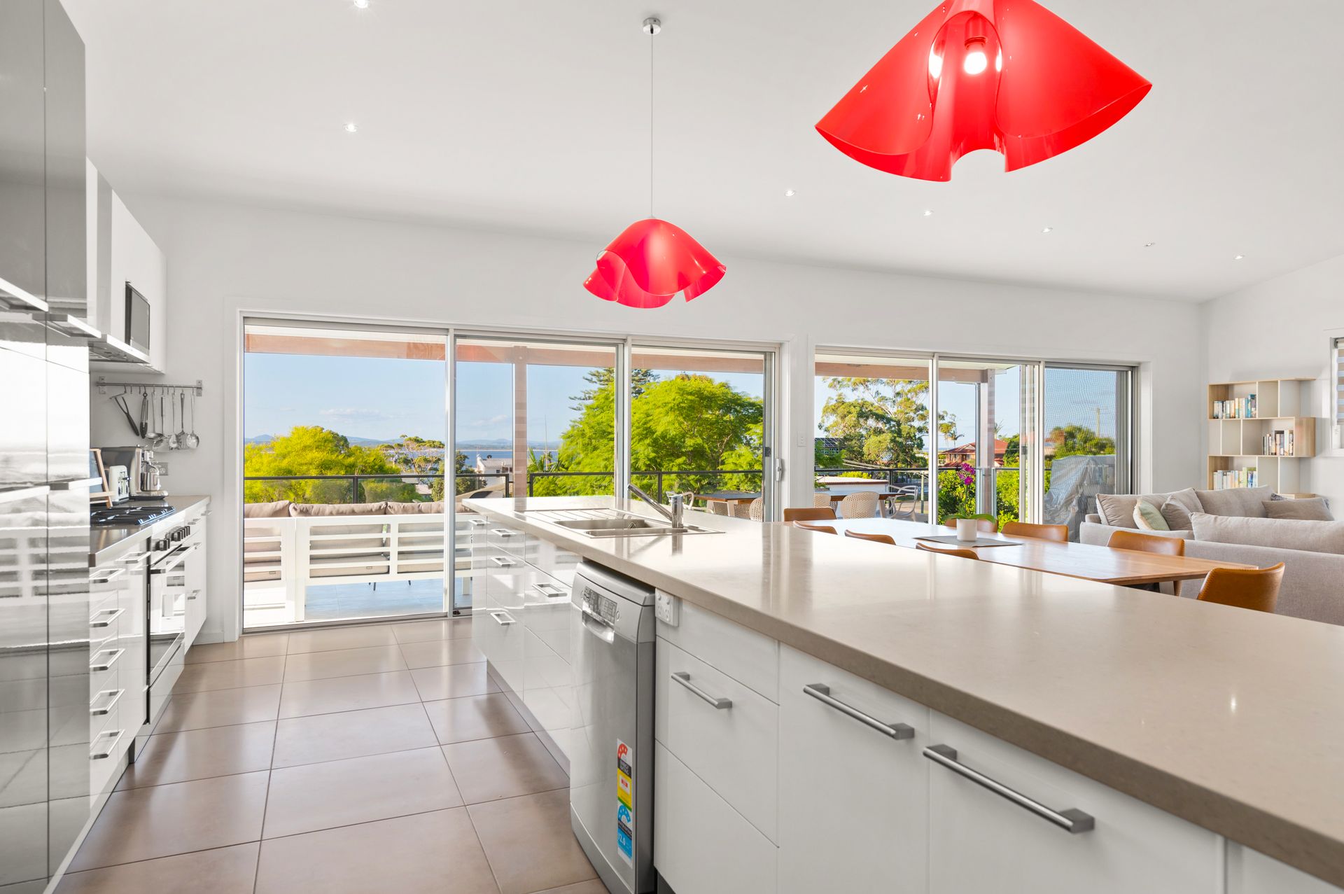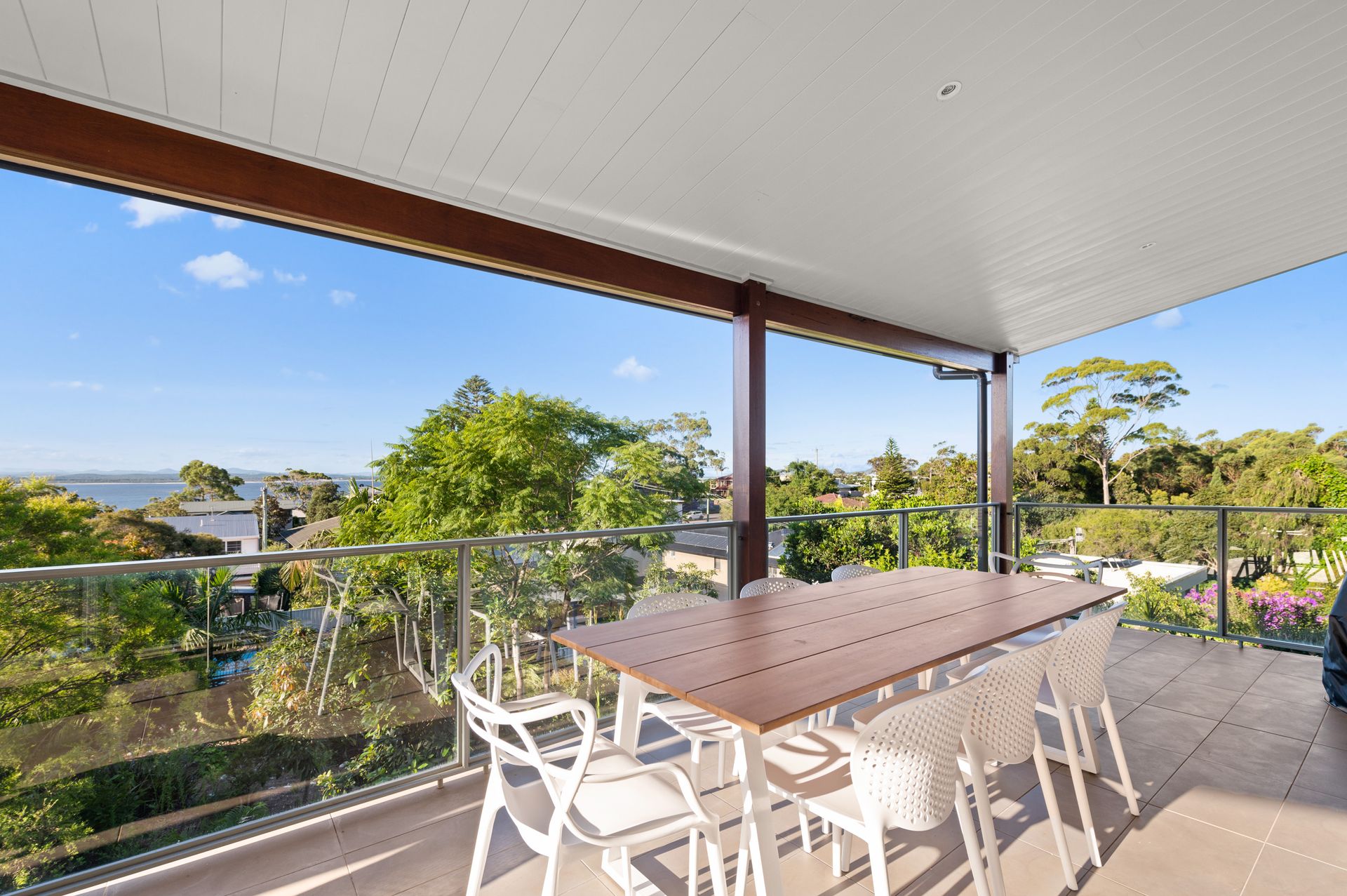 This contemporary, 2-storey holiday home with fantastic water views is the epitome of a dream coastal getaway for the whole family – including the furry family member! Just a 450m stroll takes you to Bagnalls Beach and you can follow the coast or cycle path to Dutchies Beach, which is very popular with families for its calm swimming waters and picturesque location. Both offer a playground and reserve with BBQ and picnic facilities. Further along the scenic coastline, or just over 1km more direct stroll from the house, is the heart of Nelson Bay and the d'Albora Marina. Head out on a dolphin or whale watch cruise, do some boutique shopping, enjoy drinks overlooking the water or dine at one of the award-winning restaurants.