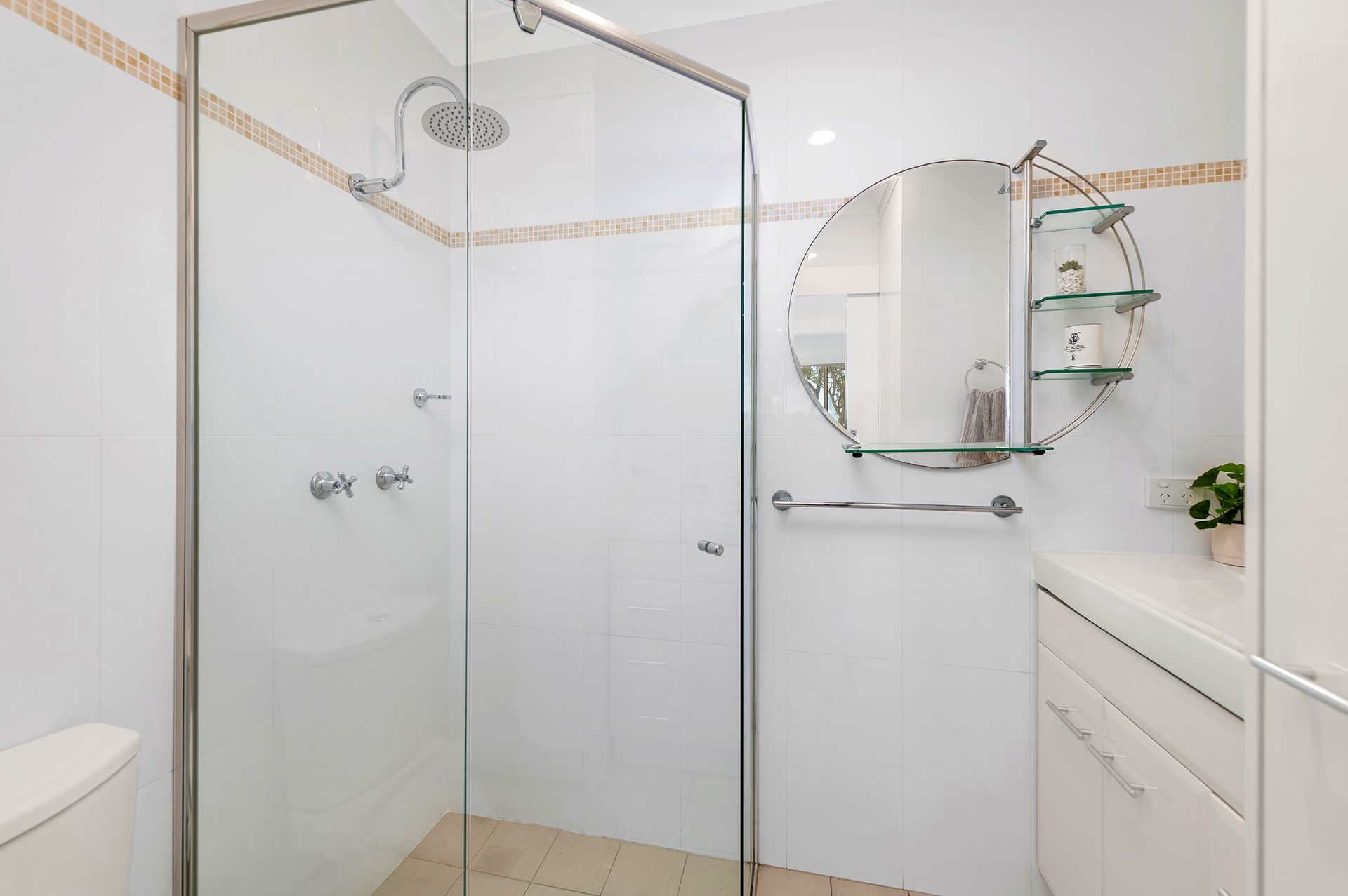 Bathroom 1 has a shower and a toilet.