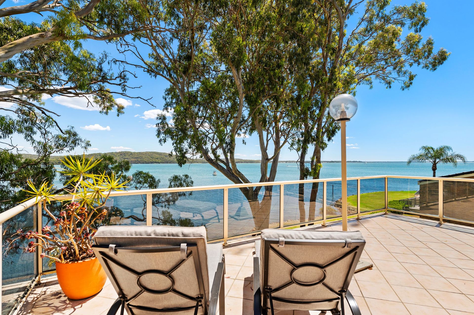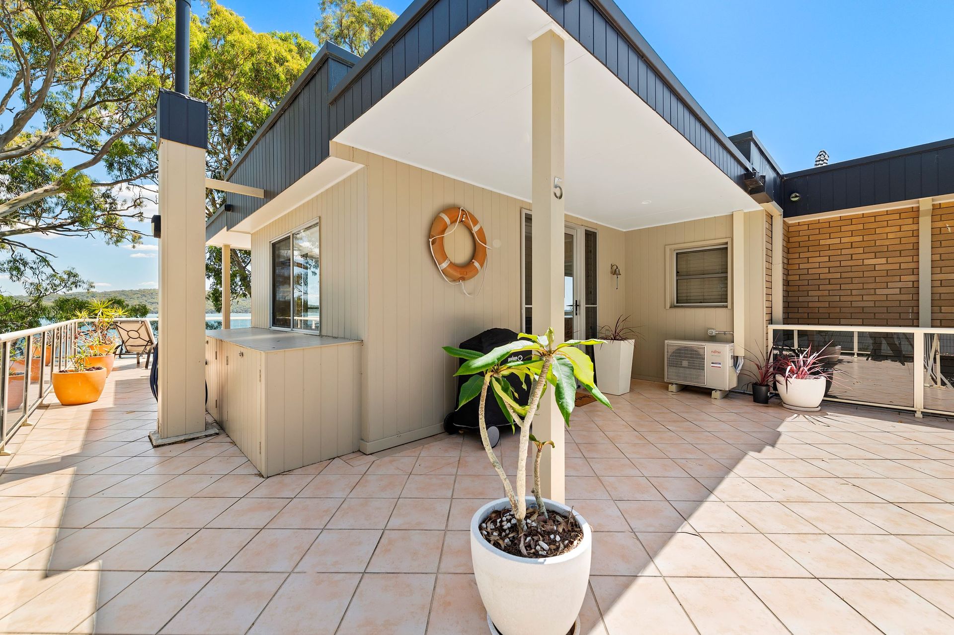 Upstairs, there's a large wraparound balcony with 180-degree sweeping water views. It has long tables and chairs, perfect for a sunny brunch after swimming or a cosy dinner at night with the chilly breeze. There are also lounge chairs when you want to soak up the sun and the views. There's even a smaller coffee table area, perfect when you just want to enjoy your morning.